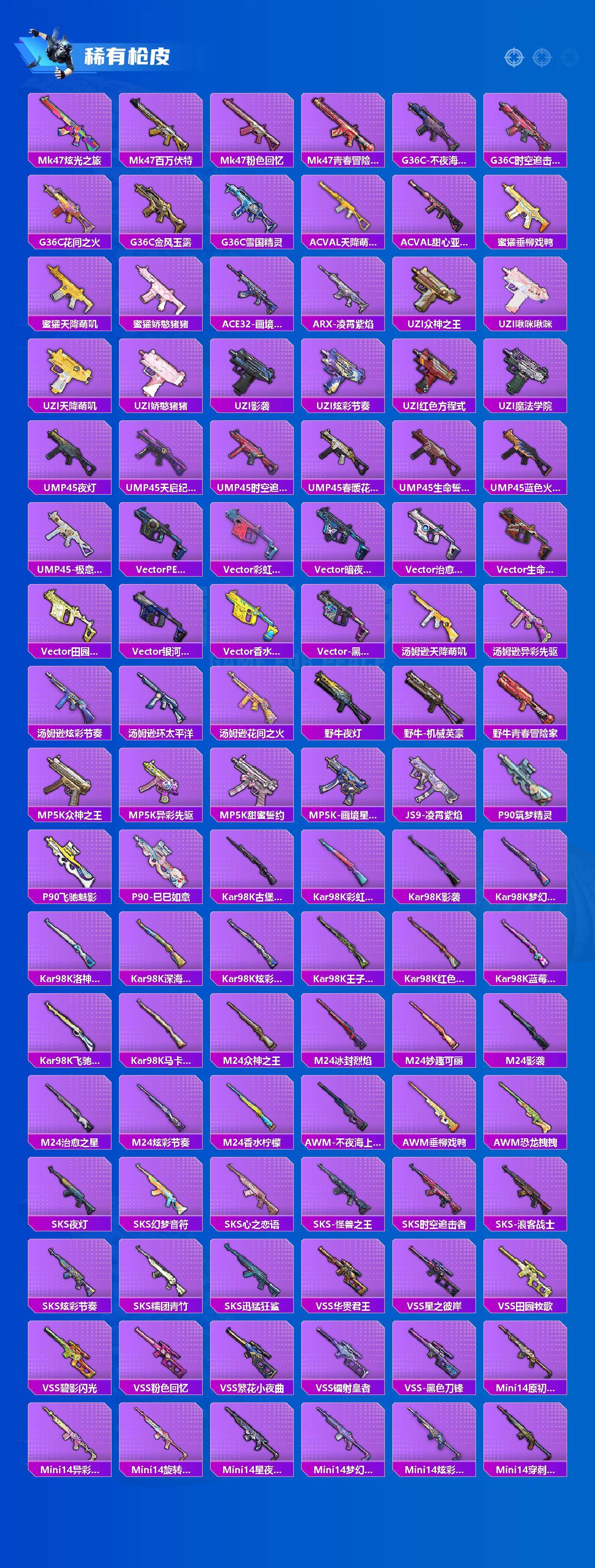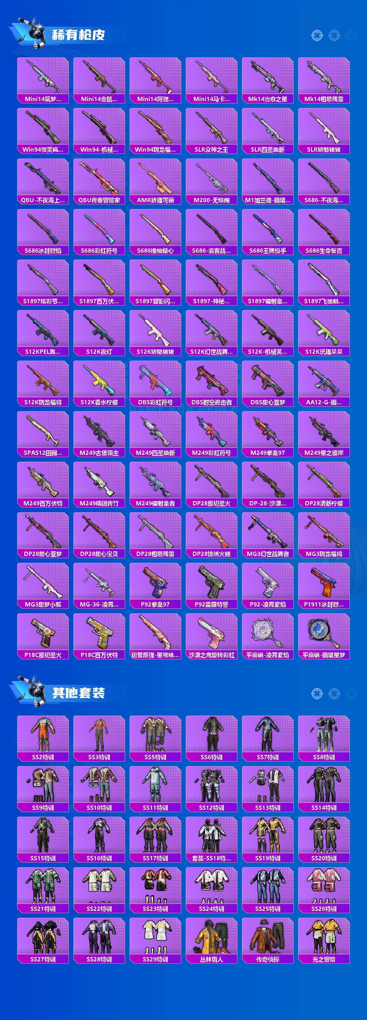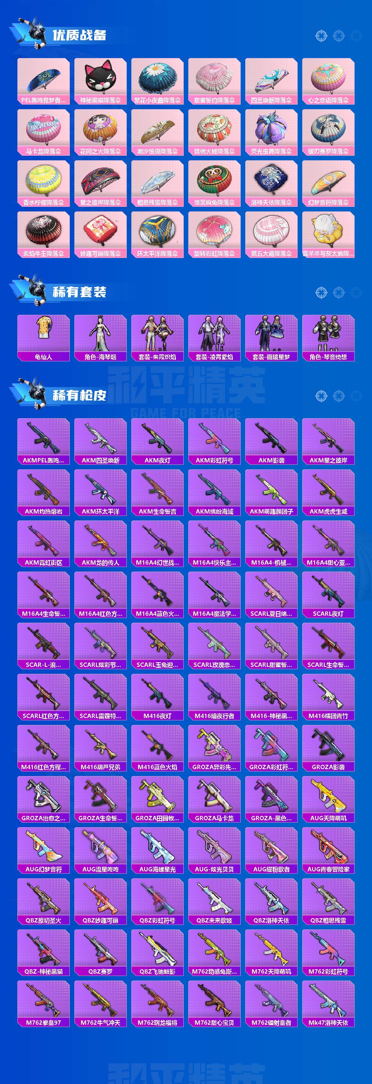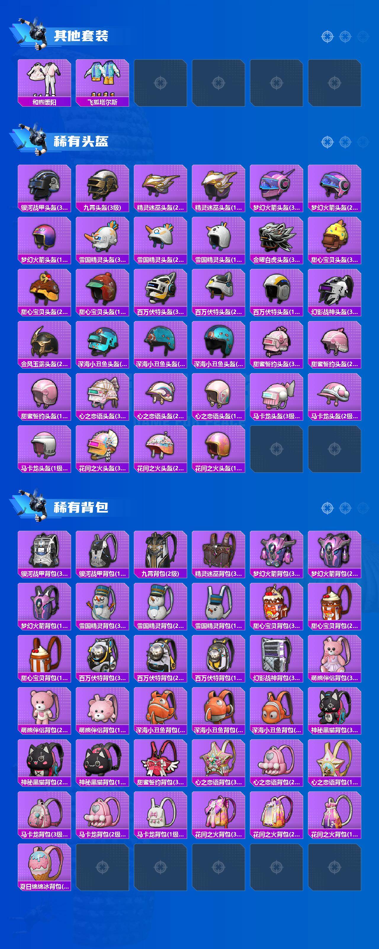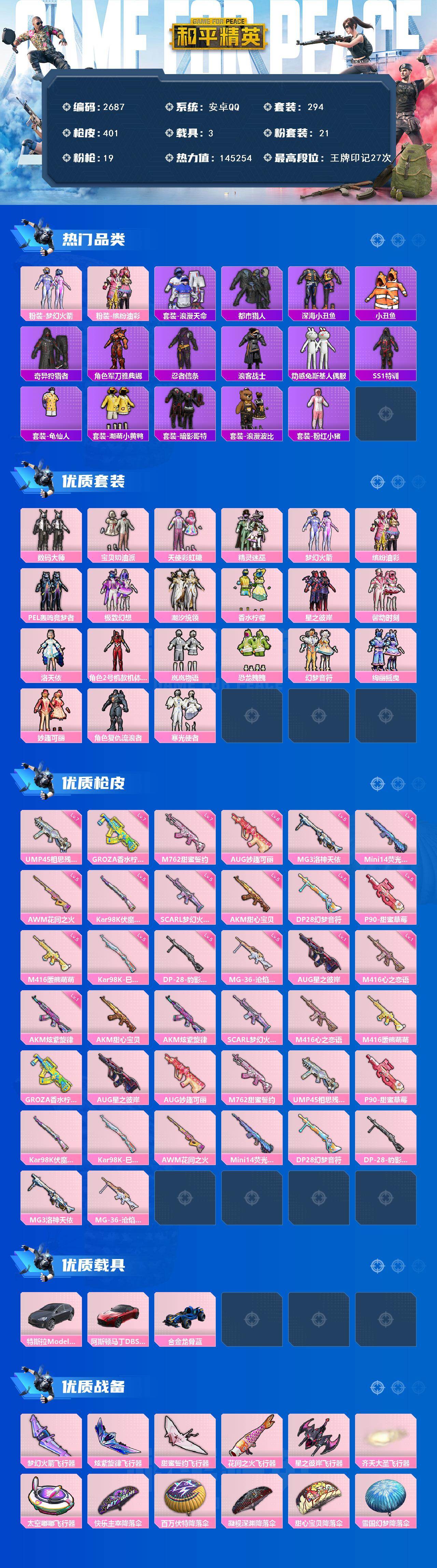 3载具-294套装-401呛皮-294套装/呛械19/装备502/载具3/战备269/王牌印记27/热力值/五级akm-甜心宝贝/akm-炫紫旋律/五级scar-l-梦幻火箭/m416-心之恋语/五级m416-暖熊萌萌/七级groza-香水柠檬/aug-星之彼岸/六级aug-妙趣可丽/七级m762-甜蜜誓约/七级ump45-相思残雪/五级p90-甜蜜草莓/五级kar98k-伏魔团/五级kar98k-巳巳如意/五级