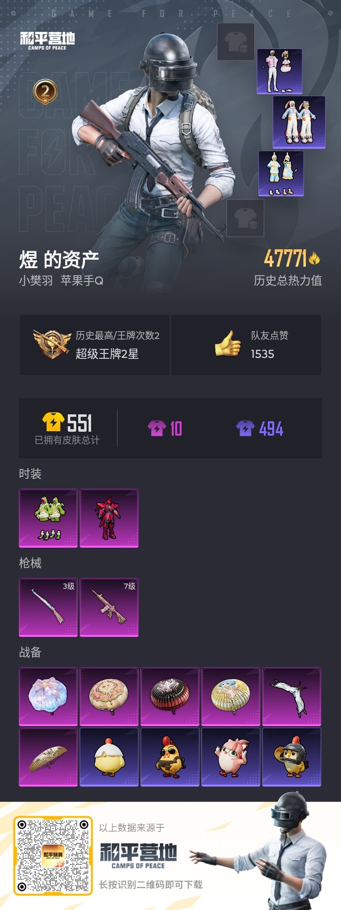 【和平精英】【txhp5530】2粉装,2特效呛,0载具,历史最高段位:超级王牌2星 王牌印记2次 热力值:47771,136套装,144呛械,160装备,88战备;套装:套装-炙焰赤龙,套装-恐龙拽拽,套装-青年教官,套装-黄色伏地魔,套装-白色伏地魔,套装-黑色伏地魔,套装-骑行爱好者,套装-冰川格斗者,套装-壁垒格斗者,套装-深海格斗者,套装-竞技名士,套装-湖蓝色名流,套装-猛禽,套装-长空猛禽,套装-漫步者,套装-竞技勇士朋克,套装-蓝色守护者,套装-雨林探路者,套装-沙漠探路者,套装-六六大吉,套装-冷焰舞者,套装-灼焰舞者,套装-特战装甲,套装-战地督导,套装-突袭者,套装-青春校园,套装-灰色格斗者,套装-甜蜜告白,套装-迎春赐吉,套装-龙腾端午,套装-燃烧卡路里,套装-滨海假日,套装-沙漠毒蛇,套装-冰冻风暴,套装-完美偶像,套装-摇滚舞王,套装-街头潮人,套装-蓝彩潮人,套装-怒火燎原,套装-魅力单车,套装-绮丽涂鸦,套装-耀眼新星,套装-雪山征服者,套装-朋克治安官,套装-都市漫游者,套装-野性战心,套装-野性战魂,套装-破晓战魂,套装-都市魅力,套装-荣耀,套装-风行保卫者,套装-热血青春,套装-沙漠兵团,套装-雪山精英,套装-幻世战舞者,套装-蓝调潮人,套装-甜蜜熊情侣,套装-缤纷果语,套装-冰川特警,套装-元素星魂,套装-格斗先锋,套装-疯狂小兔子,套装-ss5特训,套装-圣诞大吉,套装-冰原使者,套装-凛冬战士,套装-金鼠迎春,套装-北国孤狼,套装-ss6特训,套装-跃动心情,套装-ss7特训,套装-鹤鸣,套装-霓虹街区,套装-ss10特训,套装-ss8特训,套装-萌黄之夏,套装-夏日音浪,套装-ss9特训,套装-薄荷蓝莓,套装-探宝勇士,套装-辉星之火,套装-牛气满满,套装-白糯汤圆,套装-ss11特训,套装-青春冒险家,套装-潮流游乐家,套装-原初圣火,套装-逆风勇士,套装-萌趣颜团子,套装-战术大师,套装-ss12特训,套装-ss18特训,套装-镭射皇者,套装-银白舞王,套装-耀粉歌者,套装-飞行日记,套装-ss13特训,套装-ss14特训,套装-吉莉礼服,套装-快乐星愿,套装-ss15特训,套装-ss16特训,套装-暴风机械师,套装-时空追击者,套装-暗夜魅影,套装-ss17特训,套装-瑞龙福将,套装-团圆交子,套装-福星高照,套装-异彩先驱,套装-霓虹极客,套装-空投萌叽,套装-ss19特训,套装-兔兔白日梦,套装-飞驰魅影,套装-音速流光,套装-炫蓝之夏,套装-ss20特训,套装-覆海蛟龙,套装-甜心亚梦,套装-虚音幻奏,套装-ss21特训,套装-ss22特训,套装-柠萌假日,套装-青玉碎影,套装-ss28特训,套装-海盐绵绵冰,套装-ss31特训,套装-ss33特训,套装-云朵鹅,套装-ss32特训,套装-彩虹兔,套装-雪绒豹,角色-时希公主,套装-蜜露汐语,套装-ss34特训;呛皮:m762-牛气冲天,m762-镭射皇者,m762-烈焰拳霸,m762-瑞龙福将,m762-云朵鹅,m762-乌木金纹,akm-生命誓言,akm-破晓战魂,akm-霓虹街区,akm-夜灯,akm-彩虹符号,akm-萌趣颜团子,akm-虎虎生威,akm-筑梦精灵,akm-乌木金纹,famas-乌木金纹,groza-梨园星光,groza-异彩先驱,groza-乌木金纹,m16a4-蓝色火焰,m16a4-红色方程式,m16a4-夜灯,m16a4-甜心亚梦,m16a4-幻世战舞者,7级m416-心之恋语,m416-夜灯,m416-蓝色火焰,m416-红色方程式,m416-潮汐统领,m416-乌木金纹,q-原初圣火,q-飞驰魅影,q-乌木金纹,mk47-青春冒险家,mk47-乌木金纹,g36c-时空追击者,g36c-乌木金纹,蜜獾-天降萌叽,蜜獾-乌木金纹,scar-l-红色方程式,scar-l-炫彩节奏,scar-l-海盐豹豹,scar-l-冷漠罗丽,aug-幻影战神,aug-耀粉歌者,aug-青春冒险家,aug-天降萌叽,aug-乌木金纹,ac-val-甜心亚梦,svd-冷漠罗丽,svd-云朵鹅,m24-奇异狩猎者,m24-冰封烈焰,m24-炫彩节奏,m24-乌木金纹,3级kar98k-巳巳如意,kar98k-红色方程式,kar98k-彩虹符号,kar98k-欢乐麻酱,kar98k-飞驰魅影,kar98k-乌木金纹,m200-乌木金纹,awm-不夜海上花,awm-乌木金纹,win94-瑞龙福将,莫辛纳甘-乌木金纹,qbu-青春冒险家,vss-镭射皇者,vss-乌木金纹,mini14-金鼠迎春,mini14-原初圣火,mini14-炫彩节奏,mini14-耀粉歌者,mini14-异彩先驱,sks-夜灯,sks-时空追击者,mk14-乌木金纹,p90-飞驰魅影,p90-筑梦精灵,p90-闪光银龙,mp5k-异彩先驱,mp5k-乌木金纹,汤姆逊-耀粉歌者,汤姆逊-炫彩节奏,汤姆逊-异彩先驱,汤姆逊-乌木金纹,vect-生命誓言,vect-彩虹符号,vect-乌木金纹,野牛-青春冒险家,野牛-乌木金纹,uzi-红色方程式,uzi-炫彩节奏,uzi-烈焰拳霸,ump45-蓝色火焰,ump45-生命誓言,ump45-粉色回忆,ump45-时空追击者,aks-74u-乌木金纹,s1897-镭射皇者,s1897-飞驰魅影,s1897-乌木金纹,s686-红色方程式,s686-冰封烈焰,dbs-时空追击者,dbs-暗星紫秘,dbs-甜心亚梦,dbs-荧海星豚,dbs-乌木金纹,spas-12-云朵鹅,s12k-破晓战魂,s12k-瑞龙福将,s12k-乌木金纹,m249-破晓战魂,m249-镭射皇者,m249-糯团青竹,m249-乌木金纹,mg3-瑞龙福将,mg3-幻世战舞者,mg3-乌木金纹,dp-28-原初圣火,dp-28-彩虹符号,dp-28-甜心亚梦,dp-28-乌木金纹,沙墨之鹦-云朵鹅,p1911-冰封烈焰,p18c-百万伏特,p18c-原初圣火,平底锅-冰封烈焰,平底锅-原初圣火,平底锅-镭射皇者,平底锅-飞行日记,平底锅-青春冒险家,平底锅-时空追击者,平底锅-瑞龙福将,平底锅-异彩先驱,平底锅-飞驰魅影,平底锅-甜心亚梦,大砍刀-云朵鹅,撬棍-绯红前夜,撬棍-冷漠罗丽,十子怒-异域银装,盐雾蛋-冰氧夏日,破片手留单-萌趣颜团子;降落伞:天之羽翼飞行器,粉色滑翔尾迹,红色滑翔尾迹; 详情看图【和平精英】【txhp5530】2粉装,2特效呛,0载具,历史最高段位:超级王牌2星 王牌印记2次 热力值:47771,136套装,144呛械,160装备,88战备;套装:套装-炙焰赤龙,套装-恐龙拽拽,套装-青年教官,套装-黄色伏