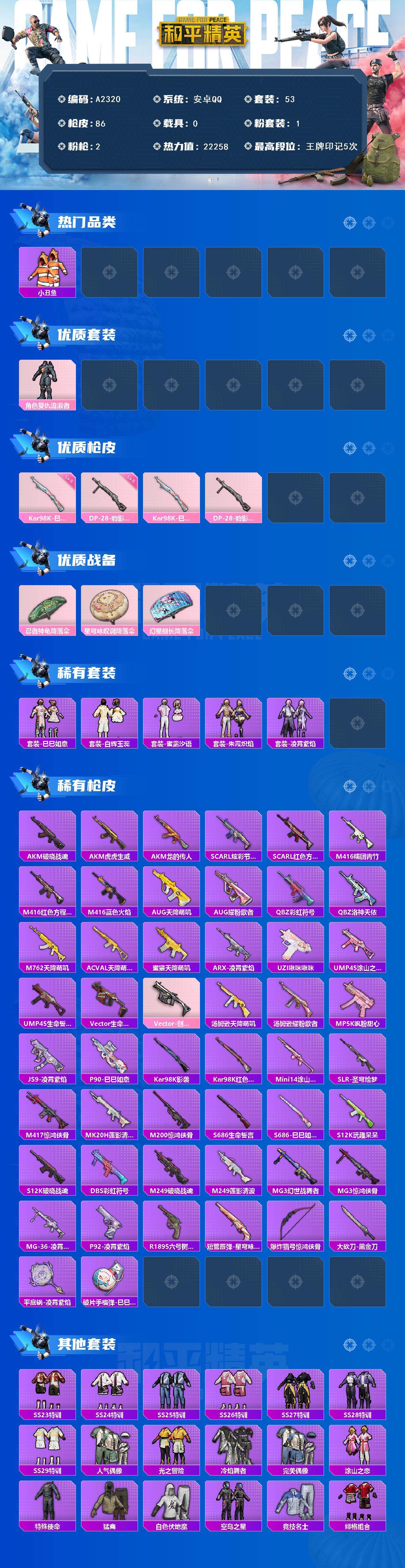 [15922613]安卓 【小号 1粉装-2特效呛】手q-1粉装-2特效呛-0载具-0粉色飞行器-22258热力值-5王牌印记-53套装-86呛皮 【热门品类】:套装-小丑鱼,套装-龟仙人 【粉色套装】:角色-复仇流浪者 【粉色呛皮等级】:kar98k-巳巳如意五级,dp-28-豹影疾电五级 【粉色呛皮】:kar98k-巳巳如意,dp-28-豹影疾电 【粉色降落伞】:忍者神龟降落伞,星穹咏叹调降落伞,幻星舰长降落伞,炫彩糖果降落伞 【稀有套装】:套装-龟仙人,套装-巳巳如意,套装-白辉玉蕊,套装-蜜露汐语,套装-朱霞炽焰,套装-凌霄紫焰 【稀有呛皮】:akm-破晓战魂,akm-虎虎生威,akm-龙的传人,scar-l-炫彩节奏,scar-l-红色方程式,m416-糯团青竹,m416-红色方程式,m416-蓝色火焰,aug-天降萌叽,aug-耀粉歌者,q-彩虹符号,q-洛神天依,m762-天降萌叽,ac-val-天降萌叽,蜜獾-天降萌叽,arx-凌霄紫焰,uzi-啾咪啾咪,ump45-涂山之恋,ump45-生命誓言,vect-生命誓言,vect-创世·救赎,汤姆逊-天降萌叽,汤姆逊-耀粉歌者,mp5k-飒粉甜心,js9-凌霄紫焰,p90-巳巳如意,kar98k-影袭,kar98k-红色方程式,mini14-涂山之恋,slr-圣穹绘梦,m417-惊鸿侠骨,mk20-h-莲影清波,m200-惊鸿侠骨,s686-生命誓言,s686-巳巳如意,s12k-玩趣呆呆,s12k-破晓战魂,dbs-彩虹符号,m249-破晓战魂,m249-莲影清波,mg3-幻世战舞者,mg3-惊鸿侠骨,mg-36-凌霄紫焰,p92-凌霄紫焰,r1895-六号树人,短管霰弹-星穹咏叹调,爆炸猎弓-惊鸿侠骨,大砍刀-黑金刀,平底锅-凌霄紫焰,破片手留单-巳巳如意 【其他套装】:套装-ss23特训,套装-ss24特训,套装-ss25特训,套装-ss26特训,套装-ss27特训,套装-ss28特训,套装-ss29特训,套装-人气偶像,套装-光之冒险,套装-冷焰舞者,套装-完美偶像,套装-涂山之恋,套装-特殊使命,套装-猛禽,套装-白色伏地魔,套装-空岛之星,套装-竞技名士,套装-绯格组合,套装-缤纷果语,套装-长空猛禽,套装-青涩时光,套装-青玉碎影,套装-魅力单车,套装-鹤鸣,套装-龙的传人,套装-龟