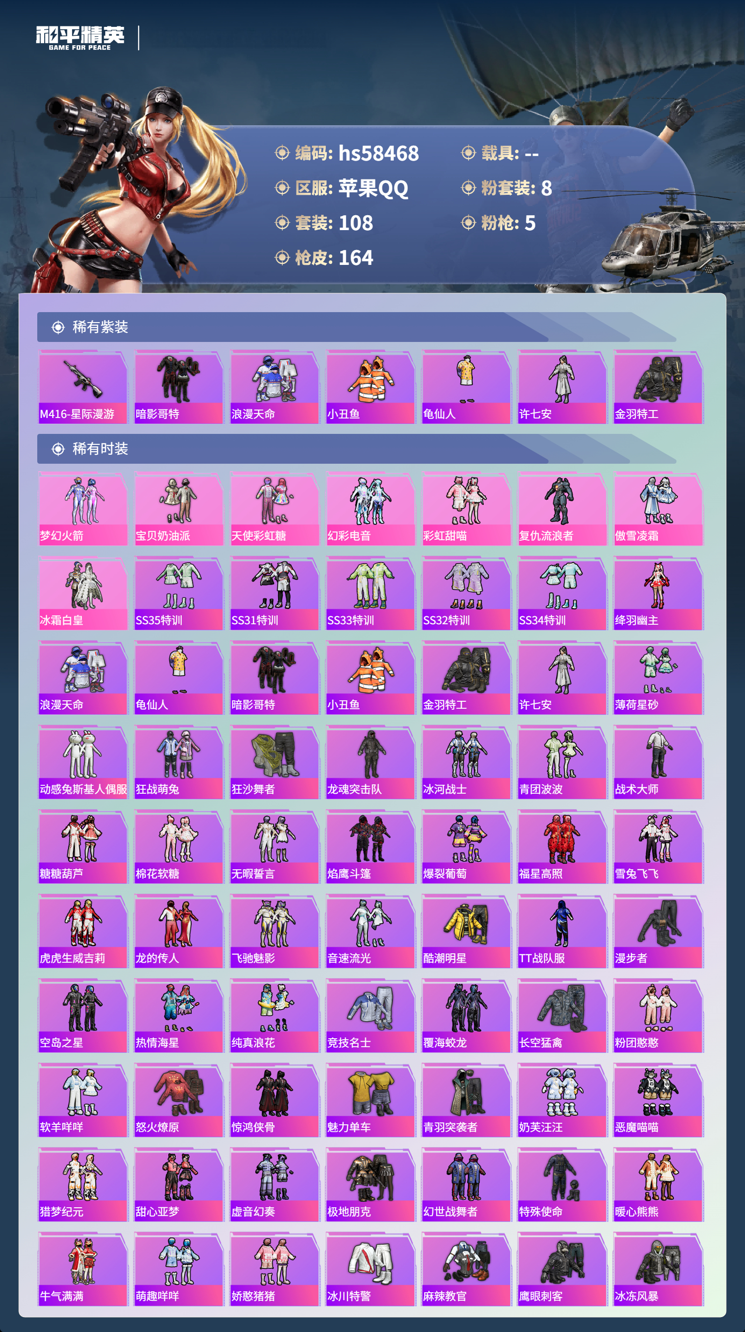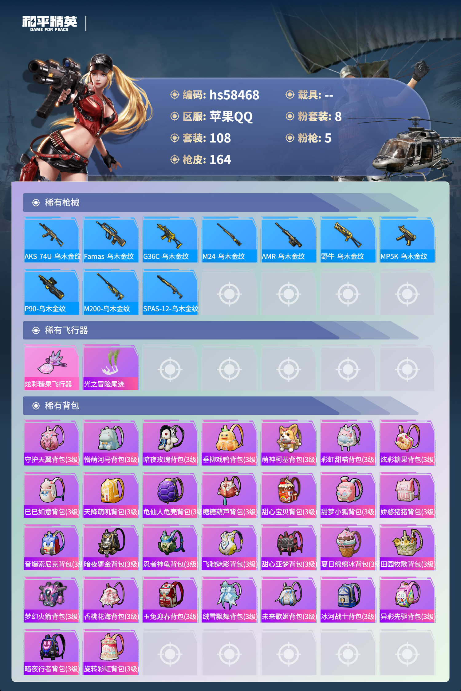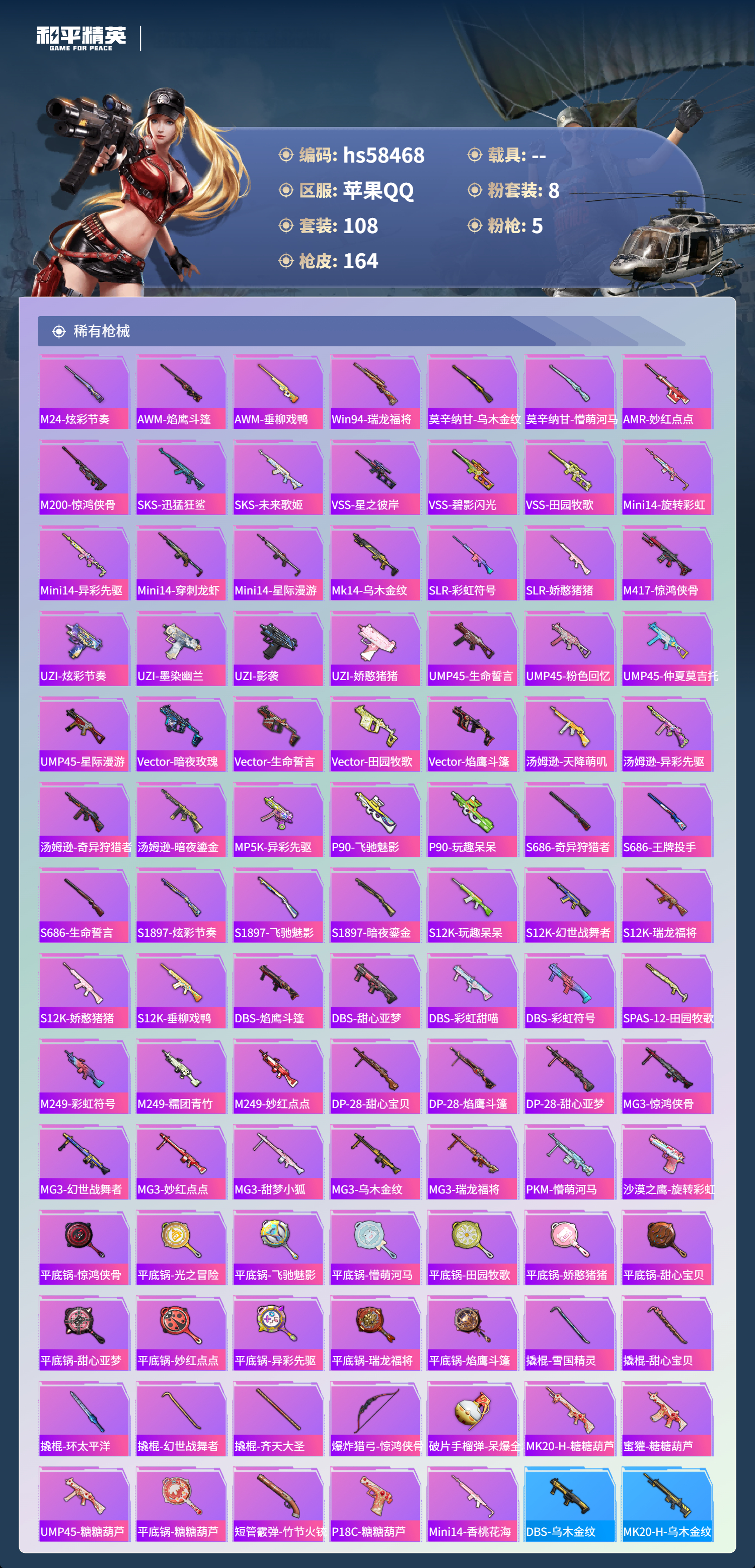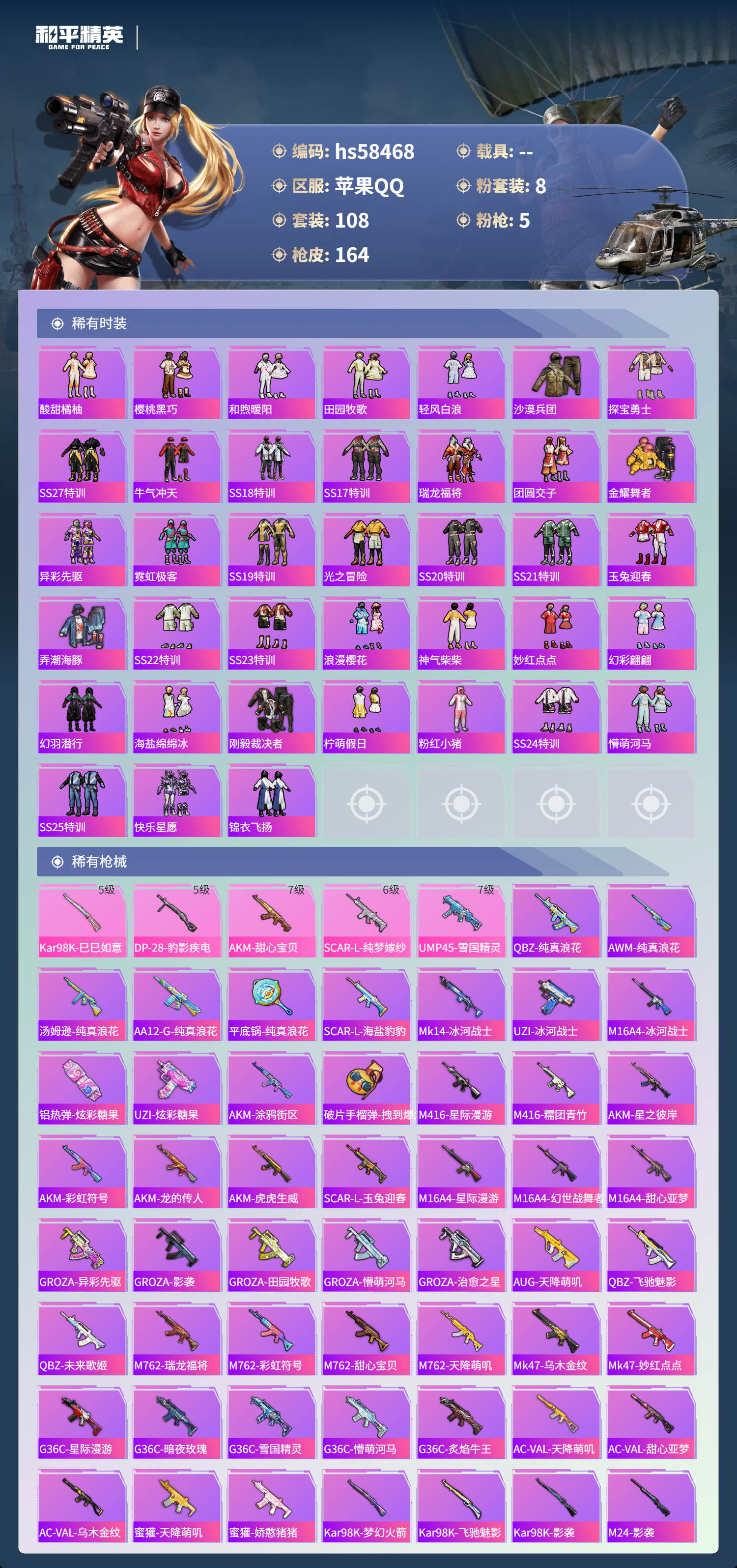 0载具-108套装-164呛皮-hs58468 苹果手q-20王牌印记-有战神框-8粉装-5特效呛-53411热力值-108套装-164呛皮-2卓越印记-1传奇印记【8粉装】角色-复仇流浪者套装-天使彩虹糖套装-宝贝奶油派套装-梦幻火箭套装-傲雪凌霜套装-彩虹甜喵套装-冰霜白皇套装-幻彩电音【5特效呛】dp-28-豹影疾电/5级kar98k-巳巳如意/5级ump45-雪国精灵/7级akm-甜心宝贝/7级