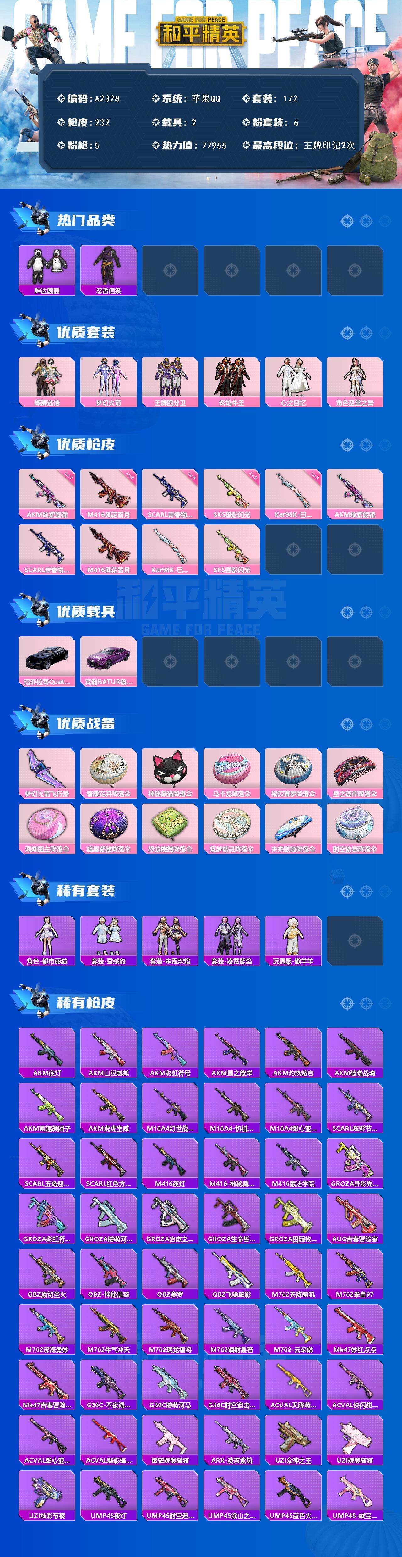 [15924691]苹果【男神号 粉装-梦幻火箭/akm-炫紫旋律七级/玛莎拉蒂quattropte(夜幕蓝)/宾利batur(极速紫)】 手q-6粉装-5特效呛-2载具-2粉色飞行器-77955热力值-2王牌印记-172套装-232呛皮 【热门品类】:粉装-梦幻火箭,套装-浪漫天命,套装-深海小丑鱼,套装-奇异狩猎者,套装-胖达圆圆,套装-忍者信条,套装-龟仙人,套装-潮萌小黄鸭 【粉色套装】:粉装-蝶舞迷情,粉装-梦幻火箭,粉装-王牌四分卫,粉装-炙焰牛王,粉装-心之回忆,角色-圣堂之誓 【粉色呛皮等级】:akm-炫紫旋律七级,scar-l-青春物语五级,m416-风花雪月六级,kar98k-巳巳如意三级,sks-碧影闪光五级 【粉色载具】:玛莎拉蒂quattropte(夜幕蓝),宾利batur(极速紫) 【粉色呛皮】:akm-炫紫旋律,scar-l-青春物语,m416-风花雪月,kar98k-巳巳如意,sks-碧影闪光 【粉色飞行器】:梦幻火箭飞行器 【粉色降落伞】:春暖花开降落伞,神秘黑猫降落伞,马卡龙降落伞,银刃赛罗降落伞,星之彼岸降落伞,海渊国主降落伞,暗星紫秘降落伞,恐龙拽拽降落伞,筑梦精灵降落伞,未来歌姬降落伞,时空协奏降落伞,炫彩糖果降落伞 【稀有套装】:套装-龟仙人,角色-都市丽猫,套装-雪绒豹,套装-朱霞炽焰,套装-凌霄紫焰,玩偶服-懒羊羊,套装-炫彩糖果 【稀有呛皮】:aug-冰晶雪宝,akm-夜灯,akm-山经魅狐,akm-彩虹符号,akm-星之彼岸,akm-灼热熔岩,akm-破晓战魂,akm-萌趣颜团子,akm-虎虎生威,m16a4-幻世战舞者,m16a4-机械英豪,m16a4-甜心亚梦,scar-l-炫彩节奏,scar-l-玉兔迎春,scar-l-红色方程式,m416-夜灯,m416-神秘黑猫,m416-魔法学院,groza-异彩先驱,groza-彩虹符号,groza-懵萌河马,groza-治愈之星,groza-生命誓言,groza-田园牧歌,aug-青春冒险家,q-原初圣火,q-神秘黑猫,q-赛罗,q-飞驰魅影,m762-天降萌叽,m762-拳皇97,m762-深海曼妙,m762-牛气冲天,m762-瑞龙福将,m762-镭射皇者,m762-云朵鹅,mk47-妙红点点,mk47-青春冒险家,g36c-不夜海