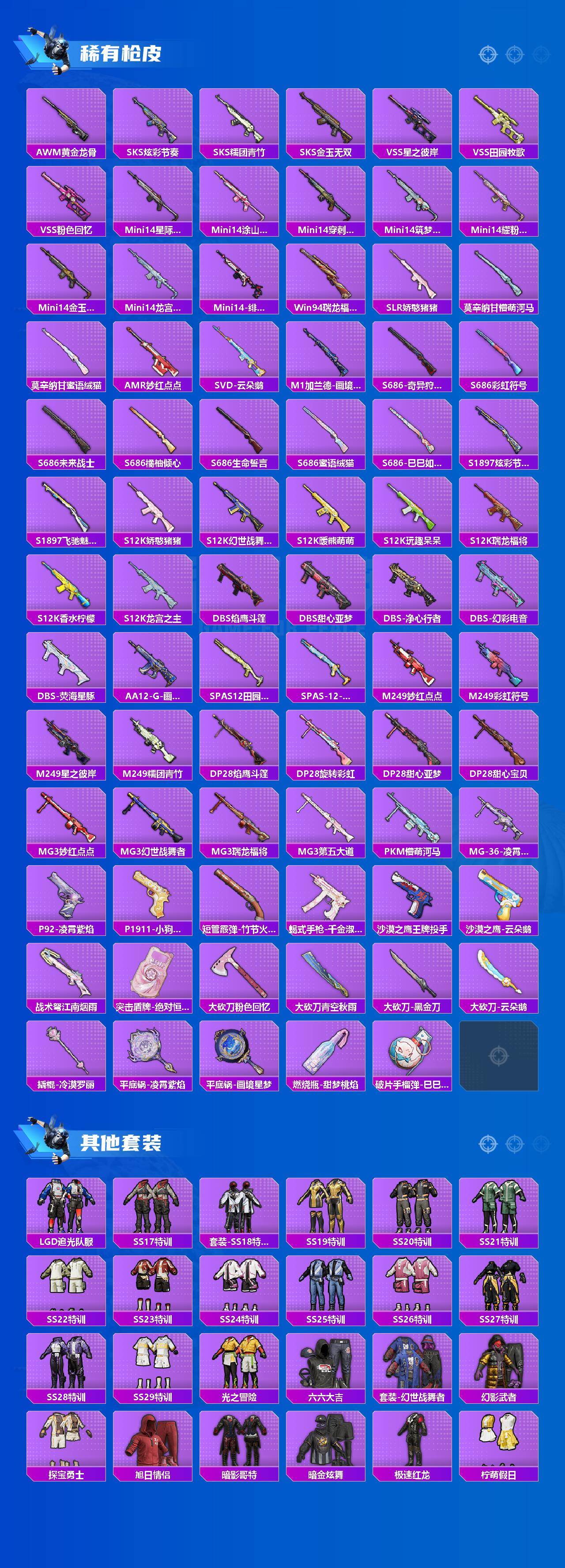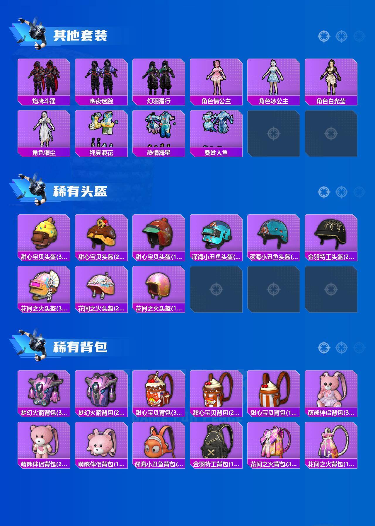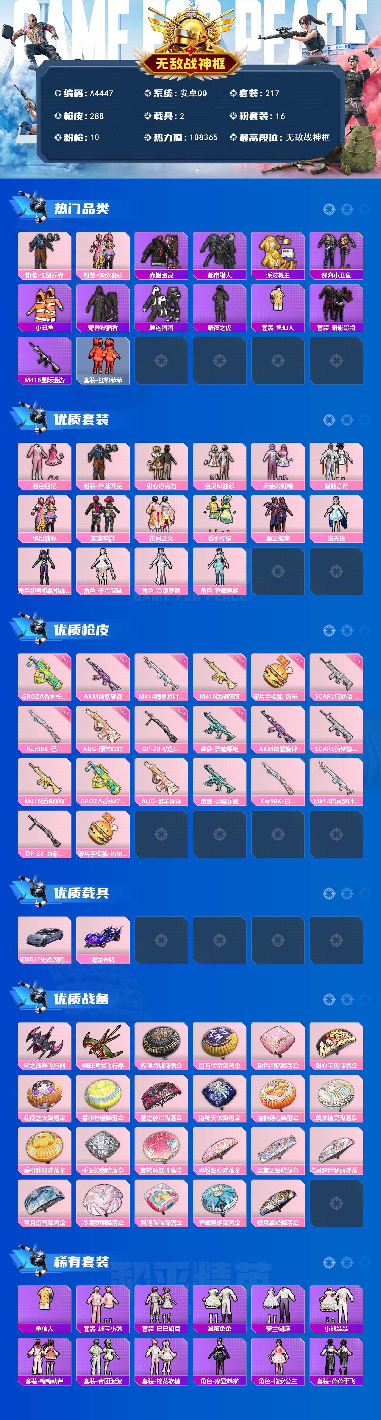 [15924807]安卓【素材号/怪诞乔克/缤纷油彩/赤蝎幽灵/都市猎人/派对舞王/暗影哥特/m416-星际漫游/甜心巧克力/放客神游/角色-初号机款机体服/萌熊伴侣背包】 手q-无敌战神框-16粉装-10特效呛-2载具-4粉色飞行器-108365热力值-19王牌印记-217套装-288呛皮 【热门品类】:粉装-怪诞乔克,粉装-缤纷油彩,套装-赤蝎幽灵,套装-都市猎人,套装-派对舞王,套装-深海小丑鱼,套装-小丑鱼,套装-奇异狩猎者,套装-胖达团团,套装-暗夜之虎,套装-龟仙人,套装-暗影哥特,m416-星际漫游,套装-红熊茄茄 【粉色套装】:粉装-粉色回忆,粉装-怪诞乔克,粉装-甜心巧克力,粉装-宝贝奶油派,粉装-天使彩虹糖,粉装-智能音符,粉装-缤纷油彩,粉装-放客神游,粉装-花间之火,粉装-香水柠檬,粉装-星之彼岸,角色-洛天依,角色-初号机款机体服,角色-千金淑猫,角色-冷漠罗丽,角色-异瞳寒姬 【粉色呛皮等级】:akm-炫紫旋律七级,scar-l-纯梦嫁纱六级,m416-暖熊萌萌七级,groza-香水柠檬七级,aug-暖羊咩咩五级,蜜獾-异瞳寒姬五级,kar98k-巳巳如意五级,mk14-精灵梦叶罗丽七级,dp-28-豹影疾电五级,破片手留单-热量炸弹七级 【粉色载具】:仰望u7(阿盖尔紫),海龙奔腾 【粉色呛皮】:akm-炫紫旋律,scar-l-纯梦嫁纱,m416-暖熊萌萌,groza-香水柠檬,aug-暖羊咩咩,蜜獾-异瞳寒姬,kar98k-巳巳如意,mk14-精灵梦叶罗丽,dp-28-豹影疾电,破片手留单-热量炸弹 【粉色飞行器】:星之彼岸飞行器,翩跹演武飞行器 【粉色降落伞】:极限特训降落伞,百万伏特降落伞,粉色回忆降落伞,甜心宝贝降落伞,花间之火降落伞,香水柠檬降落伞,星之彼岸降落伞,洛神天依降落伞,橘柚倾心降落伞,筑梦精灵降落伞,垂柳戏鸭降落伞,千面幻镜降落伞,旋转彩虹降落伞,飒粉甜心降落伞,圣堂之誓降落伞,精灵梦叶罗丽降落伞,雪月幻音降落伞,冷漠罗丽降落伞,智趣喵喵降落伞,异瞳寒姬降落伞,极意拳锋降落伞,炫彩糖果降落伞 【稀有套装】:套装-龟仙人,套装-绒宝小鹅,套装-巳巳如意,套装-雪国风尚,套装-炫彩糖果,套装-雏菊兔兔,套装-萝兰蝴蝶,套装-小熊娃娃,套装-糖糖葫芦,套装-青团波波,套装-棉花软糖,角色-摩登魅猫,