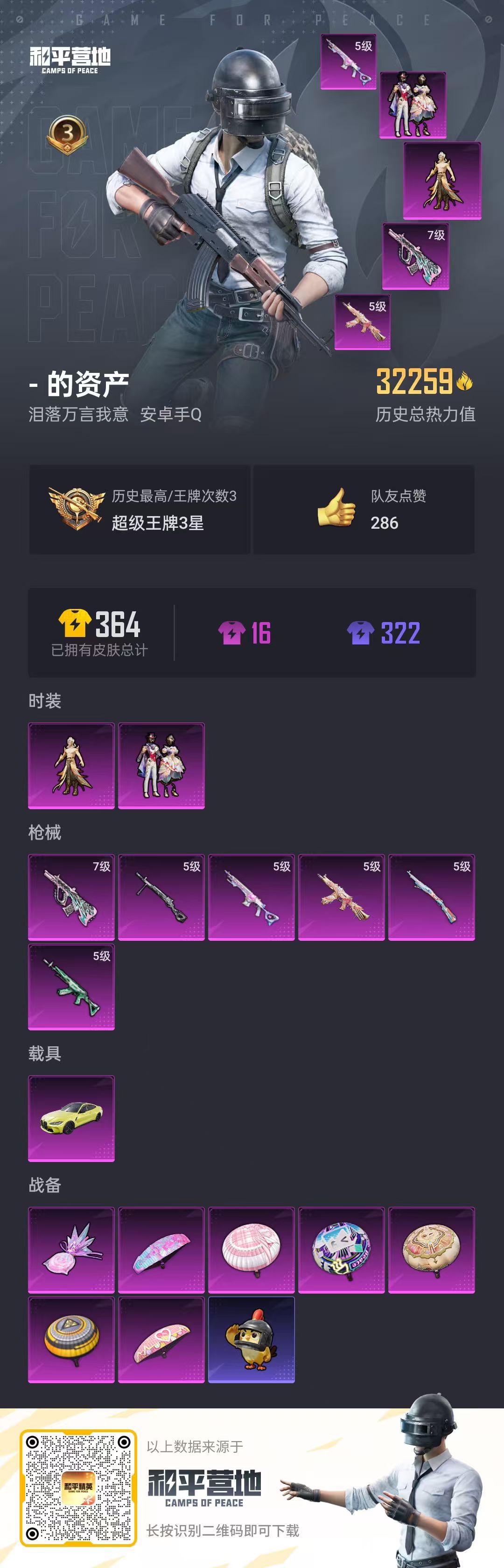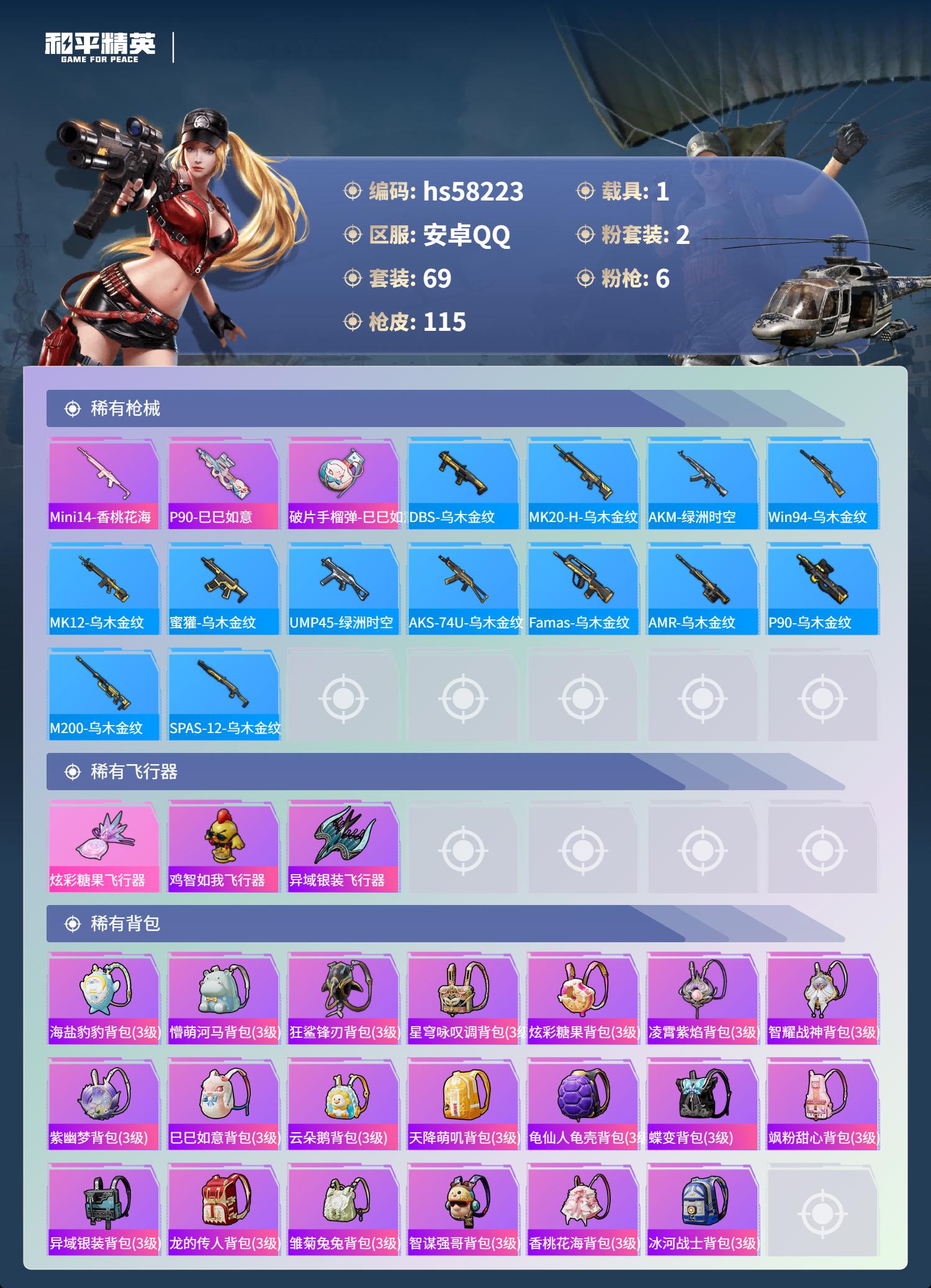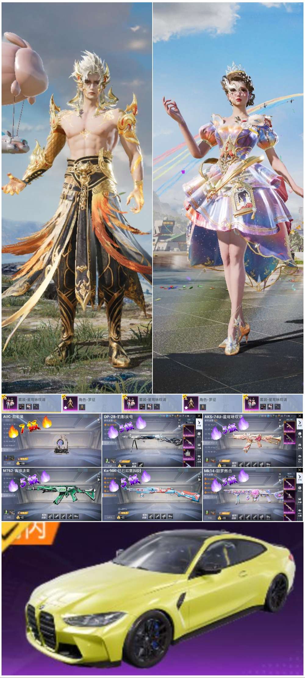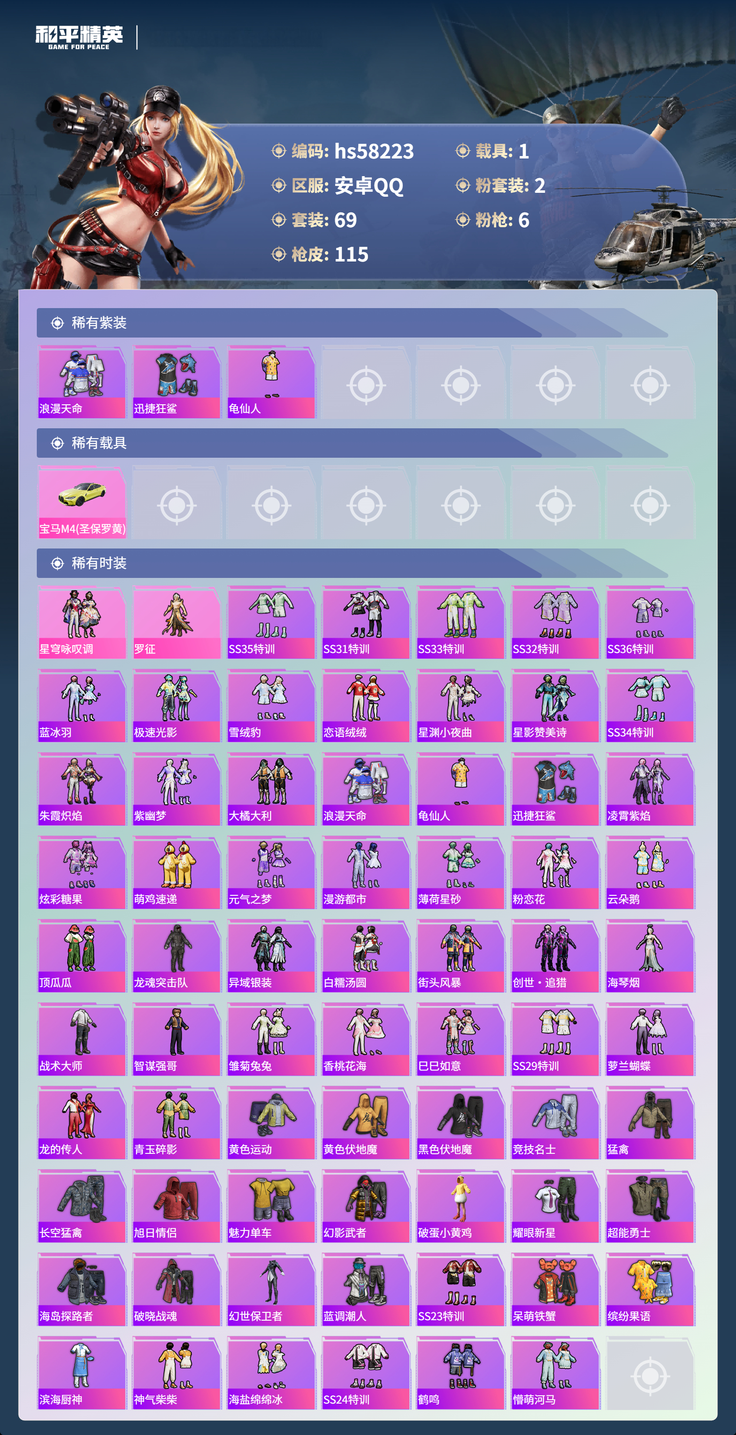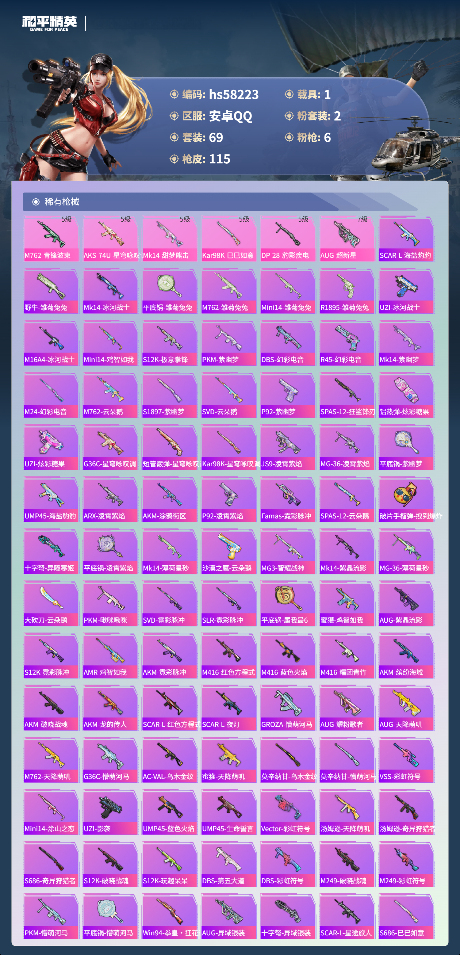 hs58223 安卓手q-3王牌印记-2粉装-6特效呛-1载具-32400热力值-69套装-115呛皮【2粉装】套装-星穹咏叹调角色-罗征【6特效呛】aug-超新星/7级dp-28-豹影疾电/5级mk14-甜梦熊击/5级aks-74u-星穹咏叹调/5级m762-青锋波束/5级kar98k-巳巳如意/5级【3稀有紫装】浪漫天命迅捷狂鲨龟仙人【1稀有载具】宝马m4圣保罗黄