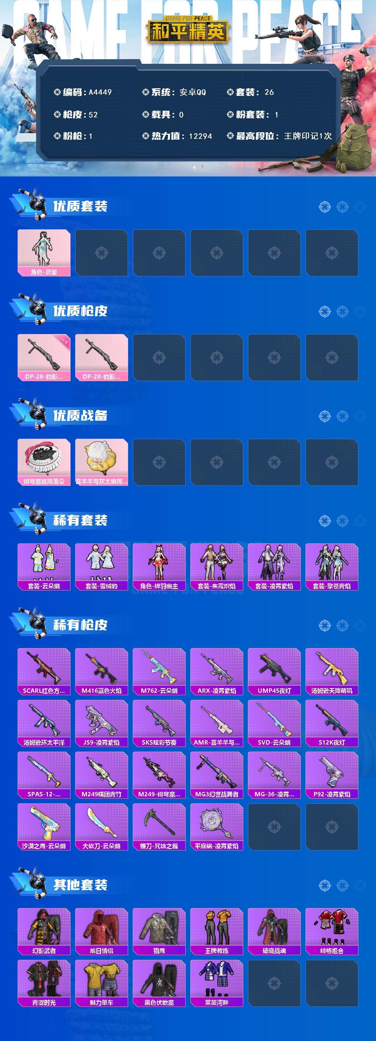 [15924993]安卓【小号】 手q-1粉装-1特效呛-0载具-1粉色飞行器-12294热力值-1王牌印记-26套装-52呛皮 【粉色套装】:角色-灵玺 【粉色呛皮等级】:dp-28-豹影疾电五级 【粉色呛皮】:dp-28-豹影疾电 【粉色降落伞】:绯穹魔姬降落伞,喜羊羊与灰太狼降落伞,炫彩糖果降落伞 【稀有套装】:套装-炫彩糖果,套装-云朵鹅,套装-雪绒豹,角色-绛羽幽主,套装-朱霞炽焰,套装-凌霄紫焰,套装-擎苍青焰 【稀有呛皮】:aug-冰晶雪宝,scar-l-红色方程式,m416-蓝色火焰,m762-云朵鹅,arx-凌霄紫焰,ump45-夜灯,汤姆逊-天降萌叽,汤姆逊-环太平洋,js9-凌霄紫焰,sks-炫彩节奏,amr-喜羊羊与灰太狼,svd-云朵鹅,s12k-夜灯,spas-12-云朵鹅,m249-糯团青竹,m249-绯穹魔姬,mg3-幻世战舞者,mg-36-凌霄紫焰,p92-凌霄紫焰,沙墨之鹦-云朵鹅,大砍刀-云朵鹅,镰刀-咒蚀之裁,平底锅-凌霄紫焰 【其他套装】:套装-幻影武者,套装-旭日情侣,套装-猎鹰,套装-王牌教练,套装-破晓战魂,套装-绯格组合,套装-青涩时光,套装-魅力单车,套装-黑色伏地魔,套装-莱茵河畔 【营地id】:1028910823