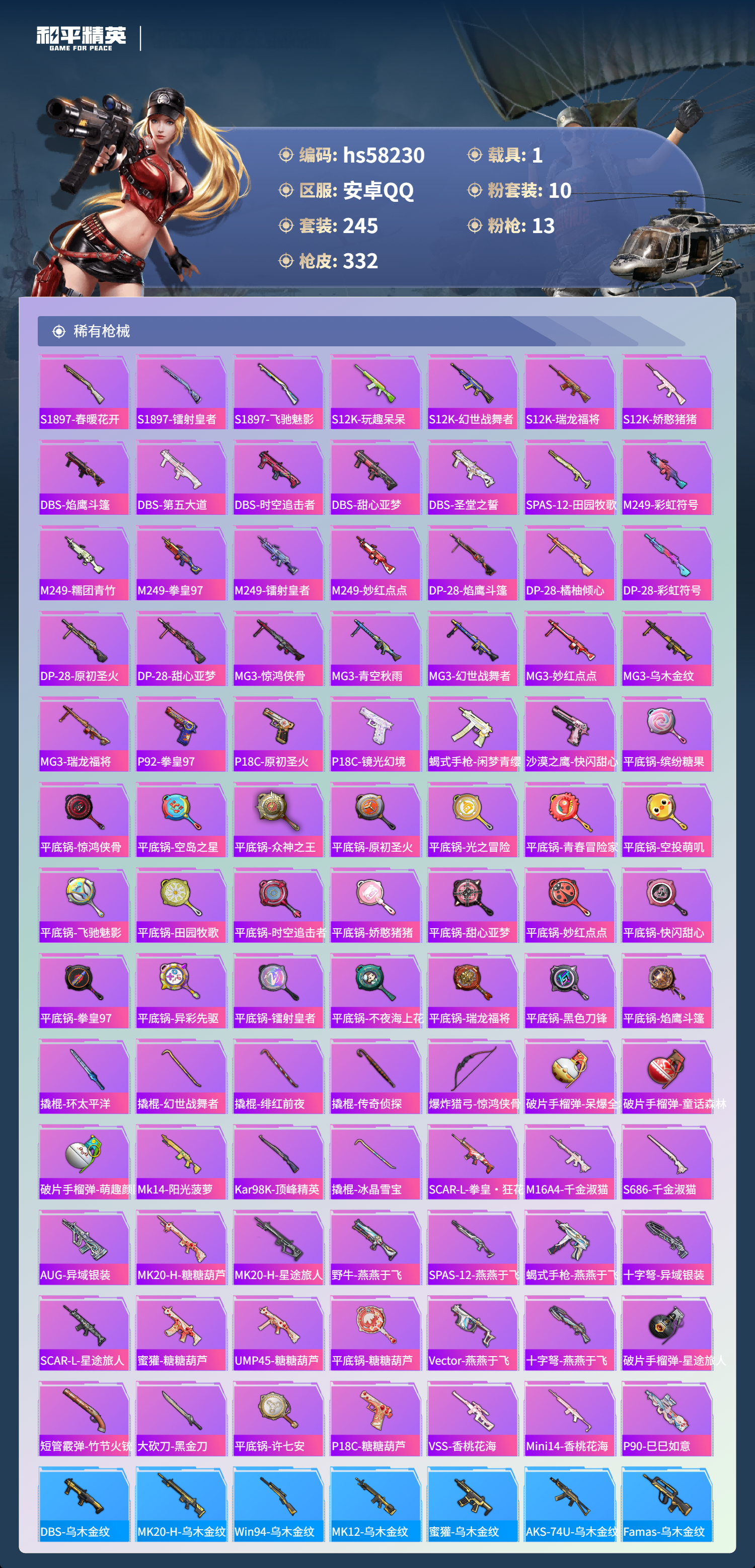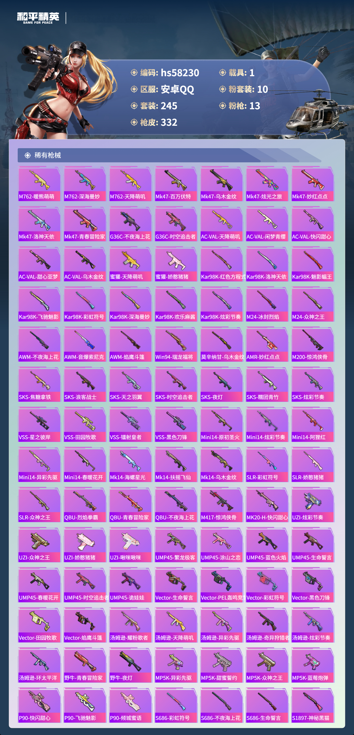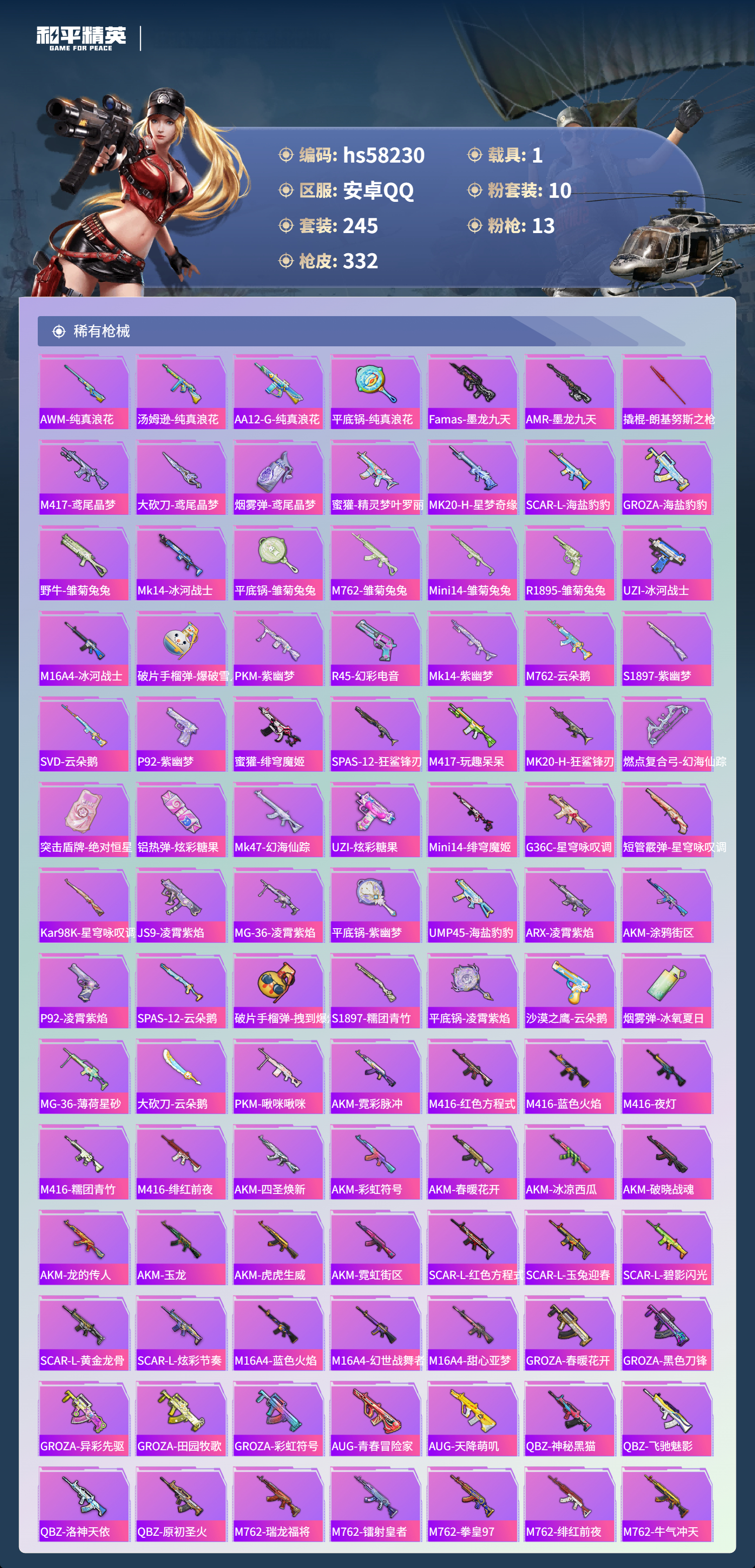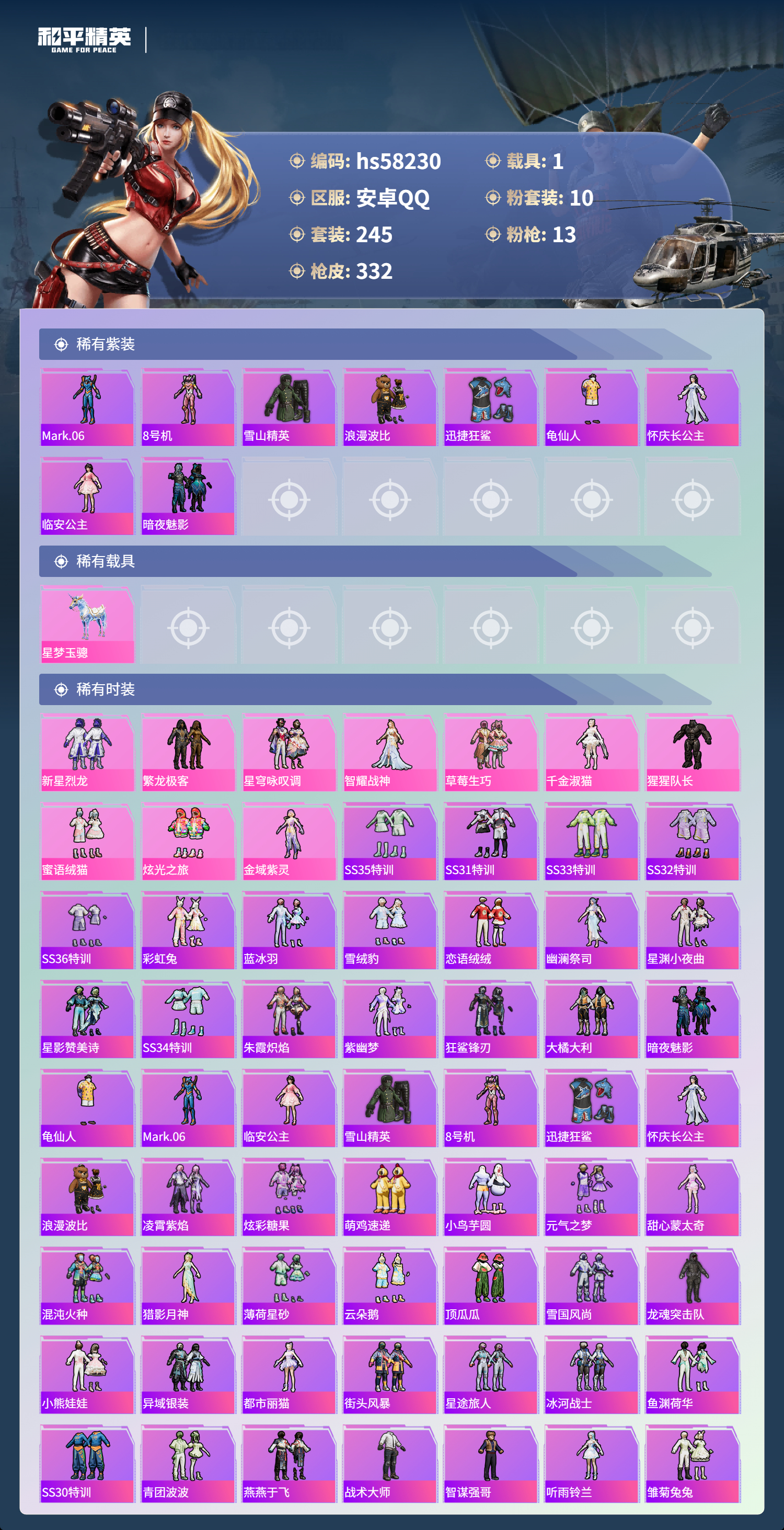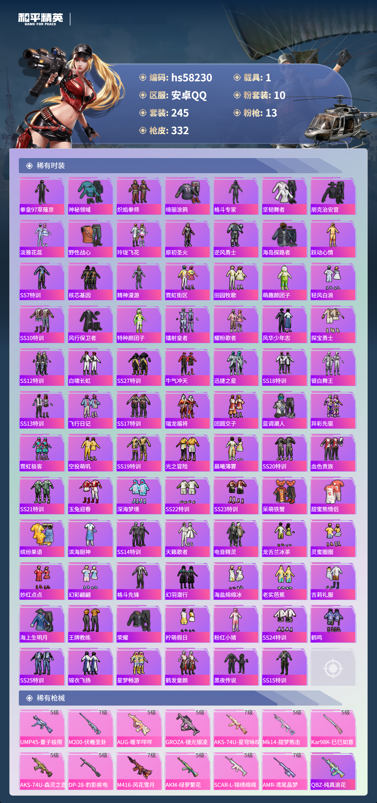hs58230 安卓手q-25王牌印记-10粉装-13特效呛-1载具-热力值-245套装-332呛皮-9卓越印记-8传奇印记【10粉装】套装-繁龙极客套装-新星烈龙套装-草莓生巧角色-智耀战神套装-星穹咏叹调套装-蜜语绒猫套装-炫光之旅角色-千金淑猫角色-金域紫灵角色-猩猩队长【13特效呛】groza-镜光银凌/5级m416-风花雪月/7级m200-伏羲圣卦/