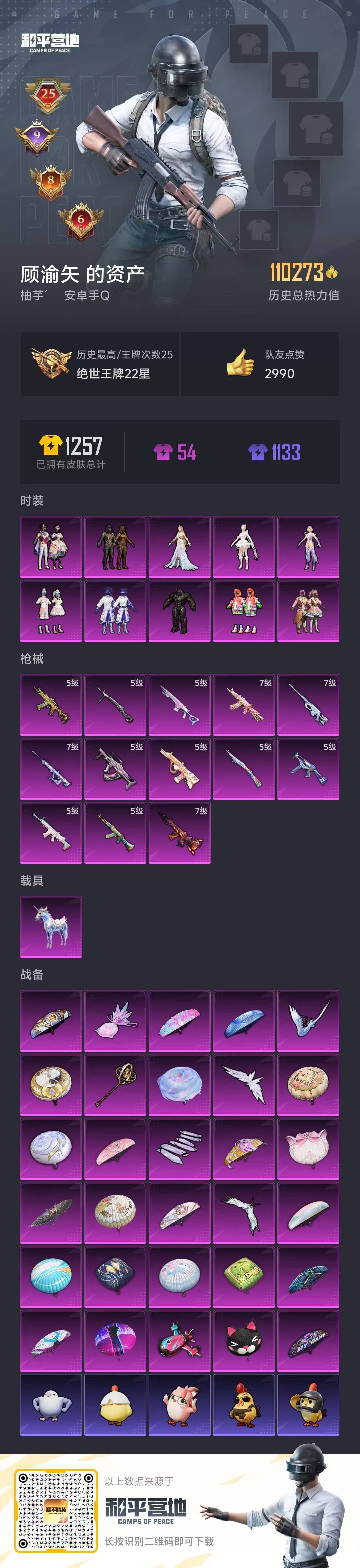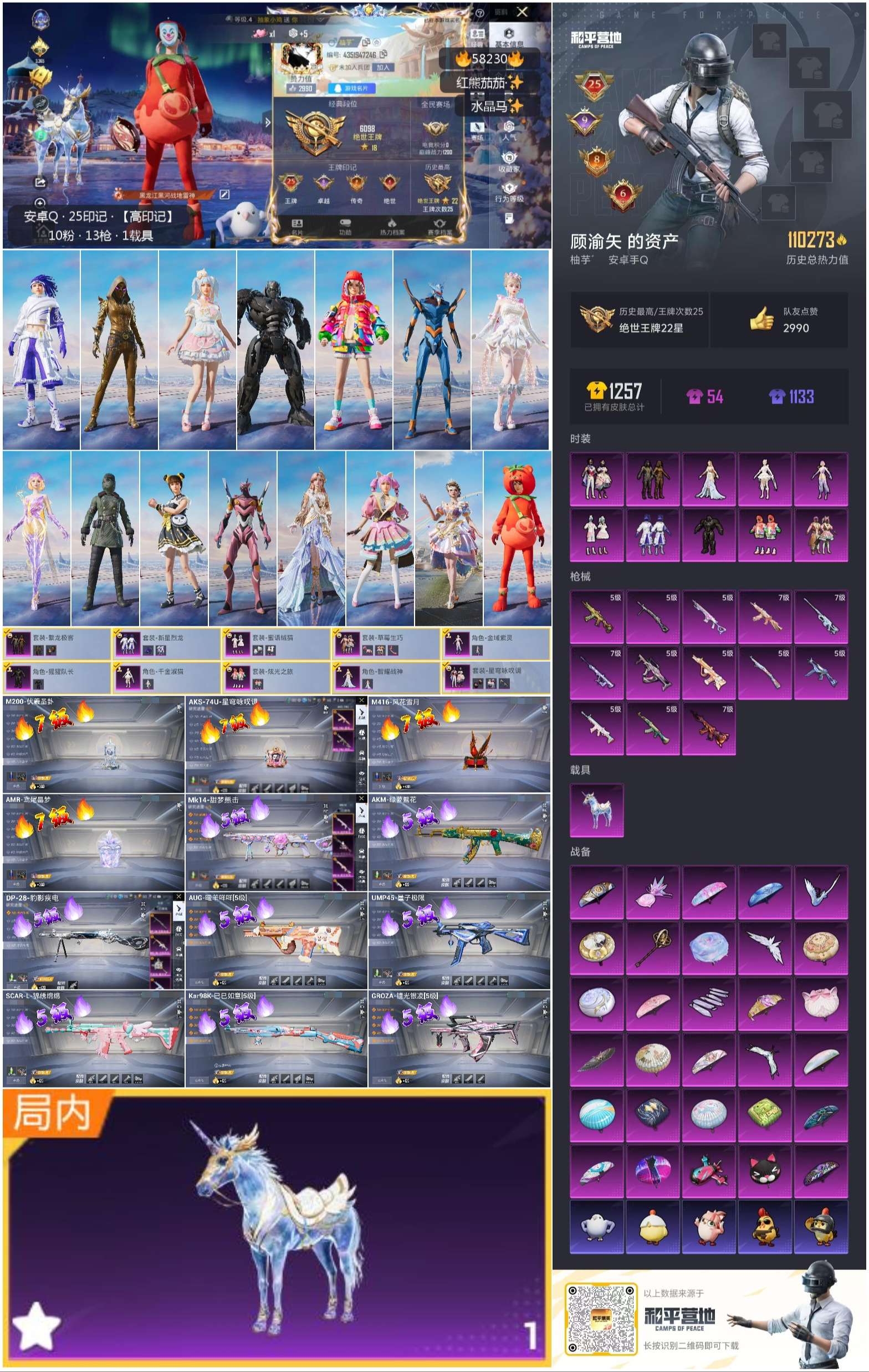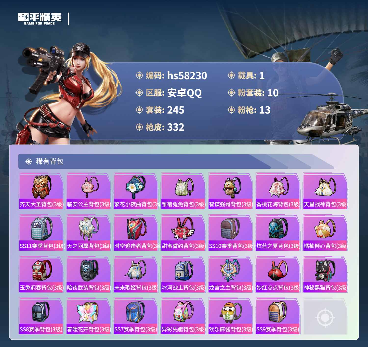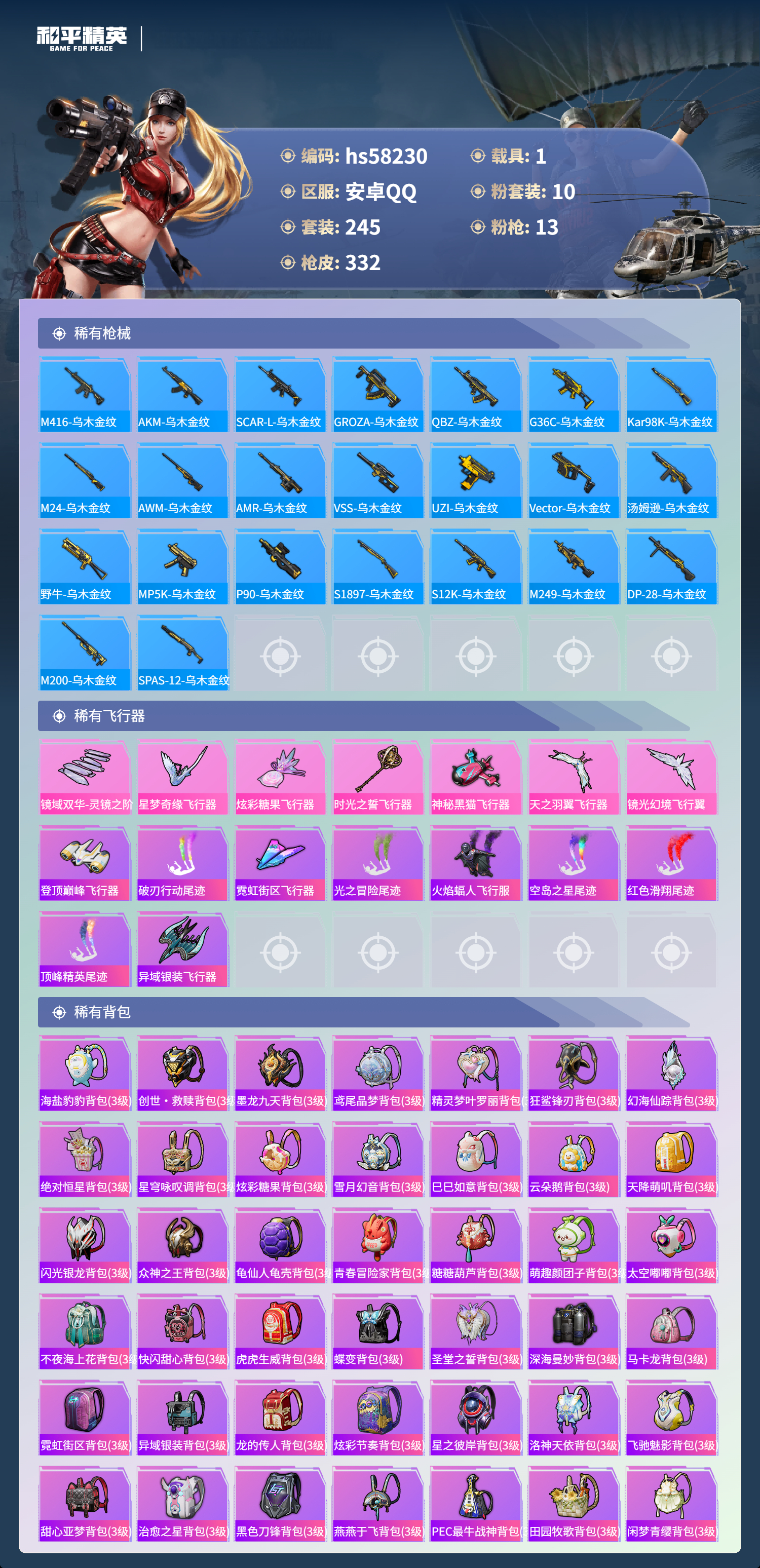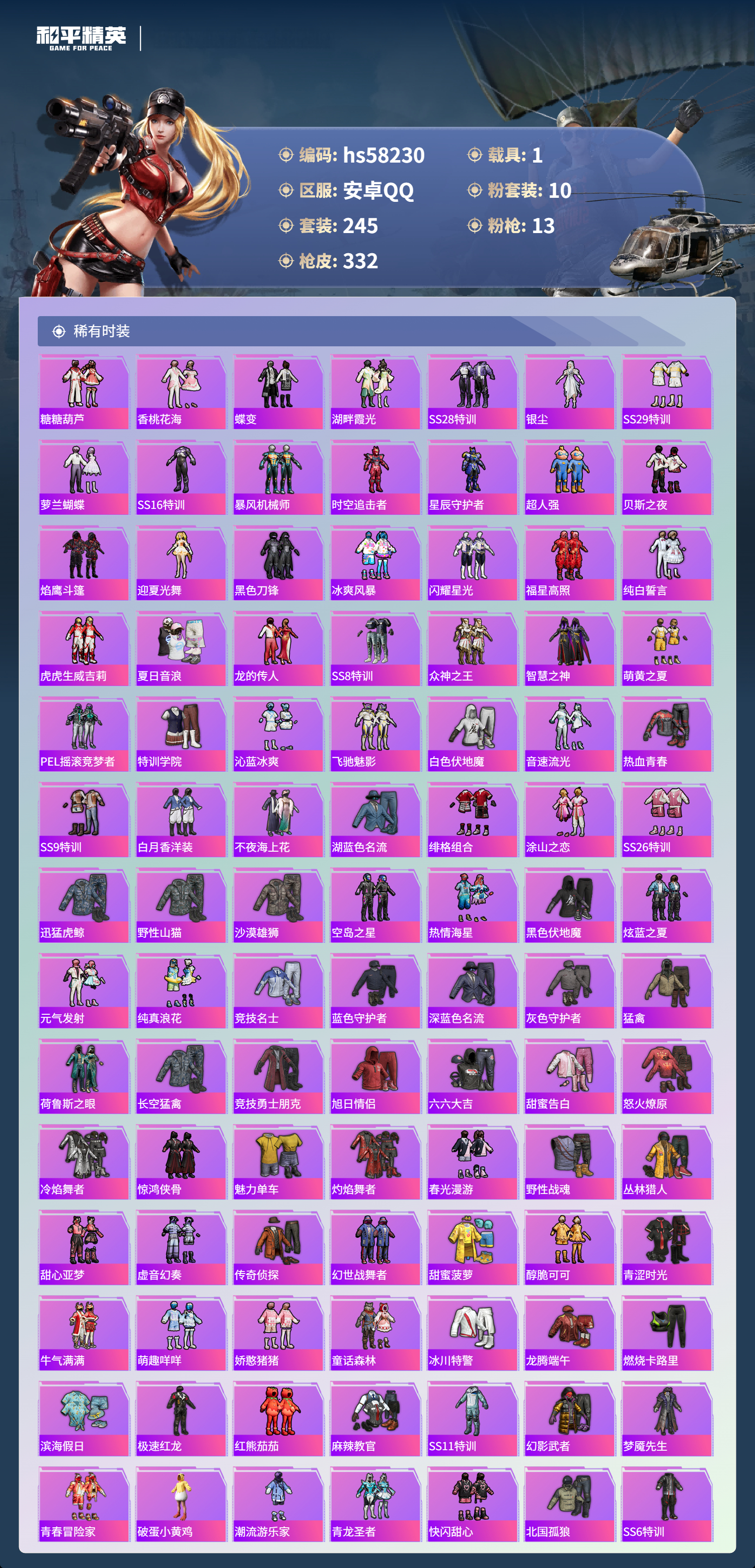 hs58230 安卓手q-25王牌印记-10粉装-13特效呛-1载具-热力值-245套装-332呛皮-9卓越印记-8传奇印记【10粉装】套装-繁龙极客套装-新星烈龙套装-草莓生巧角色-智耀战神套装-星穹咏叹调套装-蜜语绒猫套装-炫光之旅角色-千金淑猫角色-金域紫灵角色-猩猩队长【13特效呛】groza-镜光银凌/5级m416-风花雪月/7级m200-伏羲圣卦/