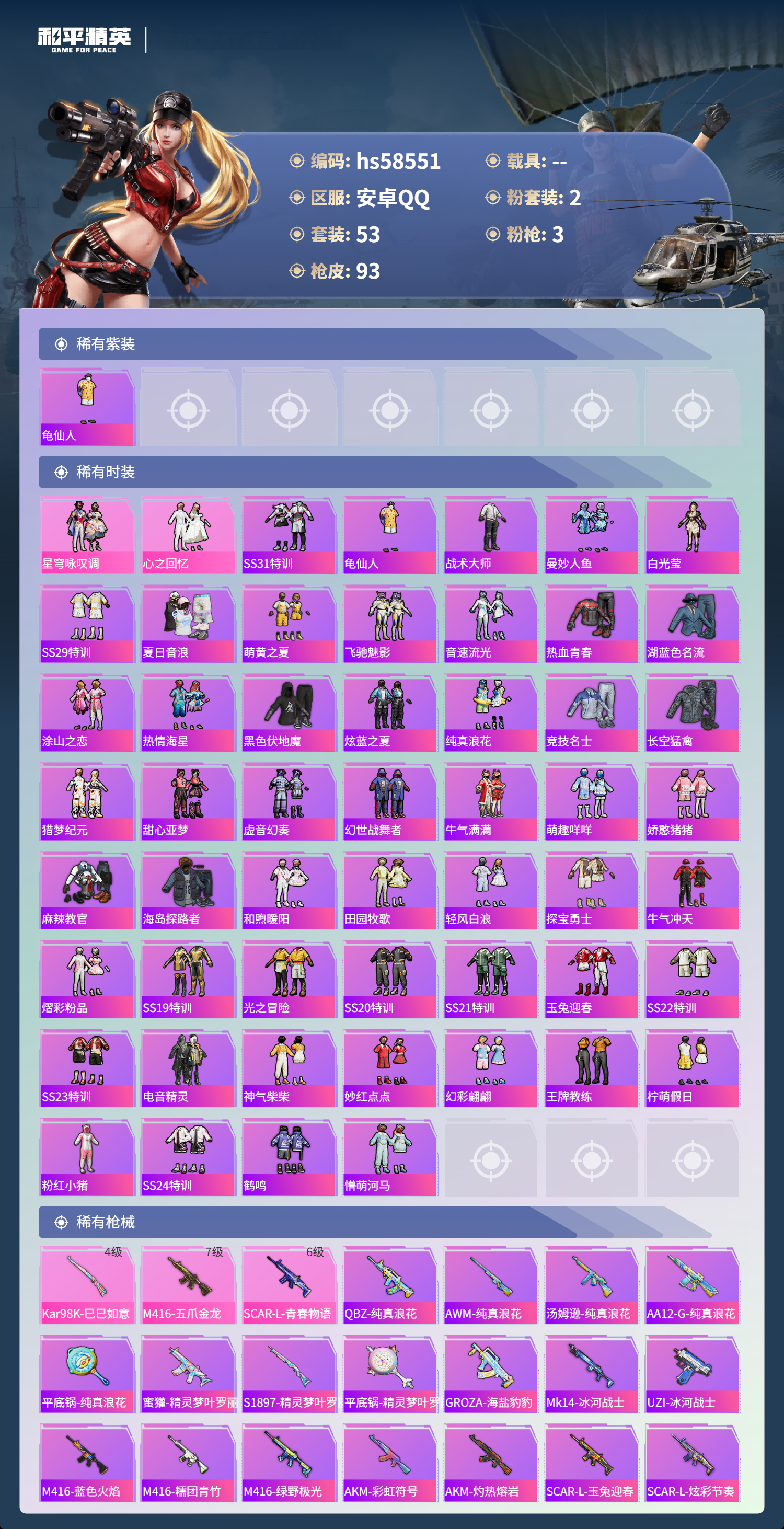 hs58551 安卓手q-5王牌印记-2粉装-3特效呛-28854热力值-53套装-93呛皮【2粉装】套装-心之回忆套装-星穹咏叹调【3特效呛】scar-l-青春物语/6级kar98k-巳巳如意/4级m416-五爪金龙/7级【1稀有紫装】龟仙人【53稀有时装】星穹咏叹调ss31特训龟仙人心之回忆战术大师曼妙人鱼白光莹ss29特训夏日音浪萌黄之夏飞驰魅影音速流光
