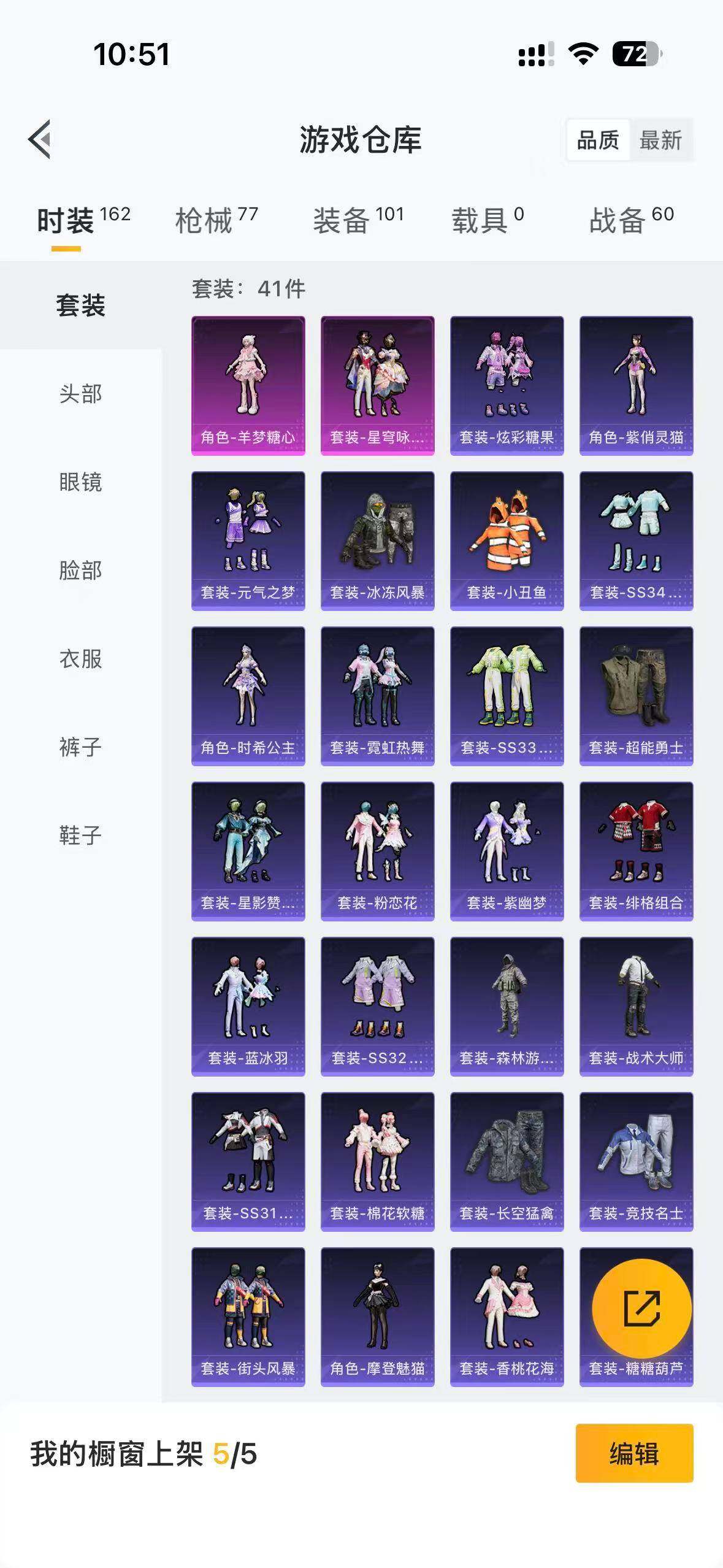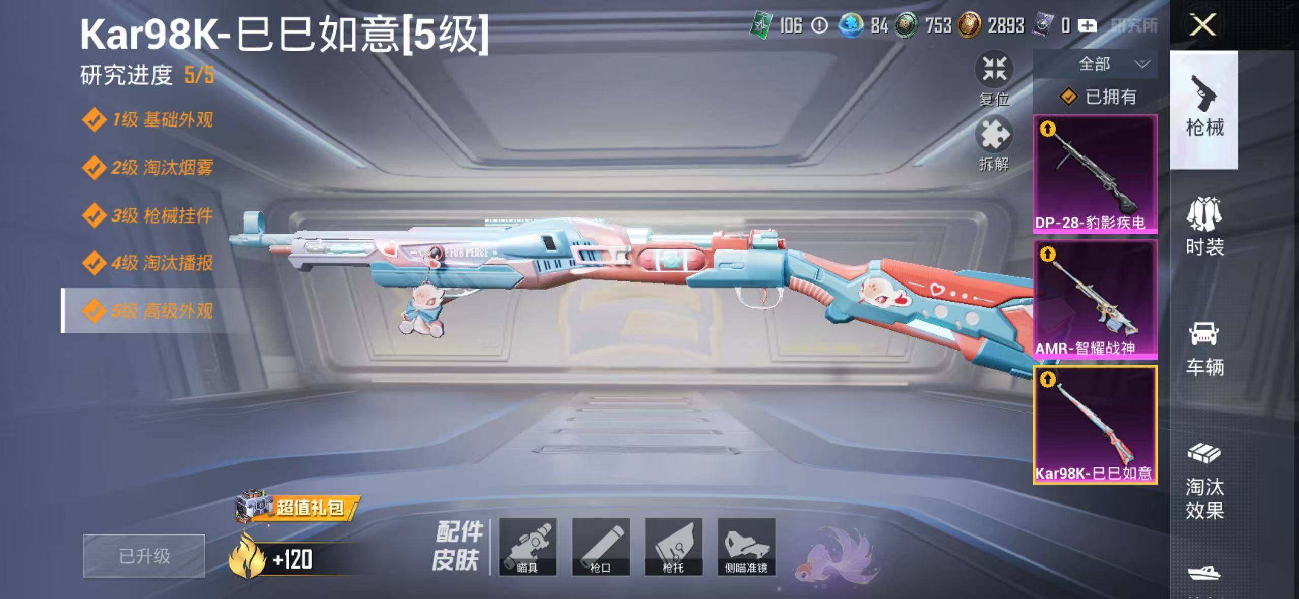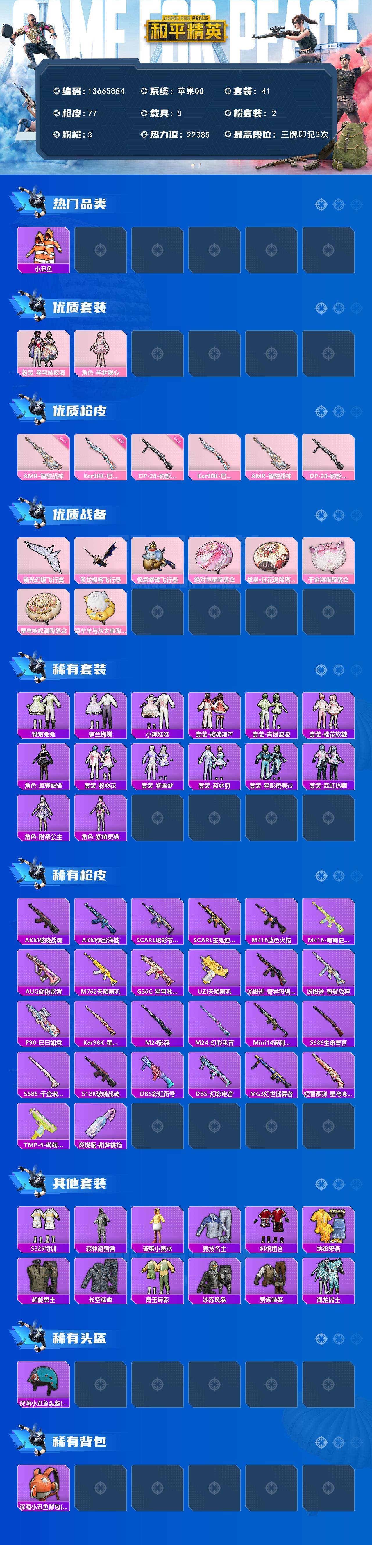 6297 2粉装-3特效呛-0载具-4粉色飞行器-22385热力值-3王牌印记-41套装-77呛皮 【热门品类】:套装-小丑鱼 【粉色套装】:粉装-星穹咏叹调,角色-羊梦糖心 【粉色呛皮等级】:amr-智耀战神七级 【粉色呛皮】:kar98k-巳巳如意,amr-智耀战神,dp-28-豹影疾电 【粉色飞行器】:繁龙极客飞行器,镜光幻境飞行翼,极意拳锋飞行器 【粉色降落伞】:绝对恒星降落伞