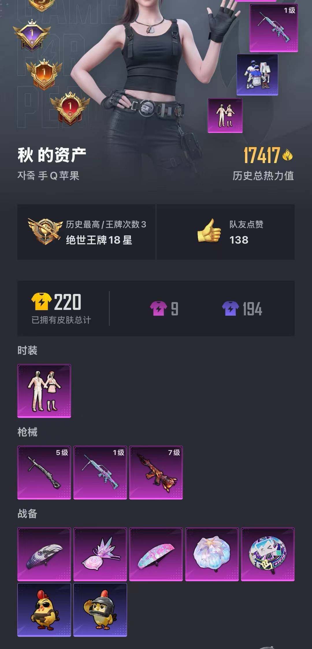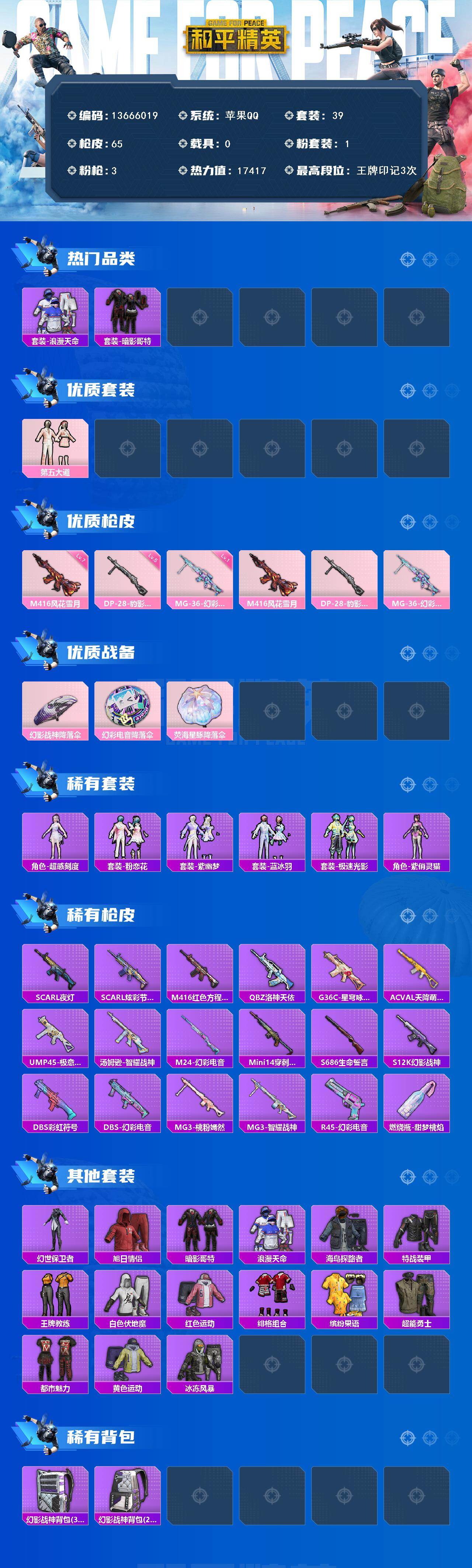 6429【暗影哥特-风花雪月1粉装3特效呛1粉色飞行器】17417热力值-3王牌印记-39套装-65呛皮 【热门品类】:套装-浪漫天命,套装-暗影哥特 【粉色套装】:粉装-第五大道 【粉色呛皮等级】:m416-风花雪月七级,mg-36-幻彩电音一级 【粉色呛皮】:m416-风花雪月,dp-28-豹影疾电,mg-36-幻彩电音 【粉色降落伞】:幻影战神降落伞,幻彩电音降落伞,荧海星豚