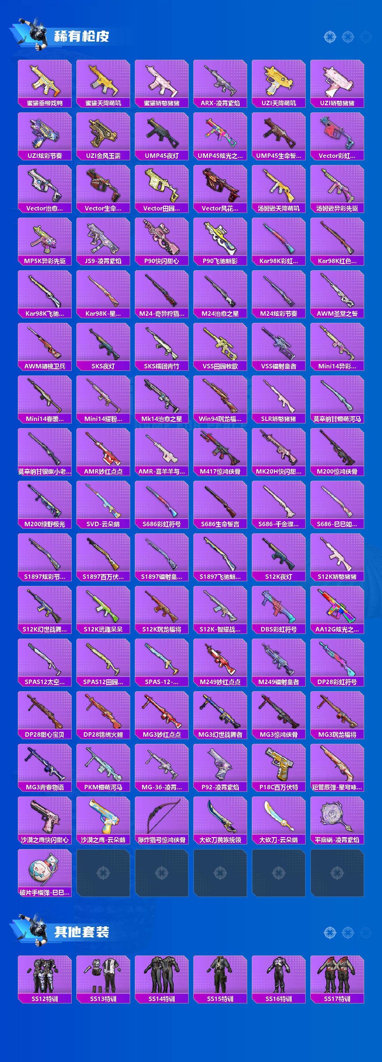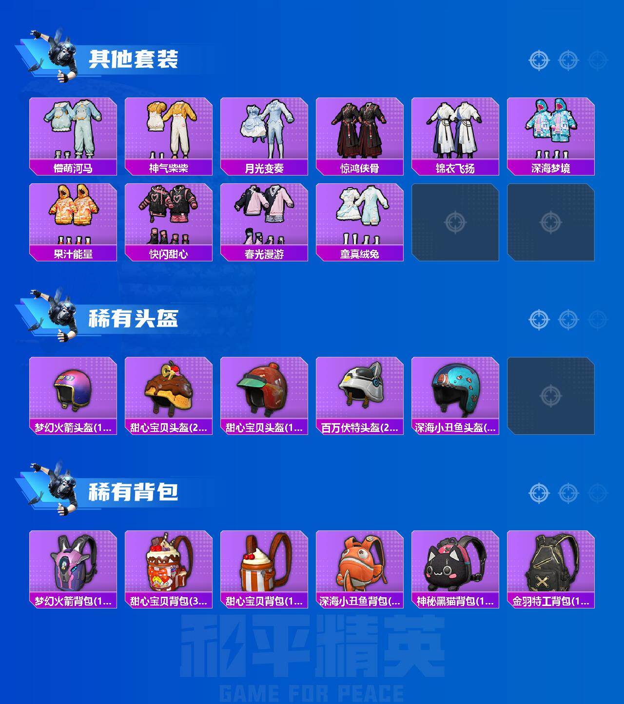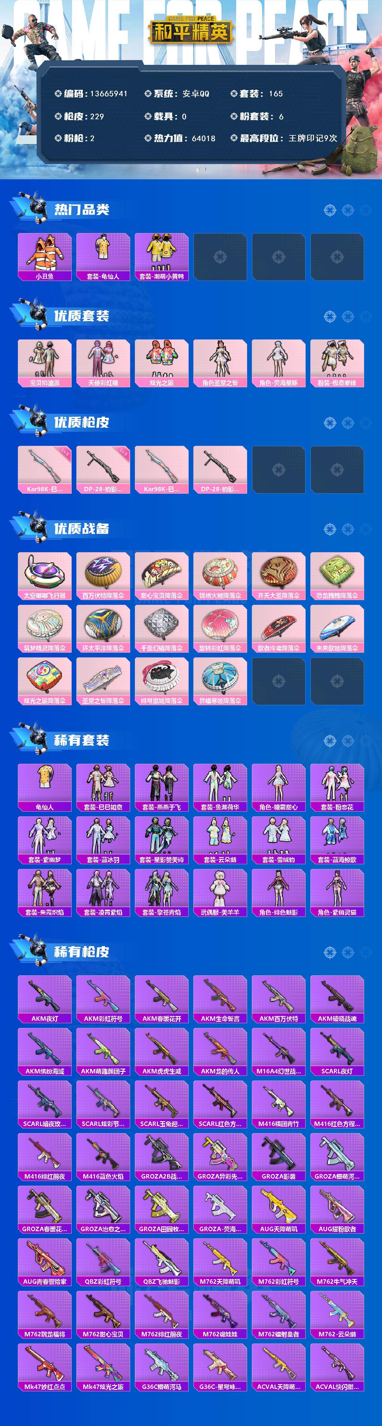 6353 6粉装-2特效呛-2粉色飞行器-64018热力值-9王牌印记-165套装-229呛皮 【热门品类】:套装-小丑鱼,套装-龟仙人,套装-潮萌小黄鸭 【粉色套装】:粉装-宝贝奶油派,粉装-天使彩虹糖,粉装-炫光之旅,角色-圣堂之誓,角色-荧海星豚,粉装-极意拳锋 【粉色呛皮】:kar98k-巳巳如意,dp-28-豹影疾电 【粉色飞行器】:太空嘟嘟飞行器 【粉色降落伞】:百万伏特降落伞