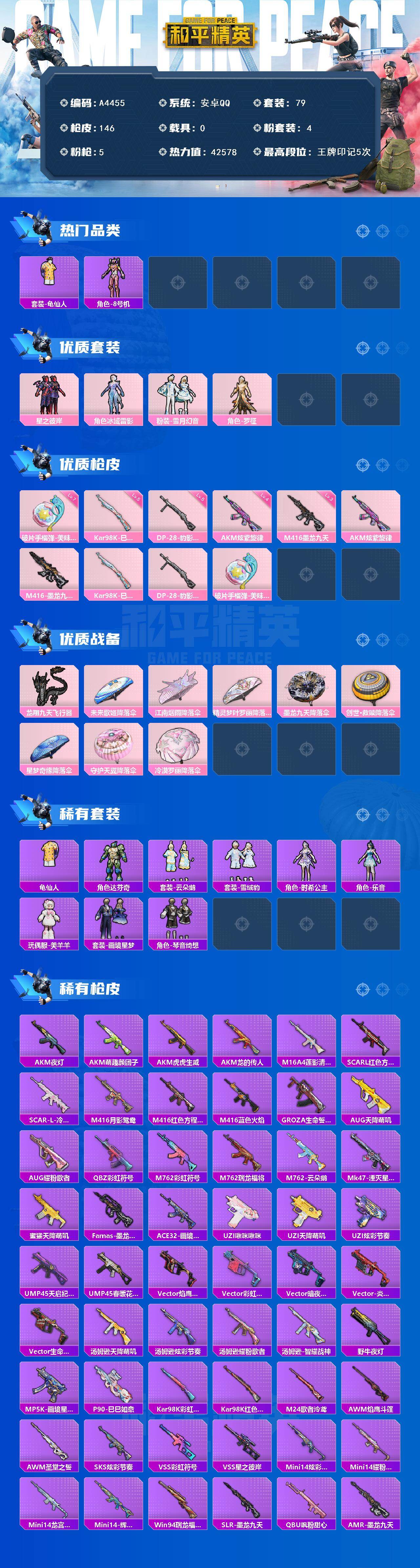 [15934703]安卓 【小号 龟仙人/8号机/m416-墨龙九天三级】手q-4粉装-5特效呛-0载具-2粉色飞行器-42578热力值-5王牌印记-79套装-146呛皮 【热门品类】:套装-龟仙人,角色-8号机 【粉色套装】:粉装-星之彼岸,角色-冰域雷影,粉装-雪月幻音,角色-罗征 【粉色呛皮等级】:akm-炫紫旋律四级,m416-墨龙九天三级,kar98k-巳巳如意五级,dp-28-豹影疾电五级,破片手留单-美味星星糖七级 【粉色呛皮】:akm-炫紫旋律,m416-墨龙九天,kar98k-巳巳如意,dp-28-豹影疾电,破片手留单-美味星星糖 【粉色飞行器】:龙翔九天飞行器 【粉色降落伞】:未来歌姬降落伞,江南烟雨降落伞,精灵梦叶罗丽降落伞,墨龙九天降落伞,创世·救赎降落伞,星梦奇缘降落伞,守护天翼降落伞,冷漠罗丽降落伞,炫彩糖果降落伞 【稀有套装】:套装-龟仙人,套装-炫彩糖果,角色-达芬奇,套装-云朵鹅,套装-雪绒豹,角色-时希公主,角色-乐音,玩偶服-美羊羊,套装-画境星梦,套装-琴音绮想 【稀有呛皮】:akm-夜灯,akm-萌趣颜团子,akm-虎虎生威,akm-龙的传人,m16a4-莲影清波,scar-l-红色方程式,scar-l-冷漠罗丽,m416-月影鸳鸯,m416-红色方程式,m416-蓝色火焰,groza-生命誓言,aug-天降萌叽,aug-耀粉歌者,q-彩虹符号,m762-彩虹符号,m762-瑞龙福将,m762-云朵鹅,mk47-湮灭星辰,蜜獾-天降萌叽,famas-墨龙九天,ace32-画境星梦,uzi-啾咪啾咪,uzi-天降萌叽,uzi-炫彩节奏,ump45-天启纪元,ump45-春暖花开,vect-焰鹰斗篷,vect-彩虹符号,vect-暗夜玫瑰,vect-炎氏战神,vect-生命誓言,汤姆逊-天降萌叽,汤姆逊-炫彩节奏,汤姆逊-耀粉歌者,汤姆逊-智耀战神,野牛-夜灯,mp5k-画境星梦,p90-巳巳如意,kar98k-彩虹符号,kar98k-红色方程式,m24-歌者泠鸢,awm-焰鹰斗篷,awm-圣堂之誓,sks-炫彩节奏,vss-彩虹符号,vss-星之彼岸,mini14-炫彩节奏,mini14-耀粉歌者,mini14-龙宫之主,mini14-辉羽雀灵,win94-瑞龙福将,slr-墨龙九天,qbu-飒粉