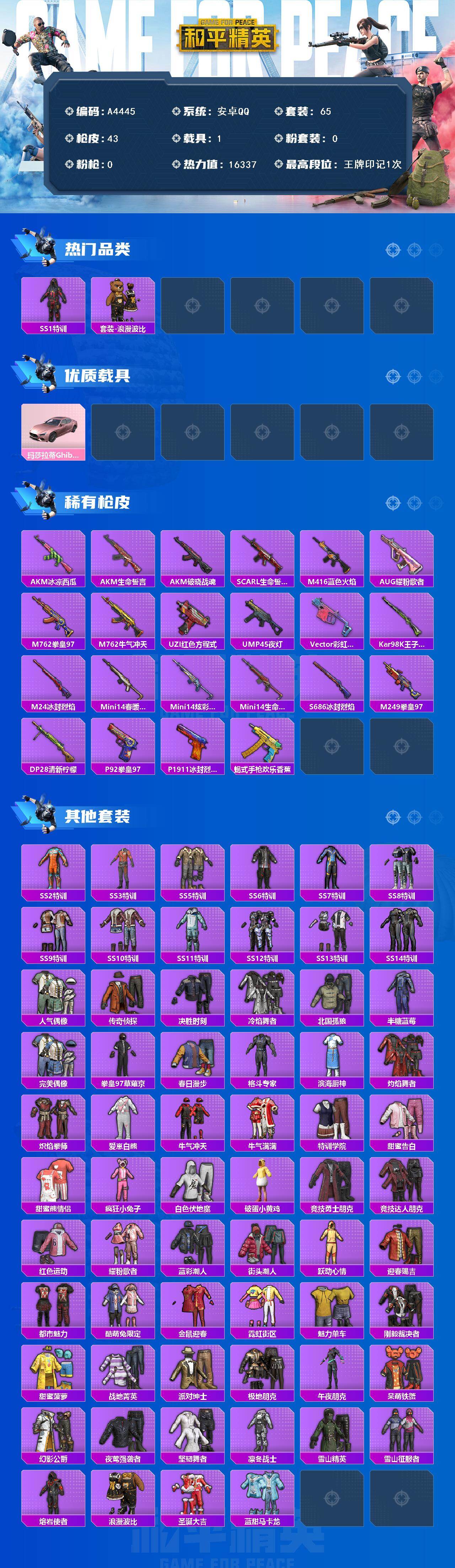 [15934845]安卓 【小号 浪漫波比/玛莎拉蒂ghibli(粉)】手q-0粉装-0特效呛-1载具-0粉色飞行器-16337热力值-1王牌印记-65套装-43呛皮 【热门品类】:套装-ss1特训,套装-浪漫波比 【粉色载具】:玛莎拉蒂ghibli(粉) 【稀有呛皮】:akm-冰凉西瓜,akm-生命誓言,akm-破晓战魂,scar-l-生命誓言,m416-蓝色火焰,aug-耀粉歌者,m762-拳皇97,m762-牛气冲天,uzi-红色方程式,ump45-夜灯,vect-彩虹符号,kar98k-王子的夏天,m24-冰封烈焰,mini14-春暖花开,mini14-炫彩节奏,mini14-生命誓言,s686-冰封烈焰,m249-拳皇97,dp-28-清新柠檬,p92-拳皇97,p1911-冰封烈焰,蝎式手呛-欢乐香蕉 【其他套装】:套装-ss2特训,套装-ss3特训,套装-ss5特训,套装-ss6特训,套装-ss7特训,套装-ss8特训,套装-ss9特训,套装-ss10特训,套装-ss11特训,套装-ss12特训,套装-ss13特训,套装-ss14特训,套装-人气偶像,套装-传奇侦探,套装-决胜时刻,套装-冷焰舞者,套装-北国孤狼,套装-半糖蓝莓,套装-完美偶像,套装-拳皇97草薙京,套装-春日漫步,套装-格斗专家,套装-滨海厨神,套装-灼焰舞者,套装-炽焰拳师,套装-爱崽白熊,套装-牛气冲天,套装-牛气满满,套装-特训学院,套装-甜蜜告白,套装-甜蜜熊情侣,套装-疯狂小兔子,套装-白色伏地魔,套装-破蛋小黄鸡,套装-竞技勇士朋克,套装-竞技达人朋克,套装-红色运动,套装-耀粉歌者,套装-蓝彩潮人,套装-街头潮人,套装-跃动心情,套装-迎春赐吉,套装-都市魅力,套装-酷萌兔限定,套装-金鼠迎春,套装-霓虹街区,套装-魅力单车,套装-刚毅裁决者,套装-甜蜜菠萝,套装-战地菁英,套装-派对绅士,套装-极地朋克,套装-午夜朋克,套装-呆萌铁蟹,套装-幻影公爵,套装-夜莺强袭者,套装-坚韧舞者,套装-凛冬战士,套装-雪山精英,套装-雪山征服者,套装-熔岩使者,套装-浪漫波比,套装-圣诞大吉,套装-蓝甜马卡龙 【稀有头盔】:折纸暴龙头盔2级,金羽特工头盔2级 【稀有背包】:甜心宝贝背包1级 【营地id】:746672703