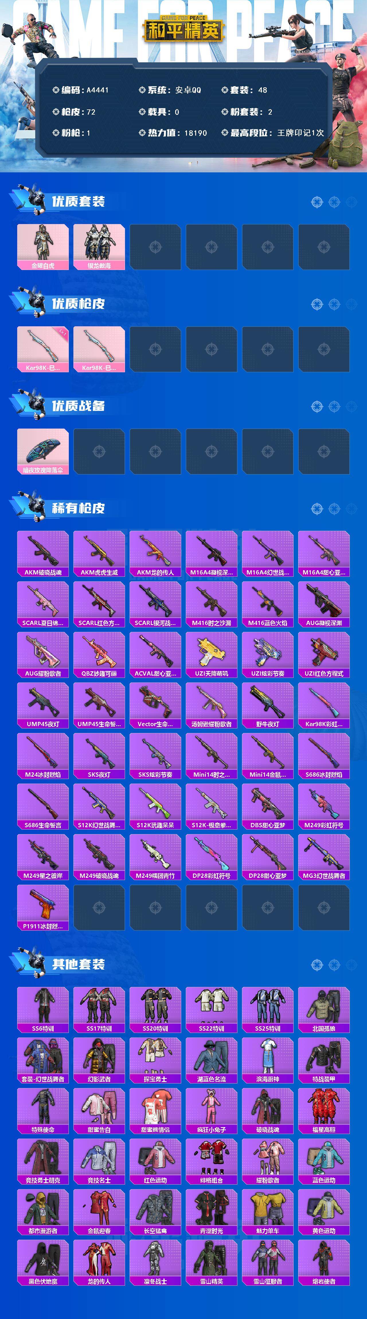 [15935190]安卓 【小号 金曜白虎/银龙傲海/kar98k-巳巳如意一级】手q-2粉装-1特效呛-0载具-1粉色飞行器-18190热力值-1王牌印记-48套装-72呛皮 【粉色套装】:粉装-金曜白虎,粉装-银龙傲海 【粉色呛皮等级】:kar98k-巳巳如意一级 【粉色呛皮】:kar98k-巳巳如意 【粉色降落伞】:暗夜玫瑰降落伞 【稀有套装】:套装-雪国风尚 【稀有呛皮】:akm-破晓战魂,akm-虎虎生威,akm-龙的传人,m16a4-凝视深渊,m16a4-幻世战舞者,m16a4-甜心亚梦,scar-l-夏日绵绵冰,scar-l-红色方程式,scar-l-银河战甲,m416-时之沙漏,m416-蓝色火焰,aug-凝视深渊,aug-耀粉歌者,q-妙趣可丽,ac-val-甜心亚梦,uzi-天降萌叽,uzi-炫彩节奏,uzi-红色方程式,ump45-夜灯,ump45-生命誓言,vect-生命誓言,汤姆逊-耀粉歌者,野牛-夜灯,kar98k-彩虹符号,m24-冰封烈焰,sks-夜灯,sks-炫彩节奏,mini14-时之沙漏,mini14-金鼠迎春,s686-冰封烈焰,s686-生命誓言,s12k-玩趣呆呆,s12k-幻世战舞者,s12k-极意拳锋,dbs-甜心亚梦,m249-彩虹符号,m249-星之彼岸,m249-破晓战魂,m249-糯团青竹,dp-28-彩虹符号,dp-28-甜心亚梦,mg3-幻世战舞者,p1911-冰封烈焰 【其他套装】:套装-ss6特训,套装-ss17特训,套装-ss20特训,套装-ss22特训,套装-ss25特训,套装-北国孤狼,套装-幻世战舞者,套装-幻影武者,套装-探宝勇士,套装-湖蓝色名流,套装-滨海厨神,套装-特战装甲,套装-特殊使命,套装-甜蜜告白,套装-甜蜜熊情侣,套装-疯狂小兔子,套装-破晓战魂,套装-福星高照,套装-竞技勇士朋克,套装-竞技名士,套装-红色运动,套装-绯格组合,套装-耀粉歌者,套装-蓝色运动,套装-都市漫游者,套装-金鼠迎春,套装-长空猛禽,套装-青涩时光,套装-魅力单车,套装-黄色运动,套装-黑色伏地魔,套装-龙的传人,套装-凛冬战士,套装-雪山精英,套装-雪山征服者,套装-熔岩使者,套装-精密机核,套装-太极红客,套装-火舞潮人,套装-圣诞大吉,套装-甜心亚梦,套装-虚音幻奏 【稀有头盔】:银河战甲头盔3