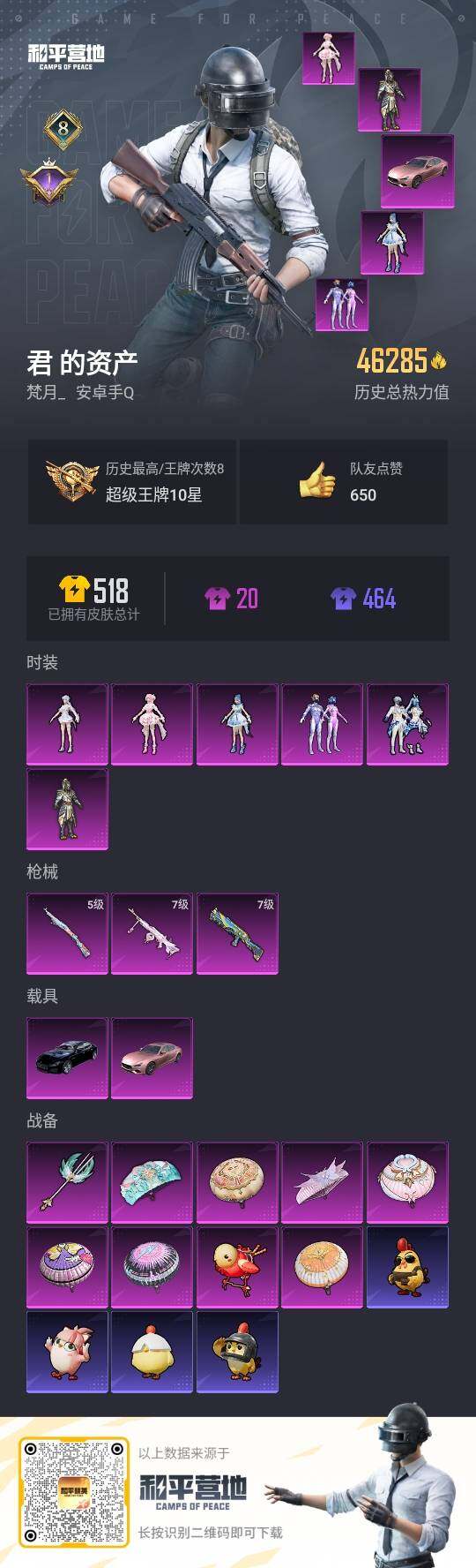 [15935206]安卓【小号/梦幻火箭/6粉装-3满特效呛-2载具-2粉色飞行器】 手q46285热力值-8王牌印记-113套装-138呛皮 【热门品类】:粉装-梦幻火箭,套装-浪漫天命,套装-奇异狩猎者 【粉色载具】:玛莎拉蒂quattropte(夜幕蓝),玛莎拉蒂ghibli(粉) 【粉色套装】:粉装-金曜白虎,粉装-梦幻火箭,粉装-未来歌姬,角色-荧海星豚,角色-奇迹舞步 美琪,角色-奇迹舞步 美雪 【粉色呛皮等级】:野牛-青空秋雨七级,kar98k-巳巳如意五级,pkm-江南烟雨七级 【粉色呛皮】:野牛-青空秋雨,kar98k-巳巳如意,pkm-江南烟雨 【粉色飞行器】:歌者泠鸢飞行器,奇迹舞步飞行器 【粉色降落伞】:梦幻火箭降落伞,启明星降落伞,超新星降落伞,江南烟雨降落伞,巴啦啦小魔仙降落伞,星穹咏叹调降落伞,奇迹舞步降落伞 【稀有套装】:套装-绒宝小鹅,套装-雏菊兔兔,套装-萝兰蝴蝶,套装-粉恋花,套装-紫幽梦,套装-蓝冰羽,套装-星渊小夜曲,套装-朱霞炽焰 【稀有呛皮】:akm-彩虹符号,akm-破晓战魂,akm-龙的传人,m16a4-幻世战舞者,m16a4-甜心亚梦,scar-l-玉兔迎春,scar-l-红色方程式,m416-动感兔斯基,m416-糯团青竹,m416-红色方程式,m416-蓝色火焰,groza-田园牧歌,groza-荧海星豚,aug-耀粉歌者,q-飞驰魅影,m762-天降萌叽,ac-val-天降萌叽,ac-val-甜心亚梦,蜜獾-垂柳戏鸭,蜜獾-天降萌叽,蜜獾-娇憨猪猪,uzi-啾咪啾咪,uzi-天降萌叽,uzi-娇憨猪猪,uzi-红色方程式,ump45-生命誓言,ump45-蓝色火焰,ump45-绒宝小鹅,vect-焰鹰斗篷,vect-暗夜玫瑰,vect-生命誓言,vect-田园牧歌,汤姆逊-天降萌叽,汤姆逊-暗夜鎏金,汤姆逊-炫彩节奏,汤姆逊-银刃赛罗,js9-凌霄紫焰,p90-飞驰魅影,kar98k-梦幻火箭,kar98k-王子的夏天,kar98k-飞驰魅影,m24-青空秋雨,m24-奇异狩猎者,awm-焰鹰斗篷,awm-奇迹舞步,sks-夜灯,sks-炫彩节奏,sks-糯团青竹,vss-彩虹符号,vss-田园牧歌,mini14-梦幻火箭,mini14-耀粉歌者,slr-娇憨猪猪,slr-彩虹符号,m4