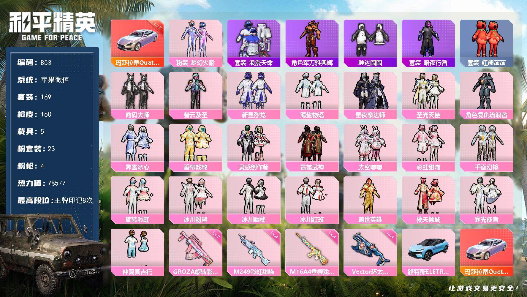 [15935254]苹果 微信-23粉装-4特效呛-5载具-6粉色飞行器-78577热力值-8王牌印记-169套装-160呛皮 【红色载具】:玛莎拉蒂quattropte(幻星粉)二级 【热门品类】:粉装-梦幻火箭,套装-浪漫天命,角色-军刀雅典娜,套装-胖达圆圆,套装-暗夜行者,套装-红熊茄茄 【粉色套装】:粉装-数码大师,粉装-梦幻火箭,粉装-彗云及圣,粉装-新星烈龙,粉装-海盐物语,粉装-星夜魔法师,粉装-圣光天使,角色-复仇流浪者,粉装-霁雪冰心,粉装-垂柳戏鸭,粉装-灵感创作师,粉装-霓裳武神,粉装-太空嘟嘟,粉装-彩虹甜喵,粉装-千面幻镜,粉装-旋转彩虹,粉装-冰川粉黛,粉装-冰川幽秘,粉装-冰川红玫,粉装-盖世英雄,粉装-桃夭倾城,粉装-寒光使者,粉装-仲夏莫吉托 【粉色呛皮等级】:m16a4-垂柳戏鸭四级,groza-旋转彩虹七级,vect-环太平洋四级,m249-彩虹甜喵四级 【粉色载具】:路特斯eletre(冰川蓝),玛莎拉蒂quattropte(幻星粉),玛莎拉蒂quattropte(夜幕蓝),玛莎拉蒂ghibli(金),双人摩托-梦幻火箭 【粉色呛皮】:m16a4-垂柳戏鸭,groza-旋转彩虹,vect-环太平洋,m249-彩虹甜喵 【粉色飞行器】:梦幻火箭飞行器,相思残雪飞行器,星夜魔法师飞行翼,太空嘟嘟飞行器,千面幻镜飞行器,冰川粉黛飞行器 【粉色降落伞】:未来战士降落伞,梦幻火箭降落伞,星之彼岸降落伞,相思残雪降落伞,洛神天依降落伞,流星咚咚降落伞,星夜魔法师降落伞,圣光天使降落伞,妙趣可丽降落伞,环太平洋降落伞,垂柳戏鸭降落伞,灵感创作师降落伞,太空嘟嘟降落伞,彩虹甜喵降落伞,千面幻镜降落伞,旋转彩虹降落伞,冰川粉黛降落伞,桃夭倾城降落伞,海螺星光降落伞,仲夏莫吉托降落伞,小叽联名款降落伞,霁蓝缠春降落伞 【稀有套装】:套装-雪国风尚,套装-书海巡游,套装-画境星梦,套装-琴音绮想,角色-月烬之祷 【稀有呛皮】:akm-彩虹符号,akm-星之彼岸,akm-环太平洋,akm-破晓战魂,akm-龙的传人,m16a4-幻世战舞者,m16a4-甜心亚梦,m16a4-红色方程式,m16a4-蓝色火焰,scar-l-炫彩节奏,scar-l-玉兔迎春,scar-l-红色方程式,m416-圣诞惊喜,m416-暗夜行者,m416
