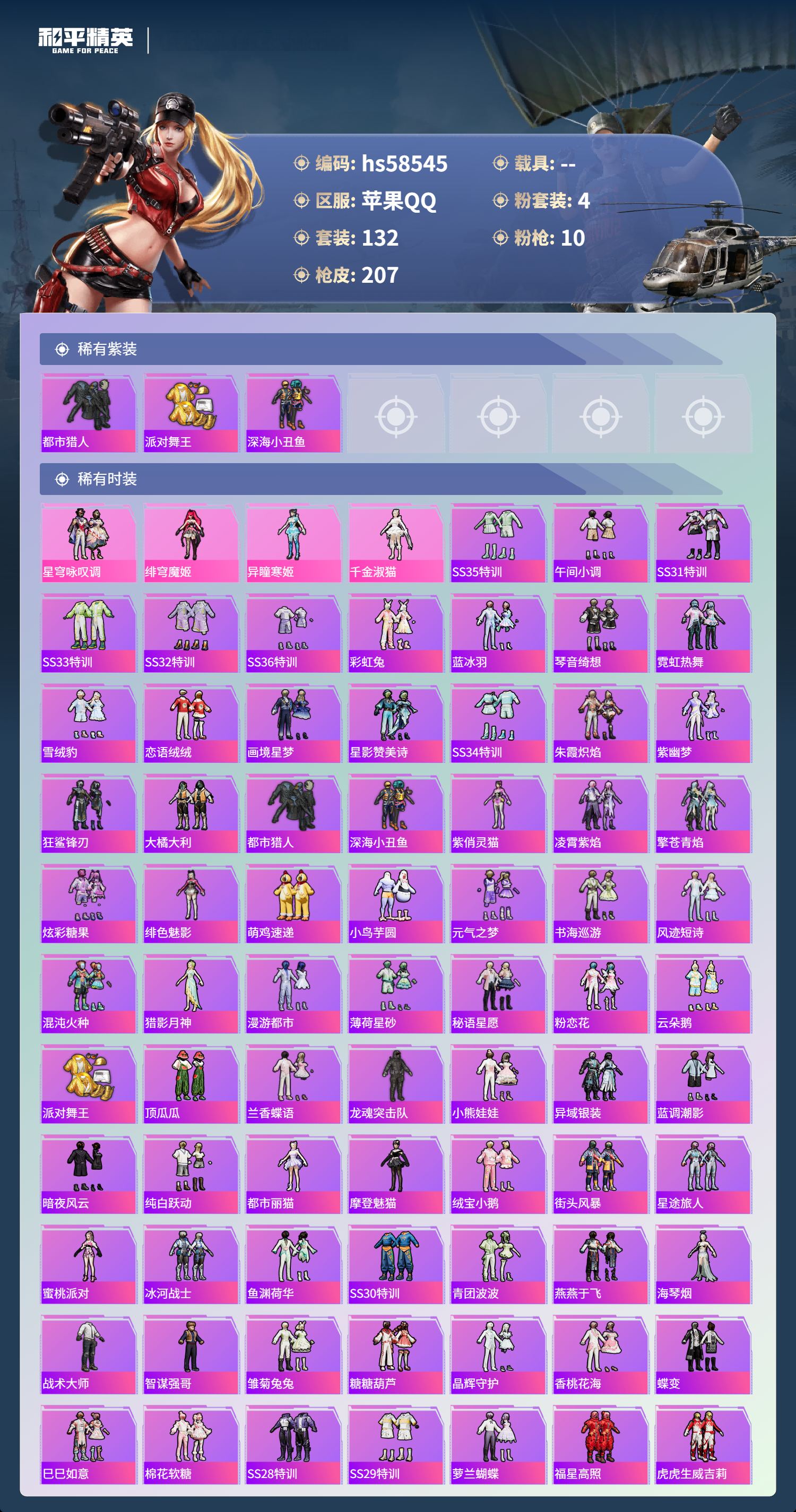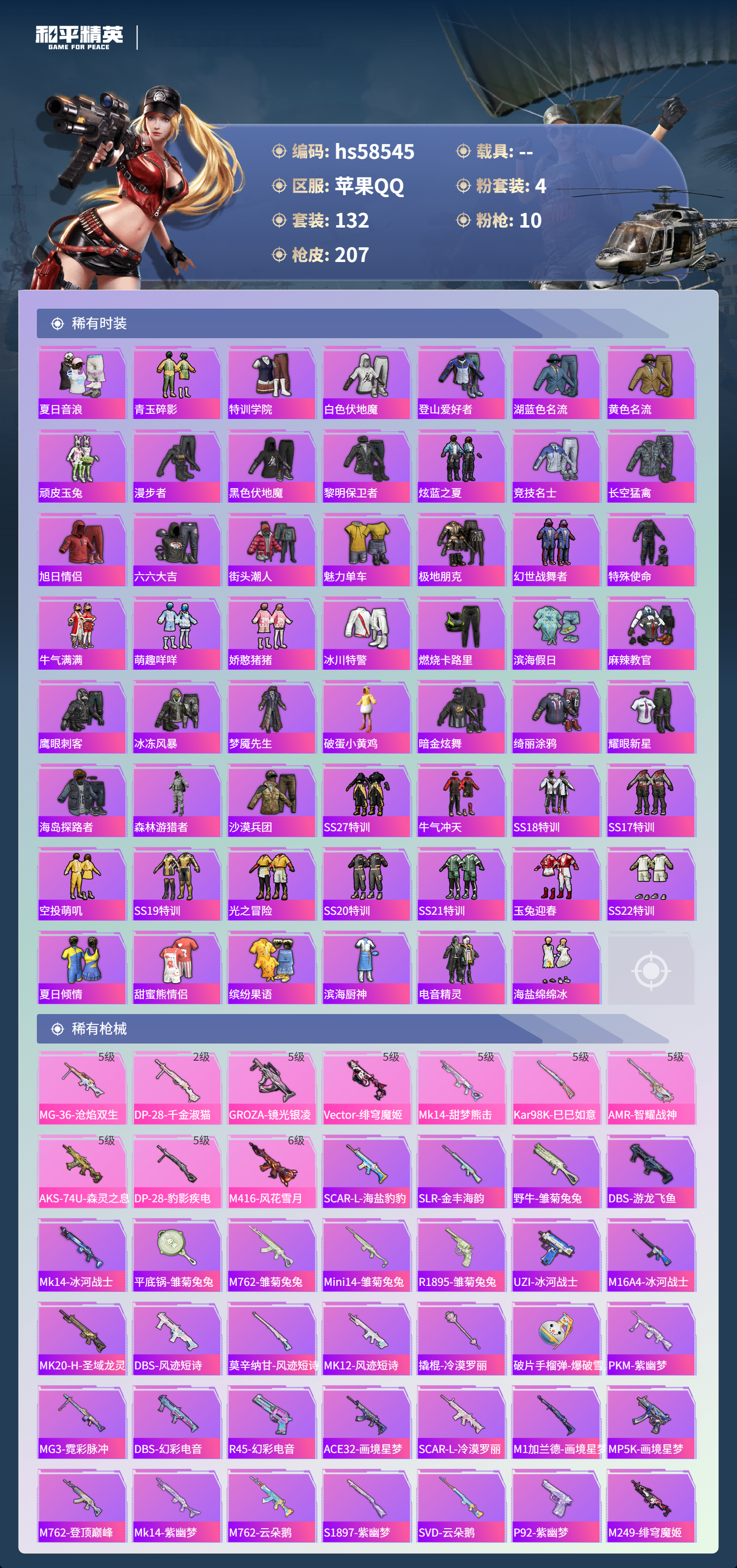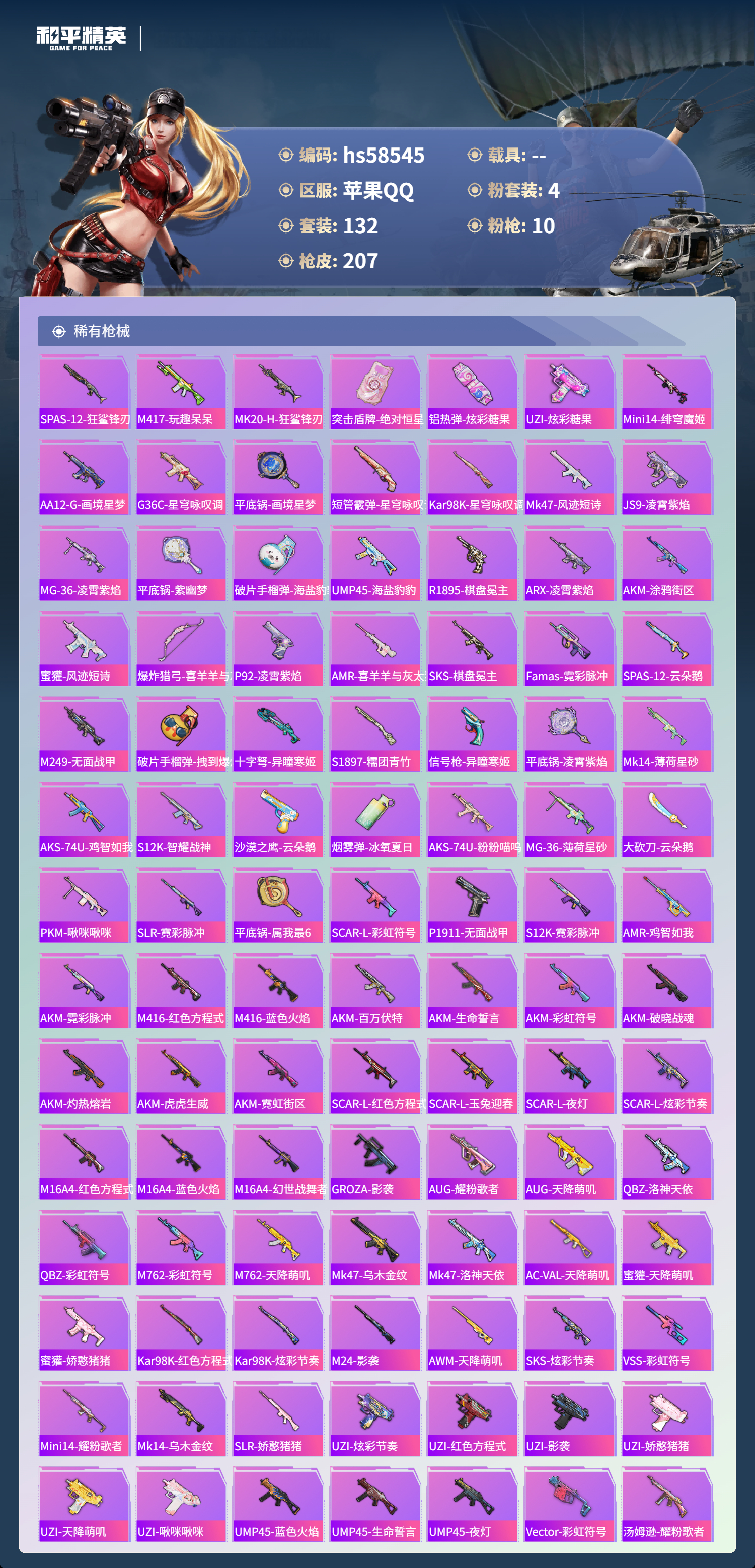 hs58545 苹果手q-14王牌印记-4粉装-10特效呛-62282热力值-132套装-207呛皮【4粉装】角色-绯穹魔姬套装-星穹咏叹调角色-异瞳寒姬角色-千金淑猫【10特效呛】dp-28-豹影疾电/5级mk14-甜梦熊击/5级kar98k-巳巳如意/5级dp-28-千金淑猫/2级amr-智耀战神/5级groza-镜光银凌/5级vect-绯穹魔姬/5级aks-74u