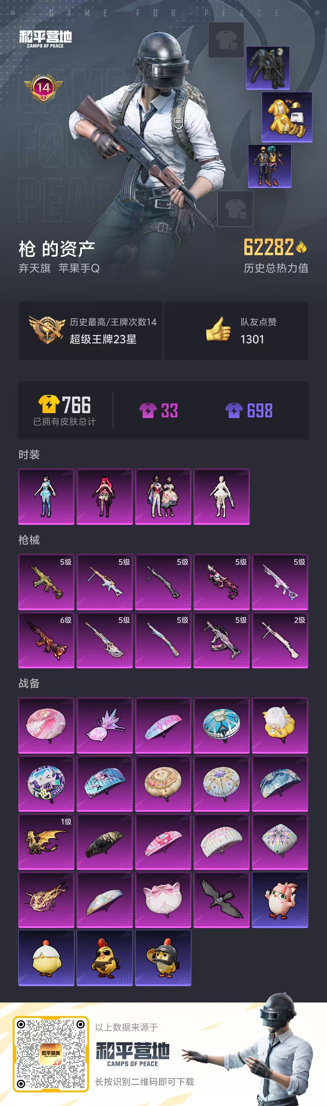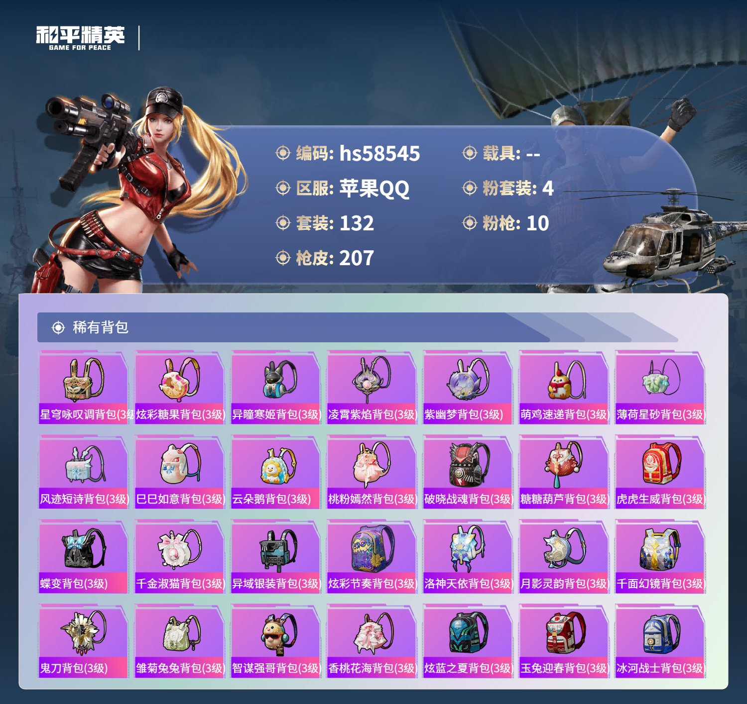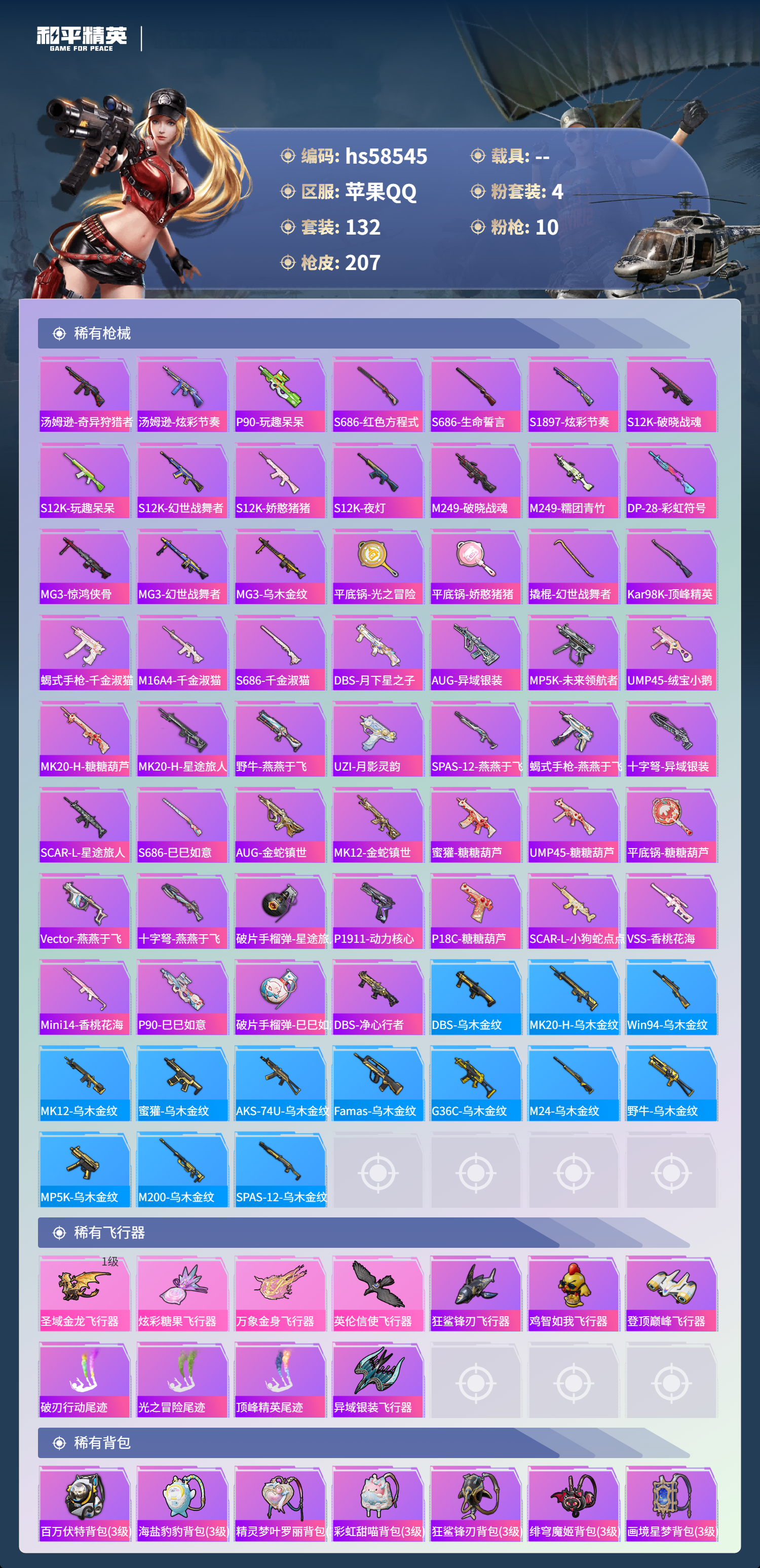 hs58545 苹果手q-14王牌印记-4粉装-10特效呛-62282热力值-132套装-207呛皮【4粉装】角色-绯穹魔姬套装-星穹咏叹调角色-异瞳寒姬角色-千金淑猫【10特效呛】dp-28-豹影疾电/5级mk14-甜梦熊击/5级kar98k-巳巳如意/5级dp-28-千金淑猫/2级amr-智耀战神/5级groza-镜光银凌/5级vect-绯穹魔姬/5级aks-74u