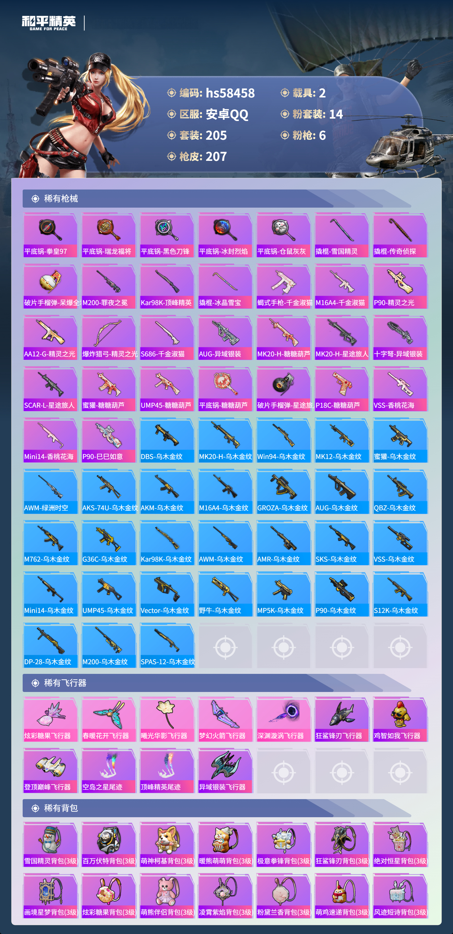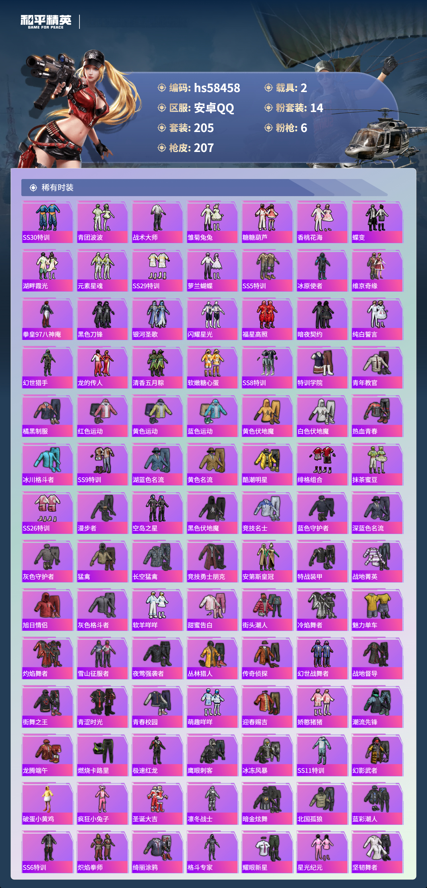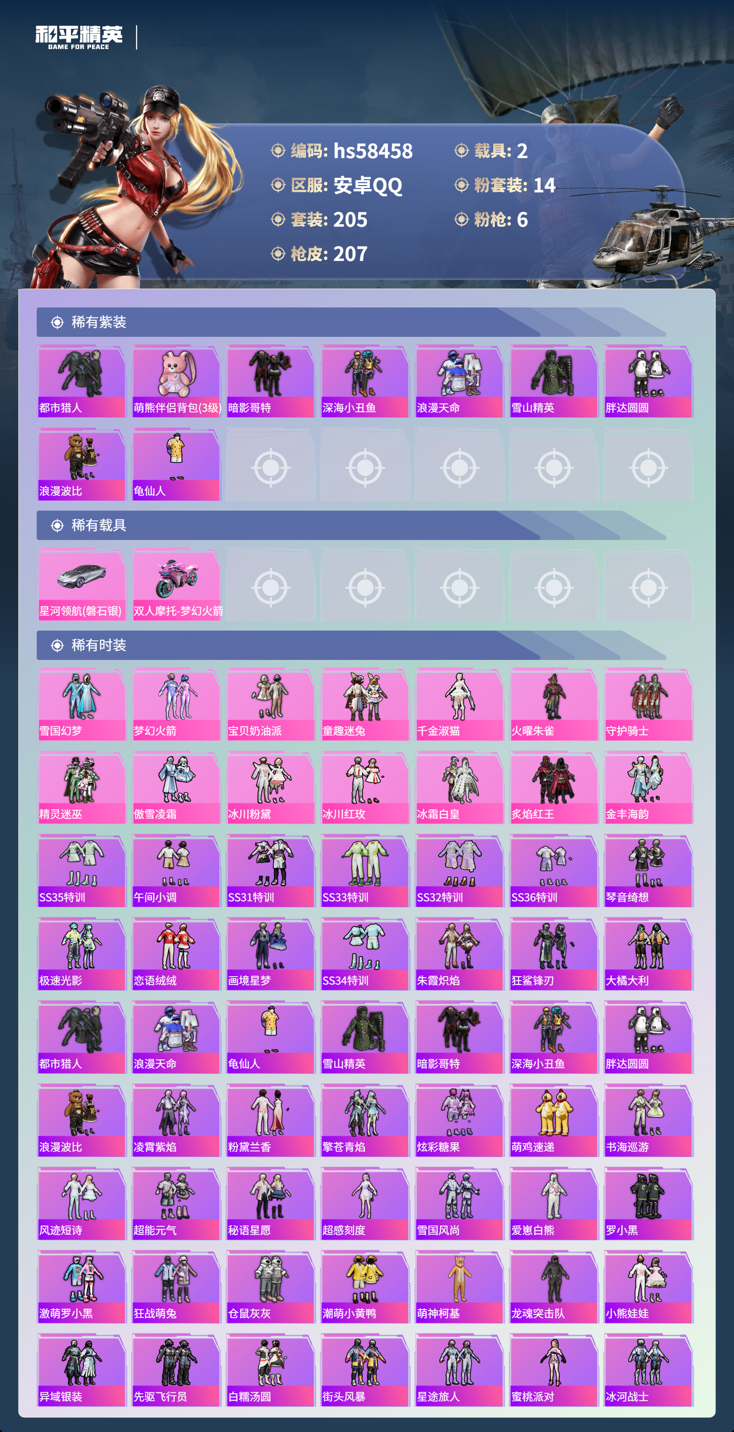 2载具-205套装-207呛皮-hs58458 安卓手q-15王牌印记-14粉装-6特效呛-2载具-77319热力值-205套装-207呛皮-2卓越印记-1传奇印记【14粉装】套装-傲雪凌霜套装-冰川红玫套装-火曜朱雀套装-冰霜白皇套装-宝贝奶油派套装-炙焰红王套装-雪国幻梦套装-金丰海韵套装-冰川粉黛套装-守护骑士套装-童趣迷兔套装-精灵迷巫角色-千金淑猫套装-梦幻火箭【6特效呛】scar-l-童