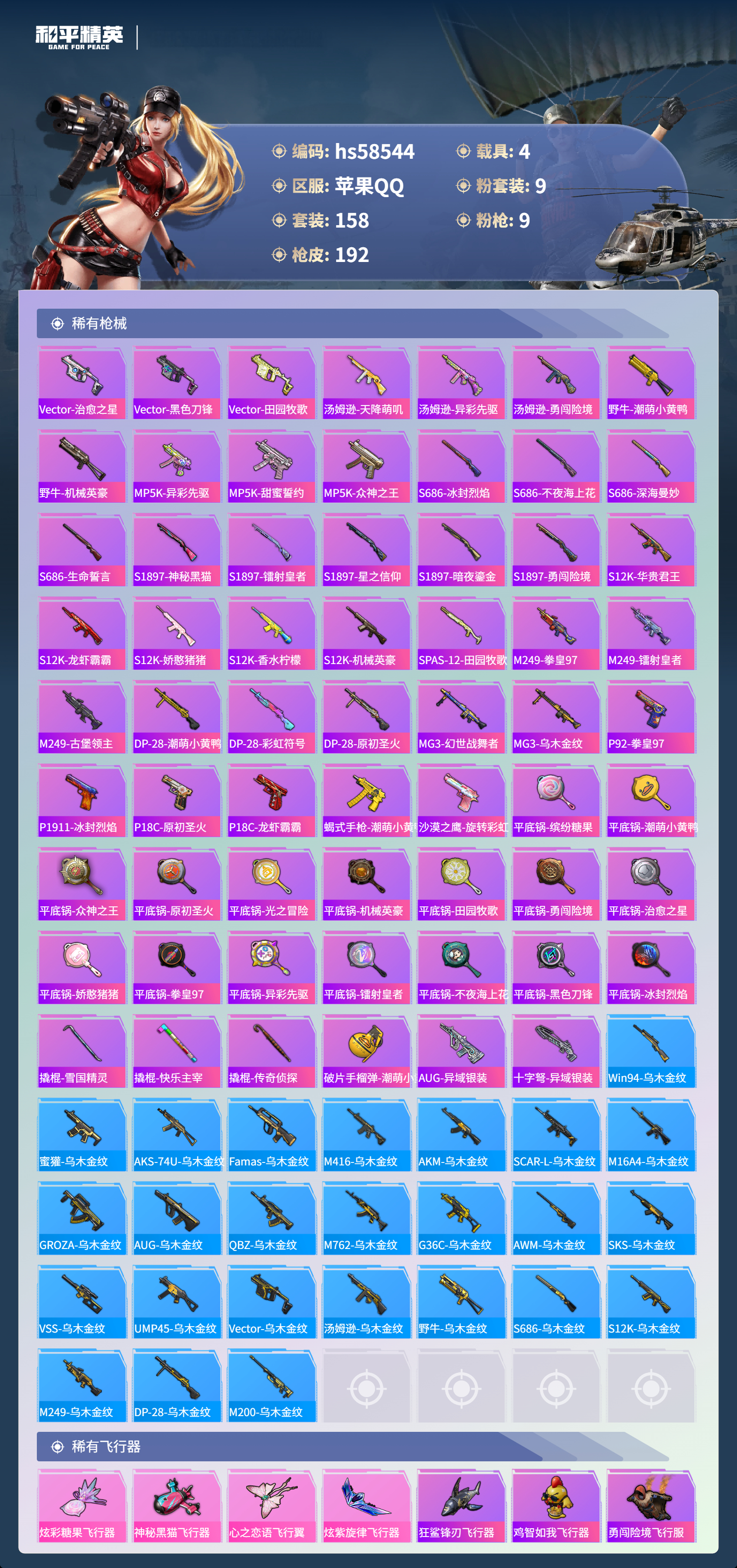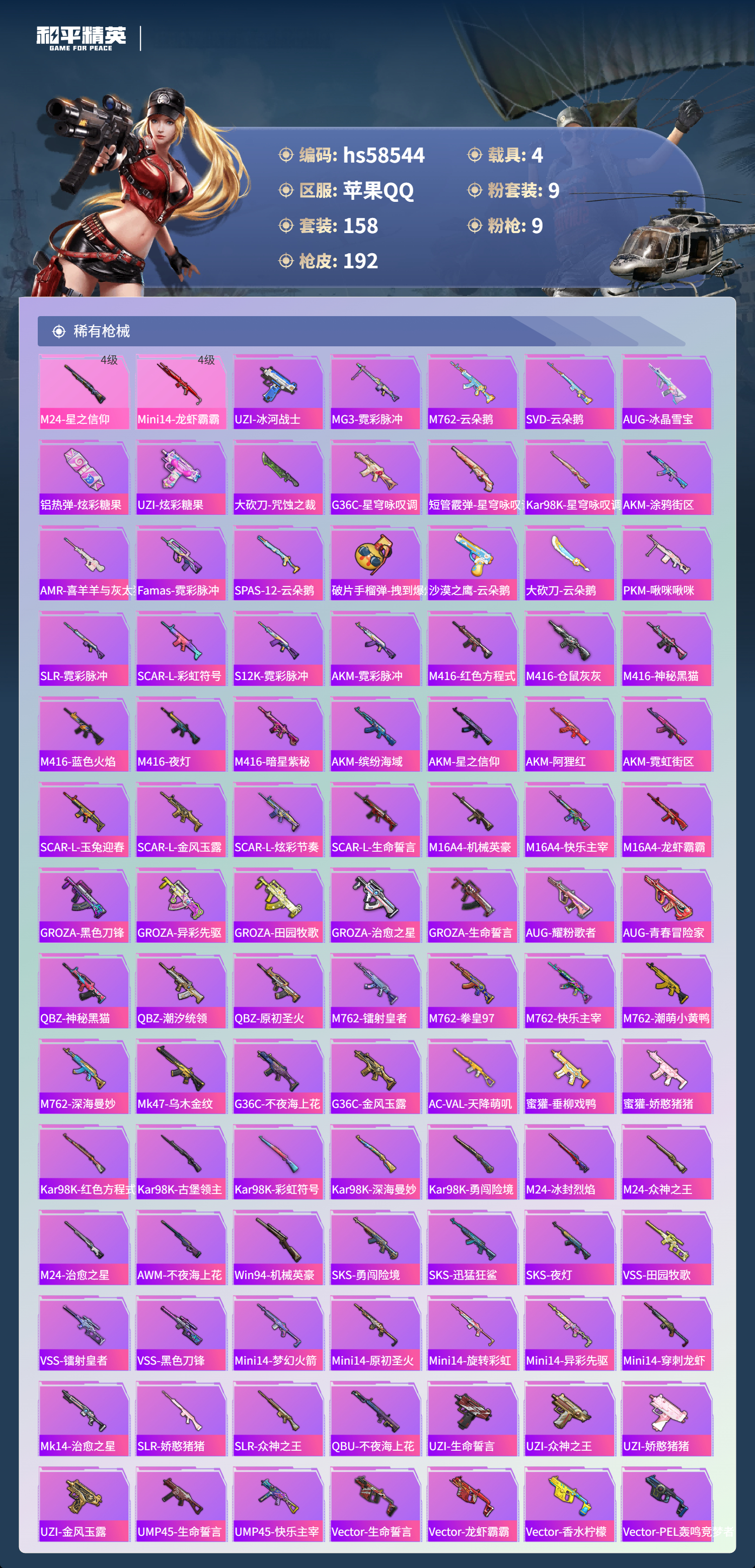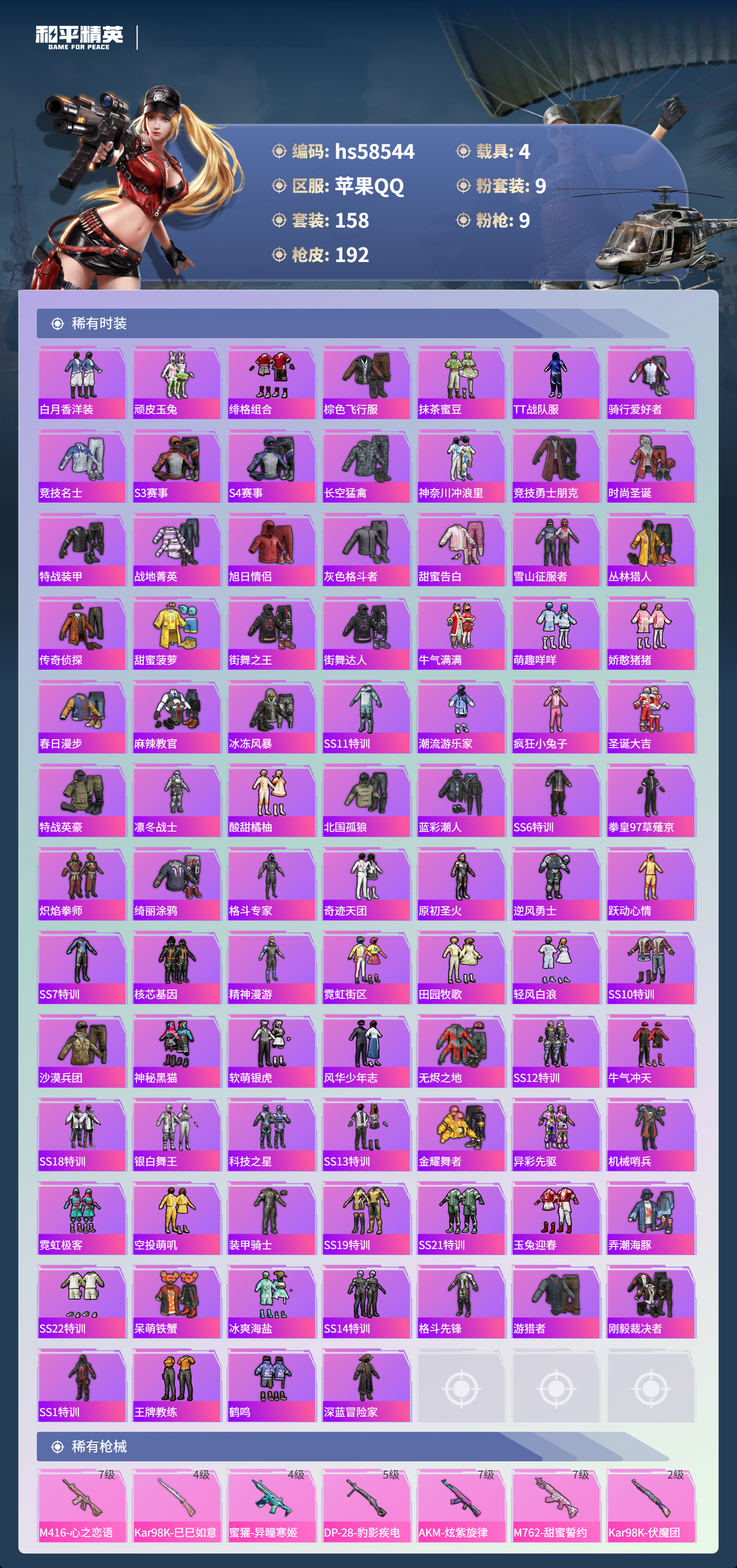 4载具-158套装-192呛皮-hs58544 苹果手q-5王牌印记-9粉装-9特效呛-4载具-73098热力值-158套装-192呛皮-2卓越印记-2传奇印记【9粉装】套装-金属狂野套装-麻辣鲜香锅套装-狩月元帅套装-暗星紫秘套装-古堡领主套装-彗云及圣套装-暗夜鎏金套装-金风玉露套装-苍蓝魅影【9特效呛】akm-炫紫旋律/7级m24-星之信仰/4级dp-28-豹影疾电/5级m762-甜蜜誓约/7级