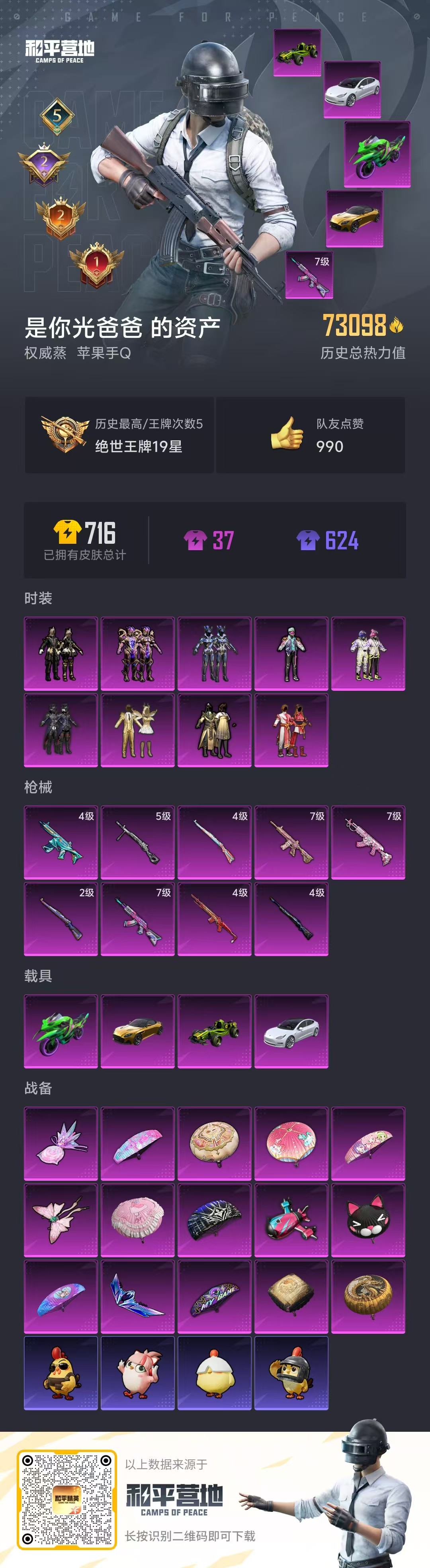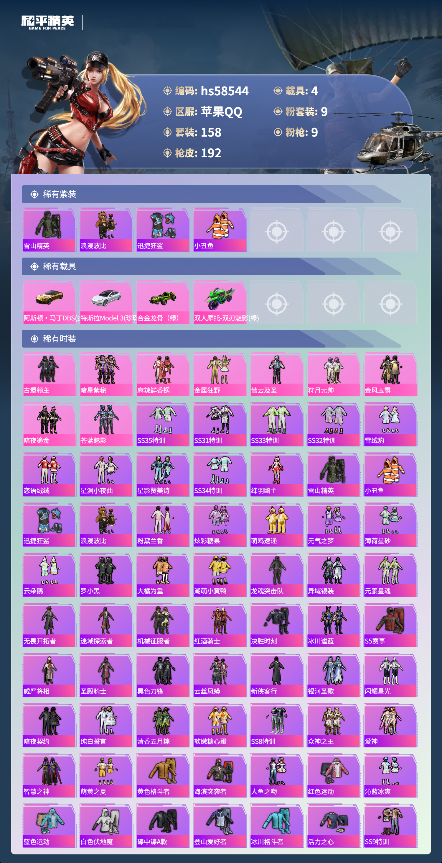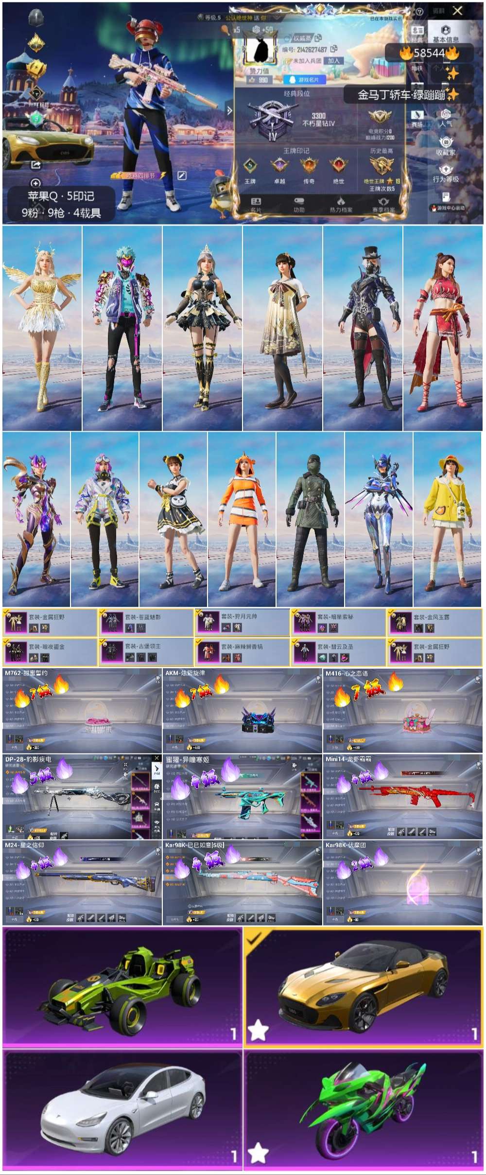 4载具-158套装-192呛皮-hs58544 苹果手q-5王牌印记-9粉装-9特效呛-4载具-73098热力值-158套装-192呛皮-2卓越印记-2传奇印记【9粉装】套装-金属狂野套装-麻辣鲜香锅套装-狩月元帅套装-暗星紫秘套装-古堡领主套装-彗云及圣套装-暗夜鎏金套装-金风玉露套装-苍蓝魅影【9特效呛】akm-炫紫旋律/7级m24-星之信仰/4级dp-28-豹影疾电/5级m762-甜蜜誓约/7级