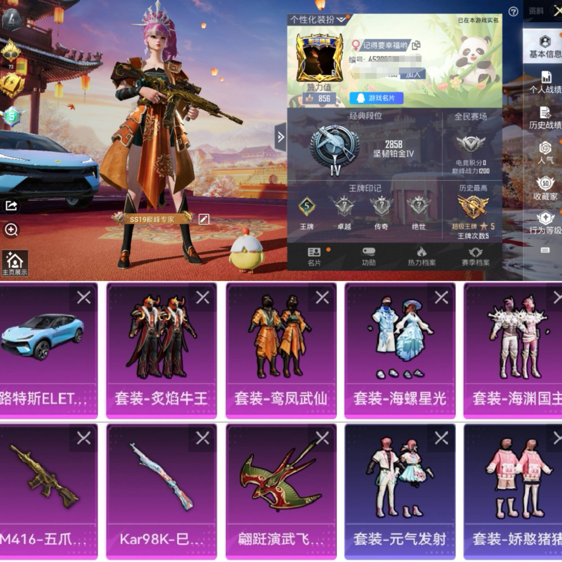 [6700981]h5632 有二次 安卓q-段位铂金 5印记 98套装142呛皮 【1载具】 路特斯eletre冰川蓝 【2特效】 m416-五爪金龙 7级 kar98k-巳巳如意 5级 【4粉装】 海渊国主 海螺星光 鸾凤武仙 炙焰牛王 【1飞行器】 蹁跹演武飞行器 【热门】 元气发射 熠彩粉晶 和煦暖阳 田园牧歌 轻风白浪 娇憨猪猪