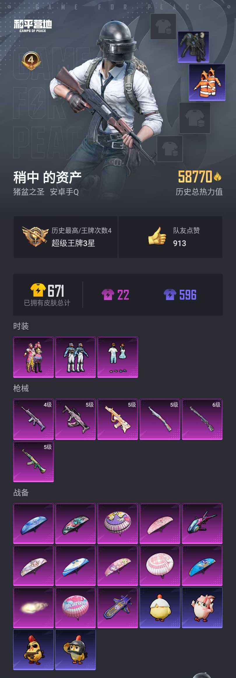 【和平精英】【lyhp20338】3粉装,6特效呛,0载具,历史最高段位:超级王牌3星 王牌印记4次 热力值:58770,140套装,198呛械,209装备,98战备;套装:套装-缤纷油彩,套装-仲夏莫吉托,套装-未来领航者,套装-特训学院,套装-猎鹰,套装-青年教官,套装-橘黑制服,套装-红色运动,套装-黄色运动,套装-蓝色运动,套装-黄色伏地魔,套装-白色伏地魔,套装-黑色伏地魔,套装-骑行爱好者,套装-竞技名士,套装-深蓝色名流,套装-酒红色名流,套装-湖蓝色名流,套装-黄色名流,套装-猛禽,套装-长空猛禽,套装-黎明保卫者,套装-海岛探路者,套装-冷焰舞者,套装-灼焰舞者,套装-都市猎人,套装-特战装甲,套装-战地督导,套装-滨海假日,套装-鹰眼刺客,套装-完美偶像,套装-人气偶像,套装-幻影武者,套装-街头潮人,套装-蓝彩潮人,套装-魅力单车,套装-绮丽涂鸦,套装-竞技达人朋克,套装-破晓战魂,套装-森林游猎者,套装-都市魅力,套装-热血青春,套装-酷潮明星,套装-极地朋克,套装-幻世战舞者,套装-缤纷果语,套装-滨海厨神,套装-冰川特警,套装-幻影公爵,套装-极速红龙,套装-格斗先锋,套装-海上生明月,套装-麻辣教官,套装-小丑鱼,套装-破蛋小黄鸡,套装-疯狂小兔子,套装-凛冬战士,套装-鹤鸣,套装-ss10特训,套装-ss8特训,套装-萌黄之夏,套装-夏日音浪,套装-ss9特训,套装-风华少年志,套装-神秘舞者,套装-探宝勇士,套装-本愿之火,套装-牛气满满,套装-ss11特训,套装-青春冒险家,套装-潮流游乐家,套装-原初圣火,套装-逆风勇士,套装-萌趣颜团子,套装-战术大师,套装-ss12特训,套装-牛气冲天,套装-ss18特训,套装-耀粉歌者,套装-飞行日记,套装-ss13特训,套装-竞技角斗士,套装-ss14特训,套装-吉莉礼服,套装-星梦畅游,套装-ss15特训,套装-ss16特训,套装-ss17特训,套装-极乐追光,套装-福星高照,套装-空投萌叽,套装-ss19特训,套装-炫蓝之夏,套装-ss20特训,套装-ss21特训,套装-玉兔迎春,套装-ss22特训,套装-光之冒险,套装-绯格组合,套装-ss23特训,套装-王牌教练,套装-ss24特训,套装-龟仙人,套装-ss25特训,套装-惊鸿侠骨,套装-锦衣飞扬,套装-绝对偶像,套装-龙的传人,套装-冰河战士,套装-ss26特训,套装-快闪甜心,套装-春光漫游,套装-焰鹰斗篷,套装-幽夜迷踪,套装-幻羽潜行,套装-ss27特训,套装-恋语绒绒,套装-老实芭蕉,套装-ss28特训,角色-情公主,套装-街头风暴,套装-海盐绵绵冰,套装-蝶变,套装-创世·追猎,套装-ss29特训,套装-雏菊兔兔,套装-萝兰蝴蝶,套装-闪电轻猫,角色-许七安,套装-ss30特训,套装-ss31特训,套装-鱼渊荷华,套装-燕燕于飞,套装-巳巳如意,套装-ss32特训,套装-琴音绮想,套装-画境星梦,套装-书海巡游,套装-ss36特训,套装-雪国风尚;呛皮:5级groza-镜光银凌,groza-彩虹符号,groza-海盐豹豹,groza-乌木金纹,m16a4-蓝色火焰,m16a4-红色方程式,m16a4-凝视深渊,m16a4-幻世战舞者,m16a4-冰河战士,5级akm-绿萝繁花,akm-灼热熔岩,akm-生命誓言,akm-影袭,akm-破晓战魂,akm-霓虹街区,akm-夜灯,akm-彩虹符号,akm-萌趣颜团子,akm-虎虎生威,akm-龙的传人,akm-乌木金纹,m416-夜灯,m416-蓝色火焰,m416-红色方程式,m416-糯团青竹,m416-乌木金纹,q-原初圣火,q-彩虹符号,q-未来歌姬,q-乌木金纹,ac-val-乌木金纹,ac-val-天降萌叽,ac-val-闲梦青缨,ac-val-快闪甜心,ace32-画境星梦,ace32-冰晶雪宝,蜜獾-天降萌叽,蜜獾-精灵梦叶罗丽,蜜獾-乌木金纹,m762-牛气冲天,m762-天降萌叽,m762-雏菊兔兔,m762-乌木金纹,mk47-青春冒险家,mk47-洛神天依,mk47-乌木金纹,5级aug-暖羊咩咩,aug-甜蜜菠萝,aug-幻影战神,aug-耀粉歌者,aug-青春冒险家,aug-天降萌叽,4级scar-l-梦幻火箭,scar-l-生命誓言,scar-l-红色方程式,scar-l-炫彩节奏,scar-l-玉兔迎春,scar-l-星途旅人,scar-l-海盐豹豹,scar-l-乌木金纹,g36c-不夜海上花,g36c-乌木金纹,5级kar98k-巳巳如意,kar98k-红色方程式,kar98k-影袭,kar98k-梦幻火箭,kar98k-彩虹符号,kar98k-欢乐麻酱,kar98k-炫彩节奏,kar98k-乌木金纹,m24-炫彩节奏,m24-乌木金纹,awm-超新星,awm-天降萌叽,awm-焰鹰斗篷,awm-乌木金纹,6级莫辛纳甘-未来领航者,莫辛纳甘-乌木金纹,amr-乌木金纹,m200-惊鸿侠骨,m200-乌木金纹,qbu-不夜海上花,qbu-青春冒险家,mk14-乌木金纹,mk14-冰河战士,mk14-阳光菠萝,vss-香桃花海,vss-乌木金纹,m1加兰德-画境星梦,mk20-h-快闪甜心,mk20-h-乌木金纹,mini14-梦幻火箭,mini14-原初圣火,mini14-炫彩节奏,mini14-耀粉歌者,mini14-香桃花海,mini14-雏菊兔兔,mini14-乌木金纹,mk12-乌木金纹,m417-惊鸿侠骨,slr-彩虹符号,汤姆逊-奇异狩猎者,汤姆逊-幻影战神,汤姆逊-耀粉歌者,汤姆逊-炫彩节奏,汤姆逊-暗夜鎏金,汤姆逊-乌木金纹,vect-生命誓言,vect-夜灯,vect-彩虹符号,vect-暗夜玫瑰,vect-焰鹰斗篷,vect-燕燕于飞,野牛-青春冒险家,野牛-雏菊兔兔,野牛-燕燕于飞,野牛-乌木金纹,ump45-蓝色火焰,ump45-生命誓言,ump45-涂山之恋,mp5k-画境星梦,mp5k-乌木金纹,uzi-红色方程式,uzi-幻影战神,uzi-炫彩节奏,uzi-天降萌叽,uzi-冰河战士,uzi-啾咪啾咪,uzi-幻影飞狐,uzi-乌木金纹,p90-快闪甜心,p90-玩趣呆呆,p90-巳巳如意,p90-乌木金纹,s12k-幻影战神,s12k-破晓战魂,s12k-垂柳戏鸭,s12k-幻世战舞者,s12k-玩趣呆呆,s686-红色方程式,s686-生命誓言,s686-不夜海上花,s686-巳巳如意,s1897-神秘黑猫,s1897-炫彩节奏,s1897-精灵梦叶罗丽,s1897-乌木金纹,dbs-彩虹符号,dbs-焰鹰斗篷,dbs-乌木金纹,spas-12-燕燕于飞,spas-12-狂鲨锋刃,spas-12-乌木金纹,aa12-g-精灵之光,aa12-g-画境星梦,mg-36-薄荷星砂,m249-破晓战魂,m249-彩虹符号,m249-莲影清波,m249-冰晶雪