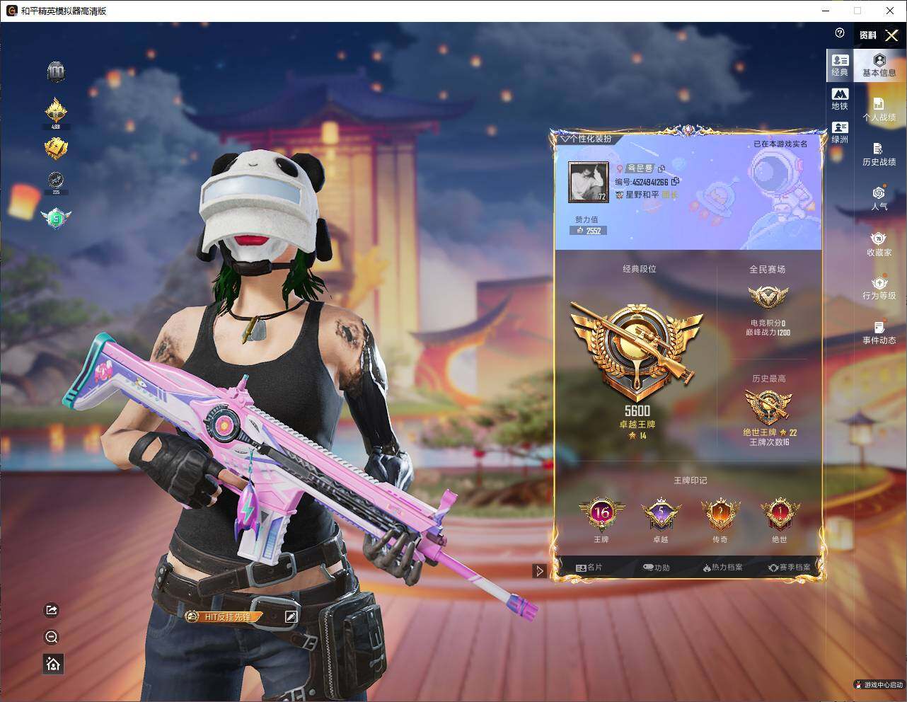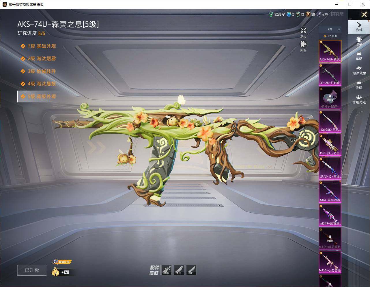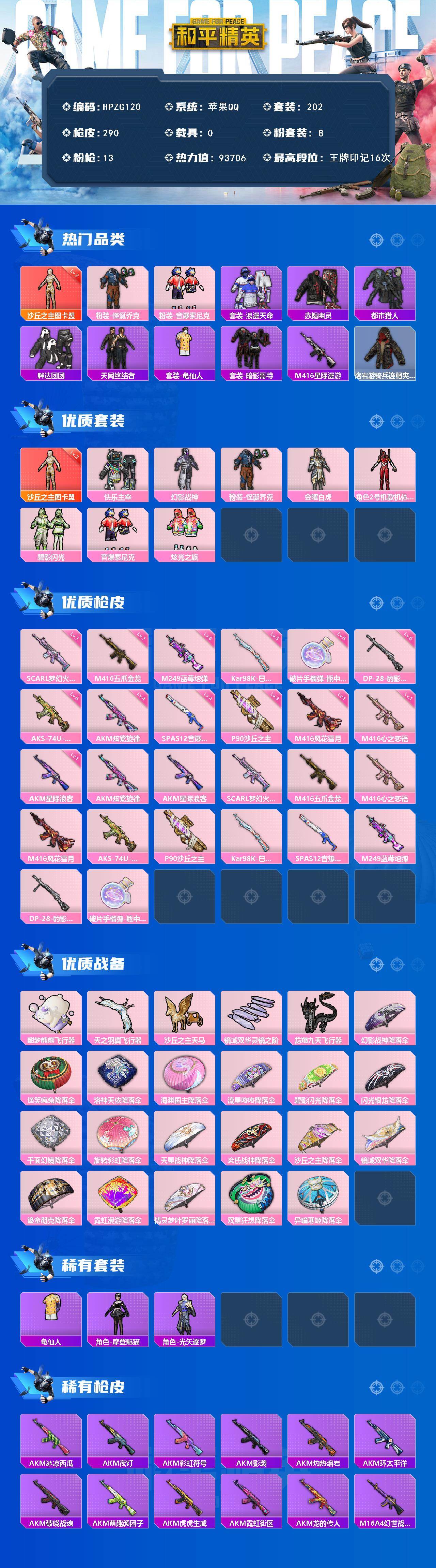 【zg120】202套装/呛械13/装备398/战备198/王牌印记16/热力值93706/四级akm-炫紫旋律/一级akm-星际浪客/七级scar-l-梦幻火箭/七级m416-五爪金龙/一级m416-心之恋语/一级m416-风花雪月/五级aks-74u-森灵之息/三级p90-沙丘之主/五级kar98k-巳巳如意/四级spas-12-音爆索尼克/六级m249-蓝莓炮弹/五级dp-28-豹影