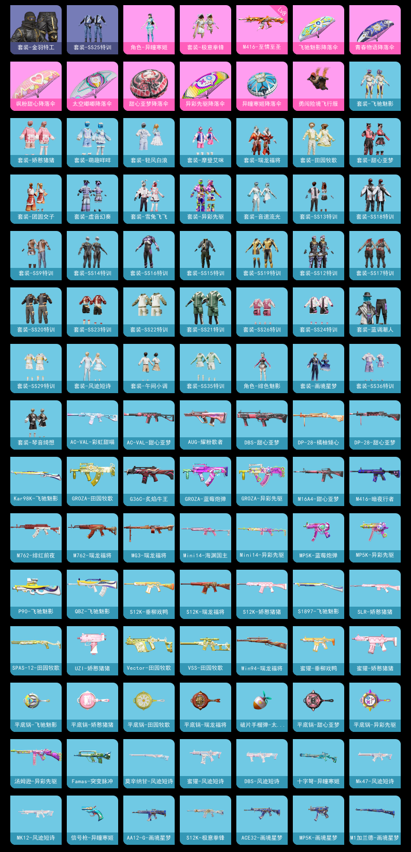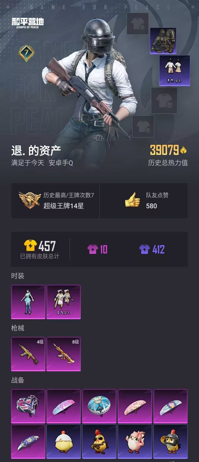 【和平精英】【lyhp20530】2粉装,2特效呛,0载具,历史最高段位:超级王牌14星 王牌印记7次 热力值:39079,95套装,134呛械,131装备,76战备;套装:角色-异瞳寒姬,套装-极意拳锋,套装-特训学院,套装-红色运动,套装-黄色运动,套装-蓝色运动,套装-黄色伏地魔,套装-白色伏地魔,套装-黑色伏地魔,套装-骑行爱好者,套装-竞技名士,套装-湖蓝色名流,套装-黄色名流,套装-猛禽,套装-长空猛禽,套装-黎明保卫者,套装-六六大吉,套装-灼焰舞者,套装-战地菁英,套装-甜蜜告白,套装-滨海假日,套装-沙漠毒蛇,套装-千禧之恋,套装-魅力单车,套装-野性战心,套装-金羽特工,套装-热血青春,套装-酷潮明星,套装-幻世战舞者,套装-蓝调潮人,套装-青涩时光,套装-龙魂突击队,套装-格斗先锋,套装-麻辣教官,套装-破蛋小黄鸡,套装-疯狂小兔子,套装-军械专家,套装-霓虹街区,套装-夏日音浪,套装-ss9特训,套装-探宝勇士,套装-牛气满满,套装-ss12特训,套装-牛气冲天,套装-ss18特训,套装-飞行日记,套装-ss13特训,套装-ss14特训,套装-ss15特训,套装-ss16特训,套装-ss17特训,套装-瑞龙福将,套装-团圆交子,套装-福星高照,套装-雪兔飞飞,套装-虎虎生威吉莉,套装-异彩先驱,套装-霓虹极客,套装-ss19特训,套装-飞驰魅影,套装-音速流光,套装-炫蓝之夏,套装-ss20特训,套装-甜心亚梦,套装-虚音幻奏,套装-ss21特训,套装-萌趣咩咩,套装-娇憨猪猪,套装-玉兔迎春,套装-ss22特训,套装-田园牧歌,套装-轻风白浪,套装-绯格组合,套装-ss23特训,套装-摩登艾咪,套装-柠萌假日,套装-ss24特训,套装-龟仙人,套装-涂山之恋,套装-ss25特训,套装-冰河战士,套装-ss26特训,套装-老实芭蕉,套装-蝶变,套装-ss29特训,角色-绯色魅影,套装-青翼流星,套装-ss35特训,套装-午间小调,套装-风迹短诗,套装-琴音绮想,套装-画境星梦,套装-ss36特训,角色-霜刃之御,套装-萌鸡速递;呛皮:akm-破晓战魂,akm-彩虹符号,akm-龙的传人,akm-橘猫汽水,q-飞驰魅影,蜜獾-娇憨猪猪,蜜獾-垂柳戏鸭,蜜獾-天降萌叽,蜜獾-风迹短诗,ac-val-甜心亚梦,ac-val-乌木金纹,ac-val-彩虹甜喵,ac-val-天降萌叽,8级m416-至情至圣,m416-蓝色火焰,m416-红色方程式,m416-暗夜行者,m416-糯团青竹,m762-绯红前夜,m762-牛气冲天,m762-瑞龙福将,m762-天降萌叽,g36c-炙焰牛王,g36c-乌木金纹,aug-耀粉歌者,groza-蓝莓炮弹,groza-异彩先驱,groza-田园牧歌,m16a4-红色方程式,m16a4-甜心亚梦,m16a4-幻世战舞者,m16a4-冰河战士,scar-l-红色方程式,scar-l-炫彩节奏,scar-l-玉兔迎春,mk47-乌木金纹,mk47-风迹短诗,ace32-画境星梦,ace32-冰晶雪宝,famas-突变脉冲,awm-天降萌叽,awm-乌木金纹,win94-瑞龙福将,win94-乌木金纹,m24-炫彩节奏,m24-乌木金纹,kar98k-红色方程式,kar98k-炫彩节奏,kar98k-飞驰魅影,kar98k-乌木金纹,莫辛纳甘-乌木金纹,莫辛纳甘-风迹短诗,amr-乌木金纹,slr-娇憨猪猪,slr-霓彩脉冲,mk14-乌木金纹,mk14-冰河战士,mk14-阳光菠萝,mk14-紫晶流影,mini14-海渊国主,mini14-异彩先驱,mini14-涂山之恋,sks-炫彩节奏,mk12-风迹短诗,mk12-乌木金纹,m1加兰德-画境星梦,mk20-h-乌木金纹,vss-田园牧歌,vss-香桃花海,vect-生命誓言,vect-田园牧歌,mp5k-蓝莓炮弹,mp5k-异彩先驱,mp5k-画境星梦,uzi-红色方程式,uzi-炫彩节奏,uzi-娇憨猪猪,uzi-天降萌叽,uzi-冰河战士,uzi-啾咪啾咪,野牛-乌木金纹,汤姆逊-炫彩节奏,汤姆逊-异彩先驱,汤姆逊-天降萌叽,汤姆逊-乌木金纹,p90-飞驰魅影,p90-乌木金纹,4级aks-74u-森灵之息,ump45-生命誓言,ump45-涂山之恋,s1897-炫彩节奏,s1897-飞驰魅影,s1897-乌木金纹,s12k-瑞龙福将,s12k-娇憨猪猪,s12k-垂柳戏鸭,s12k-幻世战舞者,s12k-玩趣呆呆,s12k-极意拳锋,s686-红色方程式,s686-生命誓言,s686-彩虹符号,dbs-甜心亚梦,dbs-风迹短诗,spas-12-田园牧歌,spas-12-乌木金纹,aa12-g-橘猫汽水,aa12-g-画境星梦,pkm-啾咪啾咪,m249-彩虹符号,m249-糯团青竹,m249-冰晶雪宝,m249-乌木金纹,dp-28-彩虹符号,dp-28-橘柚倾心,dp-28-甜心亚梦,mg-36-薄荷星砂,mg3-瑞龙福将,mg3-幻世战舞者,mg3-乌木金纹,信号呛-异瞳寒姬,平底锅-瑞龙福将,平底锅-异彩先驱,平底锅-飞驰魅影,平底锅-甜心亚梦,平底锅-娇憨猪猪,平底锅-田园牧歌,平底锅-空岛之星,平底锅-画境星梦,撬棍-冰晶雪宝,破片手留单-太空嘟嘟,破片手留单-星途旅人,铝热弹-炫彩糖果,十子怒-异瞳寒姬;降落伞:火焰蝠人飞行服,勇闯险境飞行服,红色滑翔尾迹,顶峰精英尾迹; 详情看图(地铁满天赋)2粉装2特效呛 8级m4至情至圣