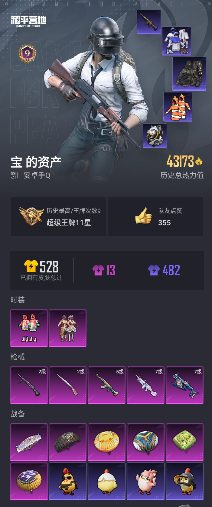 【和平精英】【lyhp20536】2粉装,5特效呛,0载具,历史最高段位:超级王牌11星 王牌印记9次 热力值:43173,112套装,146呛械,161装备,84战备;套装:套装-草莓生巧,套装-炫光之旅,套装-猎鹰,套装-黄色运动,套装-蓝色运动,套装-白色伏地魔,套装-竞技名士,套装-长空猛禽,套装-漫步者,套装-冷焰舞者,套装-刚毅裁决者,套装-水银刺客,套装-浪漫天命,套装-活力之心,套装-滨海假日,套装-鹰眼刺客,套装-冰冻风暴,套装-特战英豪,套装-蓝彩潮人,套装-神秘领域,套装-魅力单车,套装-夜莺强袭者,套装-野性战心,套装-金羽特工,套装-破晓战魂,套装-荣耀,套装-幻世战舞者,套装-清新柠檬,套装-蓝调潮人,套装-迅捷狂鲨,套装-呆萌铁蟹,套装-甜蜜熊情侣,套装-alan walker,套装-风暴特警,套装-冰川特警,套装-幻影公爵,套装-格斗先锋,套装-冷血极客,套装-海上生明月,套装-麻辣教官,套装-小丑鱼,套装-粉红小猪,套装-鹤鸣,套装-霓虹街区,套装-白熊同盟,套装-夏日音浪,套装-探宝勇士,套装-萌趣颜团子,套装-特种颜团子,套装-ss18特训,套装-竞技角斗士,套装-电音精灵,套装-ss16特训,套装-ss17特训,套装-瑞龙福将,套装-团圆交子,套装-福星高照,套装-豚鼠丹丹,套装-虎虎生威吉莉,套装-异彩先驱,套装-霓虹极客,套装-糖果砰砰,套装-空投萌叽,套装-ss19特训,套装-极速竞梦,套装-飞驰魅影,套装-音速流光,套装-炫蓝之夏,套装-ss20特训,套装-猎梦纪元,套装-甜心亚梦,套装-虚音幻奏,套装-醇脆可可,套装-ss21特训,套装-萌趣咩咩,套装-娇憨猪猪,套装-玉兔迎春,套装-ss22特训,套装-和煦暖阳,套装-田园牧歌,套装-轻风白浪,套装-光之冒险,套装-绯格组合,套装-ss23特训,套装-飞狐塔尔斯,套装-神气柴柴,套装-懵萌河马,套装-妙红点点,套装-幻彩翩翩,套装-王牌教练,套装-柠萌假日,套装-ss24特训,套装-龟仙人,套装-涂山之恋,套装-ss25特训,套装-惊鸿侠骨,套装-锦衣飞扬,套装-果汁能量,套装-龙的传人,套装-ss26特训,套装-快闪甜心,套装-春光漫游,套装-空岛之星,套装-明鸳圣池,套装-幻羽潜行,套装-ss27特训,套装-海盐绵绵冰,角色-狂花道·娜可露露,套装-ss33特训,套装-巳巳如意,套装-大橘大利,套装-薄荷星砂;呛皮:5级akm-绿萝繁花,akm-霓虹街区,akm-彩虹符号,akm-萌趣颜团子,akm-虎虎生威,akm-海渊国主,akm-环太平洋,akm-龙的传人,groza-影袭,groza-异彩先驱,groza-田园牧歌,groza-懵萌河马,mk47-百万伏特,mk47-乌木金纹,mk47-妙红点点,m762-绯红前夜,m762-瑞龙福将,m762-天降萌叽,aug-耀粉歌者,aug-天降萌叽,aug-紫晶流影,m416-夜灯,m416-绯红前夜,m416-黄金狮王,m416-糯团青竹,蜜獾-娇憨猪猪,蜜獾-天降萌叽,蜜獾-精灵梦叶罗丽,ac-val-甜心亚梦,ac-val-乌木金纹,ac-val-天降萌叽,ac-val-快闪甜心,scar-l-黄金龙骨,scar-l-玉兔迎春,scar-l-海盐豹豹,m16a4-甜心亚梦,m16a4-幻世战舞者,q-飞驰魅影,g36c-懵萌河马,g36c-乌木金纹,amr-妙红点点,amr-乌木金纹,m24-影袭,m24-奇异狩猎者,m24-未来战士,m24-炫彩节奏,m24-乌木金纹,莫辛纳甘-乌木金纹,莫辛纳甘-懵萌河马,m200-惊鸿侠骨,awm-焰鹰斗篷,win94-瑞龙福将,2级kar98k-巳巳如意,kar98k-金玉无双,kar98k-炫彩节奏,kar98k-飞驰魅影,kar98k-乌木金纹,slr-葫芦兄弟,slr-娇憨猪猪,mini14-春暖花开,mini14-异彩先驱,mini14-涂山之恋,sks-金玉无双,sks-炫彩节奏,sks-bearbrick,mk14-乌木金纹,m417-惊鸿侠骨,vss-粉色回忆,vss-星之彼岸,vss-田园牧歌,vss-彩虹符号,mk20-h-快闪甜心,mk20-h-星途旅人,汤姆逊-奇异狩猎者,汤姆逊-幻影战神,汤姆逊-异彩先驱,汤姆逊-天降萌叽,7级vect-环太平洋,vect-彩虹符号,vect-田园牧歌,vect-音爆索尼克,vect-焰鹰斗篷,vect-突变脉冲,uzi-影袭,uzi-炫彩节奏,uzi-娇憨猪猪,mp5k-异彩先驱,mp5k-飒粉甜心,mp5k-乌木金纹,ump45-夜灯,ump45-生命誓言,ump45-海渊国主,ump45-涂山之恋,p90-飞驰魅影,p90-快闪甜心,p90-乌木金纹,野牛-夜灯,野牛-乌木金纹,s12k-香水柠檬,s12k-瑞龙福将,s12k-娇憨猪猪,s12k-垂柳戏鸭,s12k-幻世战舞者,s12k-玩趣呆呆,s1897-百万伏特,s1897-炫彩节奏,s1897-飞驰魅影,s1897-乌木金纹,dbs-甜心亚梦,spas-12-田园牧歌,7级m249-彩虹甜喵,m249-妙红点点,2级dp-28-豹影疾电,dp-28-紫翼圣骑,dp-28-甜心亚梦,mg3-瑞龙福将,mg3-幻世战舞者,mg3-乌木金纹,mg3-妙红点点,mg3-惊鸿侠骨,pkm-懵萌河马,mg-36-薄荷星砂,p18c-百万伏特,沙墨之鹦-快闪甜心,r45-拳皇·狂花道,平底锅-绯红前夜,平底锅-瑞龙福将,平底锅-空投萌叽,平底锅-异彩先驱,平底锅-飞驰魅影,平底锅-甜心亚梦,平底锅-娇憨猪猪,平底锅-田园牧歌,平底锅-光之冒险,平底锅-妙红点点,平底锅-懵萌河马,平底锅-惊鸿侠骨,平底锅-快闪甜心,平底锅-空岛之星,平底锅-焰鹰斗篷,撬棍-齐天大圣,撬棍-幻世战舞者,破片手留单-萌趣颜团子,破片手留单-呆爆全场,铝热弹-炫彩糖果,爆炸猎弓-惊鸿侠骨;降落伞:光之冒险尾迹,空岛之星尾迹; 详情看图4w3热力值精品小号 2粉装5特效呛 炫光之旅 草莓生巧 小丑鱼 奇异狩猎者 浪漫天命 黄金狮王m4 满级大菠萝 满级维克托