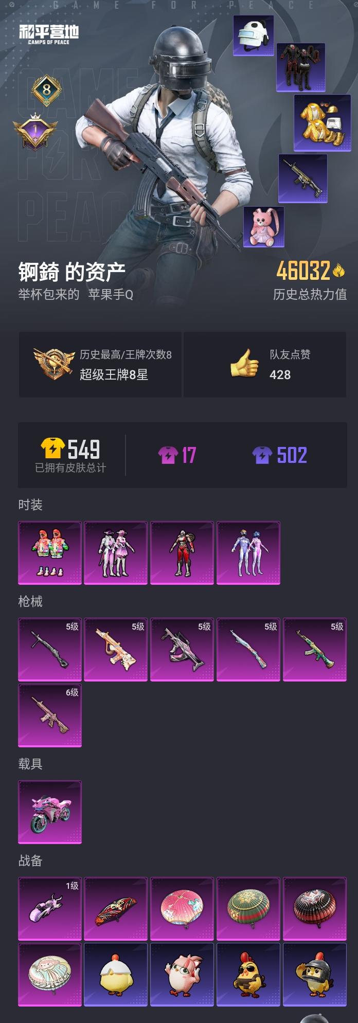 【和平精英】【lyhp20523】4粉装,6特效呛,1载具,历史最高段位:超级王牌8星 王牌印记8次 热力值:46032,132套装,142呛械,162装备,93战备;套装:套装-梦幻火箭,套装-室女星神,角色-阿尔茜,套装-炫光之旅,套装-特训学院,套装-猎鹰,套装-青年教官,套装-橘黑制服,套装-红色运动,套装-黄色运动,套装-蓝色运动,套装-黄色伏地魔,套装-白色伏地魔,套装-黑色伏地魔,套装-竞技名士,套装-深蓝色名流,套装-酒红色名流,套装-湖蓝色名流,套装-黄色名流,套装-猛禽,套装-长空猛禽,套装-雨林探路者,套装-冷焰舞者,套装-灼焰舞者,套装-浪漫天命,套装-战地督导,套装-特殊使命,套装-完美偶像,套装-人气偶像,套装-幻影武者,套装-特战英豪,套装-蓝彩潮人,套装-魅力单车,套装-绮丽涂鸦,套装-狂战萌兔,套装-坚韧舞者,套装-竞技达人朋克,套装-狂沙舞者,套装-破晓战魂,套装-都市魅力,套装-沙漠兵团,套装-派对舞王,套装-酷潮明星,套装-极地朋克,套装-幻世战舞者,套装-清新柠檬,套装-暗影哥特,套装-夏日倾情,套装-甜蜜熊情侣,套装-缤纷果语,套装-龙魂突击队,套装-风暴特警,套装-冰川特警,套装-元素星魂,套装-极速红龙,套装-麻辣教官,套装-粉红小猪,套装-破蛋小黄鸡,套装-疯狂小兔子,套装-精神漫游,套装-鹤鸣,套装-霓虹街区,套装-探宝勇士,套装-牛气满满,套装-白糯汤圆,套装-战术大师,套装-牛气冲天,套装-耀粉歌者,套装-飞行日记,套装-曼妙人鱼,套装-热情海星,套装-纯真浪花,套装-团圆交子,套装-豚鼠丹丹,角色-军刀雅典娜,套装-ss19特训,套装-兔兔白日梦,套装-飞驰魅影,套装-音速流光,套装-ss20特训,套装-甜心亚梦,套装-虚音幻奏,套装-ss21特训,套装-萌趣咩咩,套装-娇憨猪猪,套装-玉兔迎春,套装-ss22特训,套装-田园牧歌,套装-轻风白浪,套装-光之冒险,套装-ss23特训,套装-神气柴柴,套装-懵萌河马,套装-王牌教练,套装-青玉碎影,套装-ss24特训,套装-华灯初上,套装-涂山之恋,套装-ss25特训,套装-惊鸿侠骨,套装-锦衣飞扬,套装-沙丘之歌,套装-龙的传人,套装-冰河战士,套装-ss26特训,套装-空岛之星,套装-ss27特训,套装-恋语绒绒,套装-老实芭蕉,套装-ss28特训,角色-mark.06,套装-街头风暴,套装-蝶变,套装-粉日山川,套装-ss29特训,套装-异域银装,套装-星途旅人,套装-ss30特训,套装-纯白跃动,套装-ss31特训,套装-鱼渊荷华,套装-燕燕于飞,套装-智谋强哥,套装-ss33特训,套装-巳巳如意,套装-ss32特训,套装-顶瓜瓜,套装-大橘大利,套装-星渊小夜曲,套装-ss34特训,套装-薄荷星砂,套装-ss35特训;呛皮:5级akm-绿萝繁花,akm-破晓战魂,akm-霓虹街区,akm-彩虹符号,akm-龙的传人,akm-霓彩脉冲,5级groza-镜光银凌,groza-彩虹符号,groza-田园牧歌,groza-懵萌河马,groza-海盐豹豹,scar-l-红色方程式,scar-l-黄金龙骨,scar-l-炫彩节奏,scar-l-玉兔迎春,scar-l-星途旅人,g36c-懵萌河马,g36c-桃粉嫣然,m762-彩虹符号,m762-天降萌叽,6级m416-心之恋语,m416-蓝色火焰,m416-红色方程式,m416-糯团青竹,m416-摩登王国,m16a4-甜心亚梦,m16a4-幻世战舞者,m16a4-冰河战士,q-彩虹符号,q-飞驰魅影,q-纯真浪花,5级aug-暖羊咩咩,aug-甜蜜菠萝,aug-耀粉歌者,aug-异域银装,mk47-乌木金纹,mk47-摩登王国,蜜獾-娇憨猪猪,蜜獾-天降萌叽,蜜獾-乌木金纹,ac-val-甜心亚梦,ac-val-乌木金纹,ac-val-天降萌叽,famas-乌木金纹,5级kar98k-巳巳如意,kar98k-彩虹符号,kar98k-飞驰魅影,awm-圣堂之誓,awm-纯真浪花,莫辛纳甘-乌木金纹,莫辛纳甘-懵萌河马,amr-乌木金纹,m24-影袭,m24-炫彩节奏,m24-乌木金纹,m200-惊鸿侠骨,m200-乌木金纹,mk14-乌木金纹,mk14-冰河战士,m417-惊鸿侠骨,m417-玩趣呆呆,slr-娇憨猪猪,slr-彩虹符号,vss-田园牧歌,vss-彩虹符号,vss-香桃花海,mk20-h-星途旅人,mk20-h-乌木金纹,sks-炫彩节奏,mini14-梦幻火箭,ump45-夜灯,ump45-生命誓言,ump45-炫光之旅,汤姆逊-炫彩节奏,汤姆逊-环太平洋,汤姆逊-天降萌叽,汤姆逊-纯真浪花,uzi-娇憨猪猪,uzi-天降萌叽,uzi-冰河战士,uzi-啾咪啾咪,p90-飞驰魅影,p90-玩趣呆呆,p90-巳巳如意,p90-乌木金纹,mp5k-乌木金纹,vect-生命誓言,vect-田园牧歌,vect-燕燕于飞,野牛-燕燕于飞,aks-74u-乌木金纹,dbs-甜心亚梦,dbs-幻彩电音,dbs-乌木金纹,spas-12-田园牧歌,spas-12-燕燕于飞,spas-12-乌木金纹,s1897-炫彩节奏,s1897-飞驰魅影,s1897-糯团青竹,s686-红色方程式,s686-彩虹符号,s686-巳巳如意,s12k-娇憨猪猪,s12k-幻世战舞者,s12k-玩趣呆呆,aa12-g-纯真浪花,mg3-幻世战舞者,mg3-乌木金纹,mg3-惊鸿侠骨,mg3-霓彩脉冲,5级dp-28-豹影疾电,dp-28-彩虹符号,dp-28-甜心亚梦,pkm-懵萌河马,pkm-啾咪啾咪,m249-破晓战魂,m249-彩虹符号,m249-糯团青竹,蝎式手呛-燕燕于飞,平底锅-飞驰魅影,平底锅-甜心亚梦,平底锅-娇憨猪猪,平底锅-田园牧歌,平底锅-光之冒险,平底锅-懵萌河马,平底锅-惊鸿侠骨,平底锅-空岛之星,平底锅-纯真浪花,平底锅-属我最6,大砍刀-2p战斗服款,撬棍-环太平洋,撬棍-幻世战舞者,破片手留单-呆爆全场,破片手留单-星途旅人,破片手留单-拽到爆炸,破片手留单-巳巳如意,爆炸猎弓-天星战神,爆炸猎弓-炎氏战神,爆炸猎弓-惊鸿侠骨,十子怒-燕燕于飞,十子怒-异域银装;载具:双人摩托-梦幻火箭;降落伞:超新星飞行器,粉色滑翔尾迹,空岛之星尾迹,破刃行动尾迹; 详情看图4w6热力值精品小号 4粉装6特效呛1载具 派对舞王 梦幻火箭 暗影哥特 国宝头盔 粉熊背包 6级恋语m4 黄金龙骨 满级aug