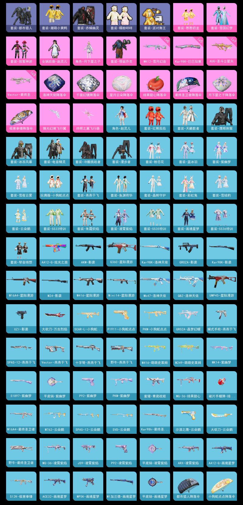 【和平精英】【txhp6505】6粉装,8特效呛,0载具,历史最高段位:卓越王牌12星 王牌印记5次 热力值:34034,68套装,114呛械,130装备,64战备;套装:套装-怪诞乔克,套装-雪国幻梦,套装-放客神游,女娲后裔-赵灵儿,套装-憨憨奶龙,角色-月下星之子,套装-漫步者,套装-海岛探路者,套装-赤蝎幽灵,套装-都市猎人,套装-春日漫步,套装-鹰眼刺客,套装-冰冻风暴,套装-冷酷挑战者,套装-蓝彩潮人,套装-魅力单车,套装-超能勇士,套装-派对舞王,套装-生化防暴队,套装-夏日倾情,套装-缤纷果语,套装-滨海厨神,套装-潮萌小黄鸭,套装-战术大师,套装-天籁歌者,套装-电音精灵,套装-rsg追光队服,套装-红熊茄茄,角色-赵灵儿,套装-光之冒险,套装-糯粉咩咩,套装-漫游都市,套装-恋语绒绒,套装-街头风暴,套装-雪夜云雾,套装-异域银装,套装-夜幕侵蚀,套装-小鸟芋圆,套装-绒宝小鹅,套装-ss31特训,套装-鱼渊荷华,套装-燕燕于飞,套装-紫幽梦,套装-粉恋花,套装-晶辉守护,套装-ss33特训,套装-云朵鹅,玩偶服-小狗蛇点点,套装-巳巳如意,套装-ss32特训,套装-彩虹兔,套装-青翼流星,套装-蓝冰羽,套装-顶瓜瓜,套装-雪绒豹,套装-乐游熊熊,套装-大橘大利,套装-元气之梦,套装-ss34特训,套装-朱霞炽焰,套装-凌霄紫焰,套装-薄荷星砂,套装-ss35特训,套装-琴音绮想,套装-画境星梦,套装-阳光菠萝,套装-ss36特训,套装-萌鸡速递;呛皮:scar-l-小狗蛇点点,scar-l-乐游熊熊,m762-天降萌叽,m762-云朵鹅,7级aug-圣斗士星矢,aug-甜蜜菠萝,aug-异域银装,akm-影袭,akm-涂鸦街区,akm-霓彩脉冲,akm-绿洲时空,ace32-画境星梦,ace32-冰晶雪宝,q-洛神天依,蜜獾-青瓷战姬,蜜獾-绿洲时空,蜜獾-乌木金纹,famas-乌木金纹,mk47-洛神天依,m16a4-星际漫游,m16a4-最终圣卫者,g36c-星际漫游,groza-影袭,groza-晶梦幻蝶,m416-星际漫游,m416-萌萌史莱姆,m416-错位像素,arx-凌霄紫焰,m24-影袭,awm-天降萌叽,win94-乌木金纹,m200-乌木金纹,5级kar98k-巳巳如意,kar98k-影袭,kar98k-洛神天依,kar98k-最终圣卫者,svd-云朵鹅,amr-鸡智如我,mini14-星际漫游,mini14-鸡智如我,5级mk14-甜梦熊击,mk14-紫幽梦,mk14-薄荷星砂,6级mk12-雪月幻音,mk12-乌木金纹,m417-玩趣呆呆,mk20-h-狂鲨锋刃,qbu-夜幕侵蚀,m1加兰德-画境星梦,sks-乐游熊熊,uzi-影袭,uzi-天降萌叽,uzi-啾咪啾咪,uzi-炫彩糖果,野牛-燕燕于飞,野牛-最终圣卫者,3级vect-最终圣卫者,vect-燕燕于飞,mp5k-画境星梦,5级汤姆逊-热量炸弹,aks-74u-粉粉喵呜,aks-74u-鸡智如我,aks-74u-乌木金纹,ump45-星际漫游,ump45-海盐豹豹,ump45-绒宝小鹅,ump45-夜幕侵蚀,ump45-绿洲时空,p90-巳巳如意,js9-凌霄紫焰,aa12-g-炫光之旅,aa12-g-画境星梦,s1897-紫幽梦,s1897-糯团青竹,spas-12-燕燕于飞,spas-12-狂鲨锋刃,spas-12-云朵鹅,s12k-极意拳锋,s686-巳巳如意,mg-36-绯果甜心,mg-36-凌霄紫焰,mg-36-薄荷星砂,mg3-幻世战舞者,mg3-霓彩脉冲,m249-萌萌史莱姆,m249-冰晶雪宝,5级dp-28-豹影疾电,dp-28-彩虹符号,pkm-啾咪啾咪,pkm-紫幽梦,pkm-小狗蛇点点,p1911-小狗蛇点点,p92-紫幽梦,p92-凌霄紫焰,蝎式手呛-燕燕于飞,沙墨之鹦-云朵鹅,大砍刀-万古烈焰,大砍刀-云朵鹅,平底锅-紫幽梦,平底锅-属我最6,平底锅-凌霄紫焰,平底锅-画境星梦,撬棍-冰晶雪宝,铝热弹-炫彩糖果,十子怒-燕燕于飞,十子怒-异域银装,5级盐雾蛋-猫咪绅士,盐雾蛋-冰氧夏日,破片手留单-海盐豹豹,破片手留单-绯果甜心,破片手留单-拽到爆炸,破片手留单-巳巳如意,破片手留单-爆破雪人,燃烧瓶-甜梦桃焰;降落伞:镜光幻境飞行翼,终晖之翼飞行器,异域银装飞行器,狂鲨锋刃飞行器,破刃行动尾迹; 详情看图5印记-3.4热力-6粉-8特 【精氪号】雪国/放客神游/小丑/都市/金鞋/小番茄/赤蝎/赵灵儿 3级最终圣卫者/满级圣斗士aug/星际m4