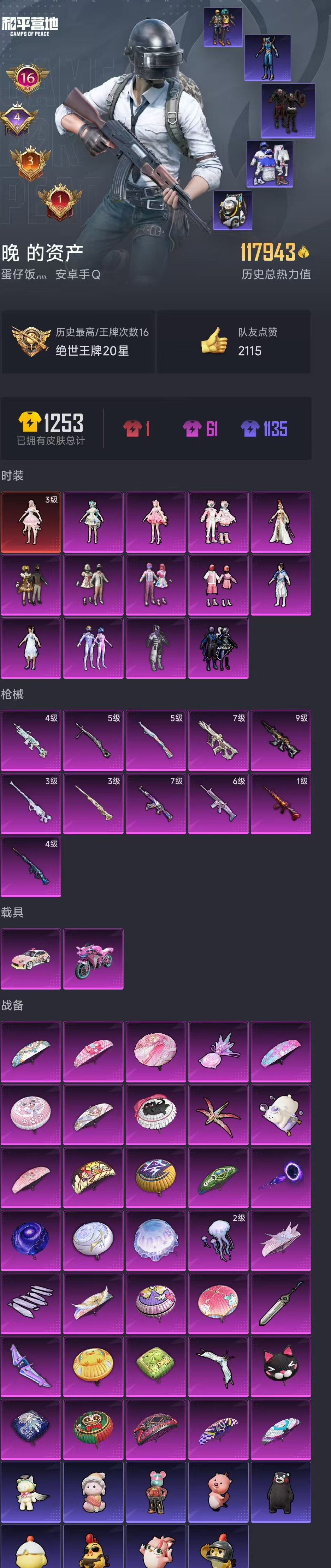 【和平精英】【lyhp20632】13粉装,11特效呛,2载具,历史最高段位:绝世王牌20星 王牌印记16次 热力值:117943,221套装,337呛械,466装备,194战备;套装:梦海之灵-妮芮妲,套装-幻影战神,套装-甜心巧克力,套装-宝贝奶油派,套装-天使彩虹糖,套装-梦幻火箭,套装-暗夜玫瑰,套装-甜梦小狐,蜀山剑侠-李,女娲后裔-赵灵儿,套装-飒粉甜心,角色-樱桃泡泡,角色-霁蓝缠春,角色-萨利娅,套装-特训学院,套装-黄色运动,套装-白色伏地魔,套装-黑色伏地魔,套装-竞技名士,套装-野性山猫,套装-长空猛禽,套装-漫步者,套装-海岛探路者,套装-雨林探路者,套装-旭日情侣,套装-冷焰舞者,套装-灼焰舞者,套装-都市猎人,套装-浪漫天命,套装-特战装甲,套装-贵族骑装,套装-特殊使命,套装-灰色格斗者,套装-春日漫步,套装-燃烧卡路里,套装-滨海假日,套装-鹰眼刺客,套装-冰冻风暴,套装-幻影武者,套装-神秘领域,套装-魅力单车,套装-绮丽涂鸦,套装-坚韧舞者,套装-夜莺强袭者,套装-野性战魂,套装-金羽特工,套装-风行保卫者,套装-热血青春,套装-沙漠兵团,套装-酷潮明星,套装-幻世战舞者,套装-金耀舞者,套装-蓝调潮人,套装-暗影哥特,套装-迅捷狂鲨,套装-呆萌铁蟹,套装-深海小丑鱼,套装-甜蜜熊情侣,套装-缤纷果语,套装-滨海厨神,套装-龙魂突击队,套装-冰川特警,套装-海上生明月,套装-麻辣教官,套装-小丑鱼,套装-破蛋小黄鸡,套装-军械专家,套装-鹤鸣,套装-霓虹街区,套装-纯白誓言,套装-激萌罗小黑,套装-白熊同盟,套装-萌黄之夏,套装-击剑大师,套装-神秘舞者,套装-丝绸行者,套装-探宝勇士,套装-牛气满满,套装-ss11特训,套装-青春冒险家,套装-潮流游乐家,套装-玄武圣者,套装-骁骑迪迦,套装-原初圣火,套装-逆风勇士,套装-萌趣颜团子,套装-特种颜团子,套装-战术大师,套装-ss12特训,套装-牛气冲天,套装-ss18特训,套装-镭射皇者,套装-银白舞王,套装-迅捷之星,套装-治愈之星,套装-科技之星,套装-飞行日记,套装-ss13特训,套装-曼妙人鱼,套装-热情海星,套装-纯真浪花,套装-ss14特训,套装-天籁歌者,套装-吉莉礼服,套装-微雨春柳,套装-ss15特训,套装-ss16特训,套装-暴风机械师,套装-时空追击者,角色-英勇保护者,套装-ss17特训,套装-智慧隐士,套装-醒狮腾龙,套装-瑞龙福将,套装-团圆交子,套装-爆裂葡萄,套装-极乐追光,套装-福星高照,套装-虎虎生威吉莉,套装-异彩先驱,套装-霓虹极客,套装-冰暴轰轰,套装-空投萌叽,套装-ss19特训,套装-浓情蜜辣,套装-飞驰魅影,套装-音速流光,套装-炫蓝之夏,套装-ss20特训,套装-覆海蛟龙,套装-粉团憨憨,套装-恶魔喵喵,套装-甜心亚梦,套装-虚音幻奏,套装-ss21特训,套装-萌趣咩咩,套装-娇憨猪猪,套装-荷畔雨呱,套装-酸甜橘柚,角色-李,角色-林月如,角色-赵灵儿,角色-阿奴,角色-酒剑仙,套装-玉兔迎春,套装-ss22特训,套装-田园牧歌,套装-轻风白浪,套装-光之冒险,套装-ss23特训,套装-灵蜜圈圈,套装-妙红点点,套装-幻彩翩翩,套装-王牌教练,套装-柠萌假日,套装-ss24特训,套装-龟仙人,套装-ss25特训,套装-冰河战士,套装-ss27特训,套装-ss28特训,角色-湖雨初晴,玩偶服-卖崽青蛙,角色-听雨铃兰,角色-迎夏光舞,角色-情公主,角色-mark.06,套装-海盐绵绵冰,套装-航行童话,套装-蝶变,套装-创世·追猎,套装-粉日山川,套装-小熊娃娃,套装-ss29特训,套装-雏菊兔兔,角色-狂花道·雅典娜,套装-萝兰蝴蝶,套装-鹿角斗士,套装-异域银装,角色-蜜桃派对,套装-星途旅人,角色-许七安,角色-怀庆长公主,角色-临安公主,套装-ss30特训,套装-青团波波,角色-夜瞳黯灵,套装-糖糖葫芦,角色-碧青流霞,角色-馥郁金蕊,套装-ss31特训,套装-鱼渊荷华,套装-燕燕于飞,套装-智谋强哥,套装-ss33特训,套装-云朵鹅,套装-巳巳如意,套装-ss32特训,套装-彩虹兔,套装-青翼流星,套装-雪绒豹,套装-大橘大利,角色-灵公主,角色-鲛海歌灵,套装-炫彩糖果,套装-元气之梦,套装-ss34特训,套装-擎苍青焰,套装-朱霞炽焰,套装-游乐,套装-凌霄紫焰,套装-薄荷星砂,套装-ss35特训,套装-午间小调,套装-风迹短诗,套装-琴音绮想,套装-粉黛兰香,套装-画境星梦,套装-书海巡游,套装-ss36特训,套装-萌鸡速递;呛皮:mk47-百万伏特,mk47-青春冒险家,mk47-洛神天依,mk47-乌木金纹,mk47-妙红点点,mk47-风迹短诗,m16a4-蓝色火焰,m16a4-红色方程式,m16a4-夜灯,m16a4-甜心亚梦,m16a4-幻世战舞者,m16a4-冰河战士,7级akm-星际浪客,akm-灼热熔岩,akm-影袭,akm-缤纷海域,akm-破晓战魂,akm-霓虹街区,akm-夜灯,akm-涂鸦街区,akm-彩虹符号,akm-萌趣颜团子,akm-虎虎生威,akm-霓彩脉冲,akm-绿洲时空,m762-绯红前夜,m762-奇异狩猎者,m762-甜心宝贝,m762-牛气冲天,m762-镭射皇者,m762-瑞龙福将,m762-天降萌叽,m762-雏菊兔兔,m762-云朵鹅,ac-val-甜心亚梦,ac-val-乌木金纹,ac-val-彩虹甜喵,ac-val-天降萌叽,ac-val-梦海之灵,ac-val-霁蓝缠春,1级m416-风花雪月,9级m416-墨龙九天,m416-夜灯,m416-蓝色火焰,m416-绯红前夜,m416-红色方程式,m416-仓鼠灰灰,m416-紫翼圣骑,m416-糯团青竹,蜜獾-娇憨猪猪,蜜獾-垂柳戏鸭,蜜獾-天降萌叽,蜜獾-精灵梦叶罗丽,蜜獾-糖糖葫芦,蜜獾-风迹短诗,蜜獾-乌木金纹,6级scar-l-梦幻火箭,scar-l-红色方程式,scar-l-黄金龙骨,scar-l-夜灯,scar-l-炫彩节奏,scar-l-彩虹符号,scar-l-银碳小老虎,scar-l-玉兔迎春,scar-l-星途旅人,scar-l-海盐豹豹,scar-l-冷漠罗丽,groza-影袭,groza-生命誓言,groza-马卡龙,groza-治愈之星,groza-彩虹符号,groza-异彩先驱,groza-田园牧歌,groza-海盐豹豹,g36c-时空