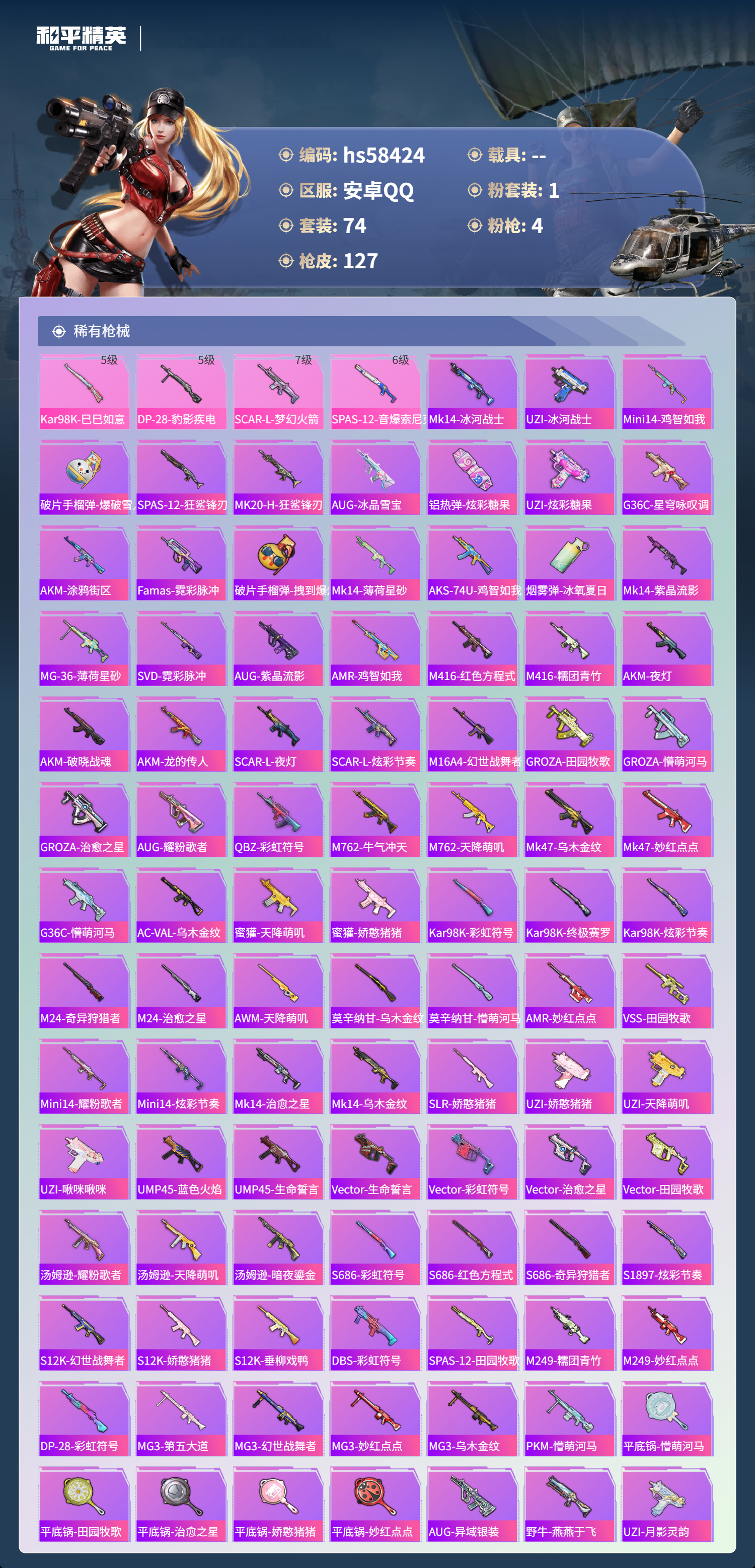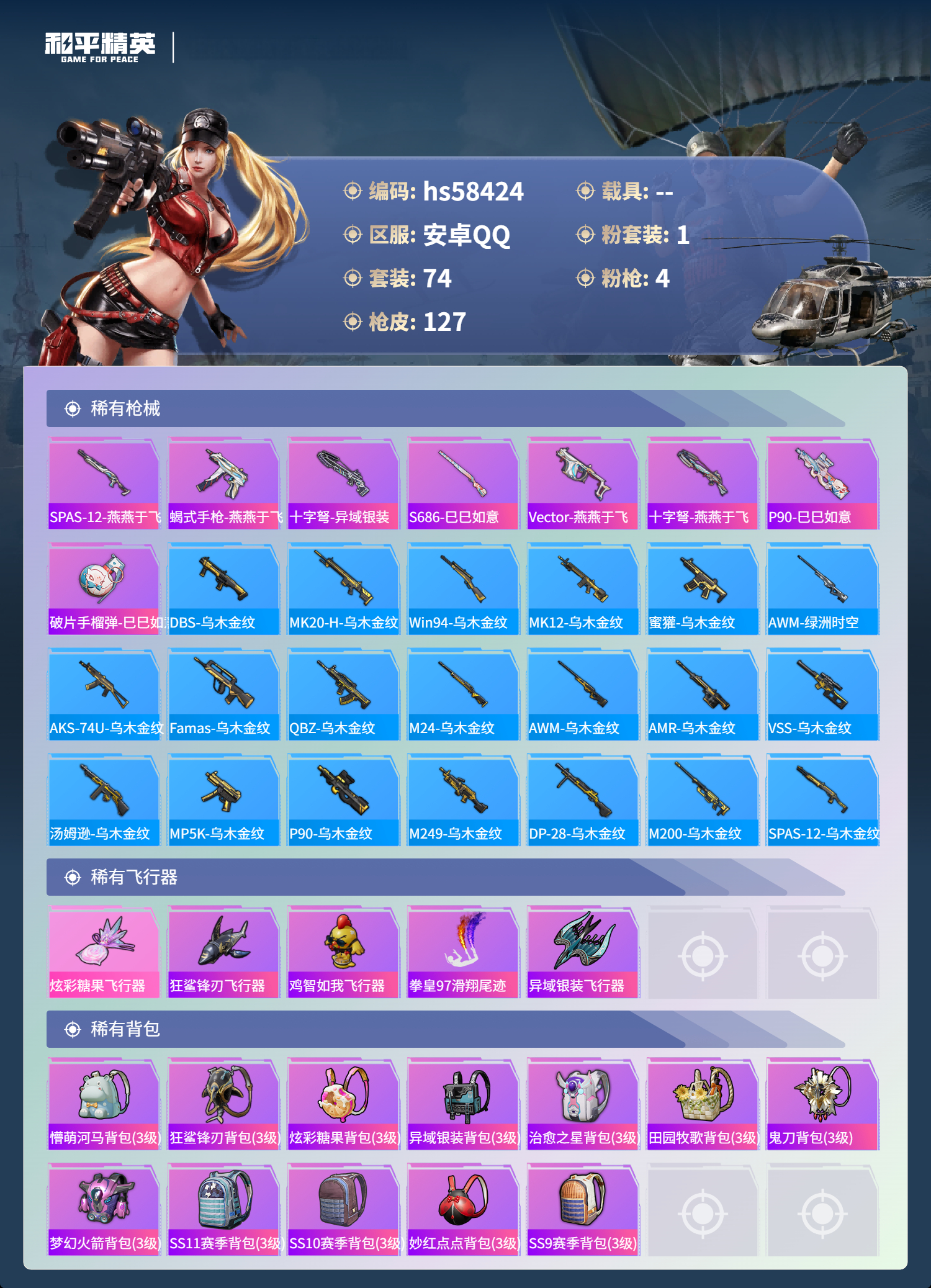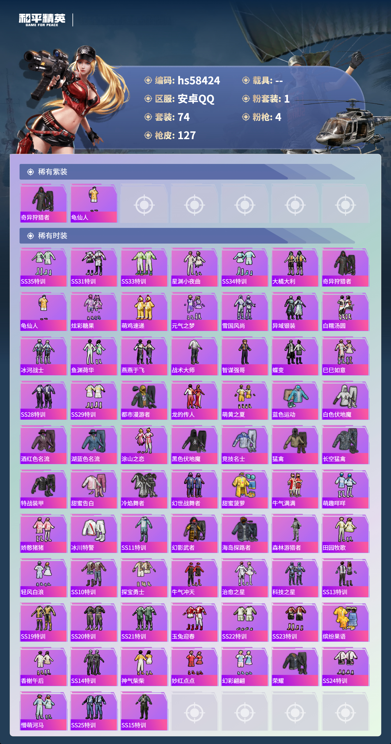 hs58424 安卓手q-2王牌印记-1粉装-4特效呛-35393热力值-74套装-127呛皮【1粉装】角色-罪夜之冕【4特效呛】dp-28-豹影疾电/5级scar-l-梦幻火箭/7级spas-12-音爆索尼克/6级kar98k-巳巳如意/5级【2稀有紫装】奇异狩猎者龟仙人【73稀有时装】ss35特训ss31特训ss33特训星渊小夜曲ss34特训大橘大利奇异狩猎者龟仙