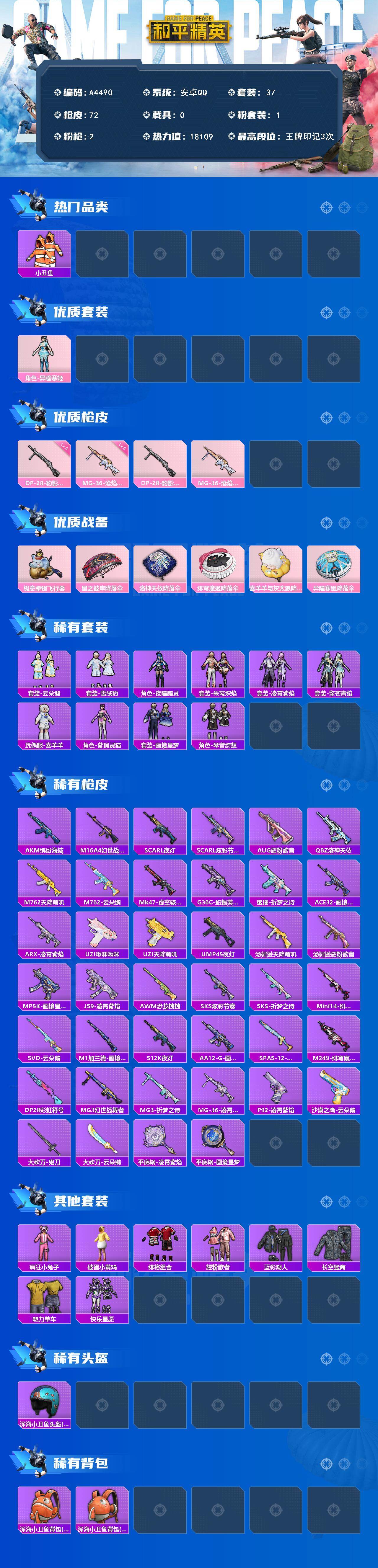 [15962493]安卓【小号】 手q-1粉装-2特效呛-0载具-2粉色飞行器-18109热力值-3王牌印记-37套装-72呛皮 【热门品类】:套装-小丑鱼 【粉色套装】:角色-异瞳寒姬 【粉色呛皮等级】:dp-28-豹影疾电五级,mg-36-沧焰双生五级 【粉色呛皮】:dp-28-豹影疾电,mg-36-沧焰双生 【粉色飞行器】:极意拳锋飞行器 【粉色降落伞】:星之彼岸降落伞,洛神天依降落伞,绯穹魔姬降落伞,喜羊羊与灰太狼降落伞,异瞳寒姬降落伞,炫彩糖果降落伞 【稀有套装】:套装-雪国风尚,套装-云朵鹅,套装-雪绒豹,角色-夜瞳黯灵,套装-朱霞炽焰,套装-凌霄紫焰,套装-擎苍青焰,玩偶服-喜羊羊,角色-紫俏灵猫,套装-画境星梦,套装-琴音绮想 【稀有呛皮】:akm-缤纷海域,m16a4-幻世战舞者,scar-l-夜灯,scar-l-炫彩节奏,aug-耀粉歌者,q-洛神天依,m762-天降萌叽,m762-云朵鹅,mk47-虚空骇客,g36c-蛇蝎美人,蜜獾-折梦之诗,ace32-画境星梦,arx-凌霄紫焰,uzi-啾咪啾咪,uzi-天降萌叽,ump45-夜灯,汤姆逊-天降萌叽,汤姆逊-耀粉歌者,mp5k-画境星梦,js9-凌霄紫焰,awm-恐龙拽拽,sks-炫彩节奏,sks-折梦之诗,mini14-绯穹魔姬,svd-云朵鹅,m1加兰德-画境星梦,s12k-夜灯,aa12-g-画境星梦,spas-12-云朵鹅,m249-绯穹魔姬,dp-28-彩虹符号,mg3-幻世战舞者,mg3-折梦之诗,mg-36-凌霄紫焰,p92-凌霄紫焰,沙墨之鹦-云朵鹅,大砍刀-云朵鹅,大砍刀-鬼刀,平底锅-凌霄紫焰,平底锅-画境星梦 【其他套装】:套装-疯狂小兔子,套装-破蛋小黄鸡,套装-绯格组合,套装-耀粉歌者,套装-蓝彩潮人,套装-长空猛禽,套装-魅力单车,套装-快乐星愿 【稀有头盔】:深海小丑鱼头盔1级 【稀有背包】:深海小丑鱼背包3级,深海小丑鱼背包2级 【营地id】:1018871054