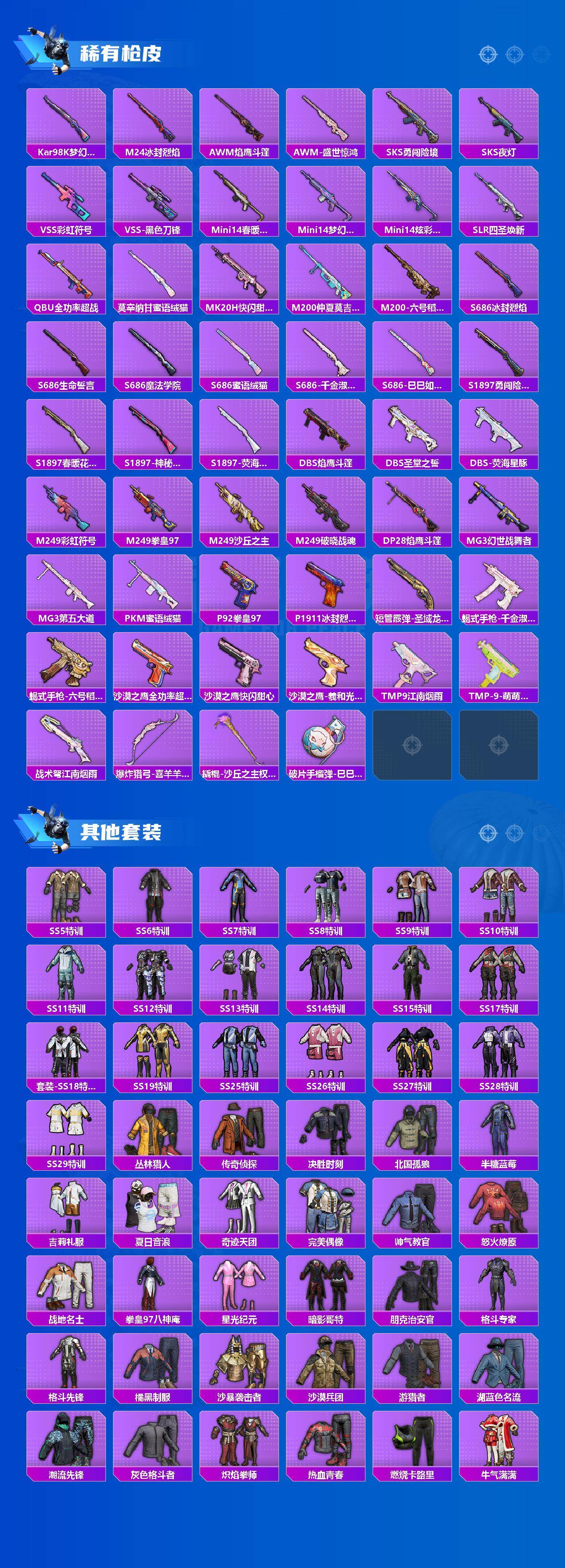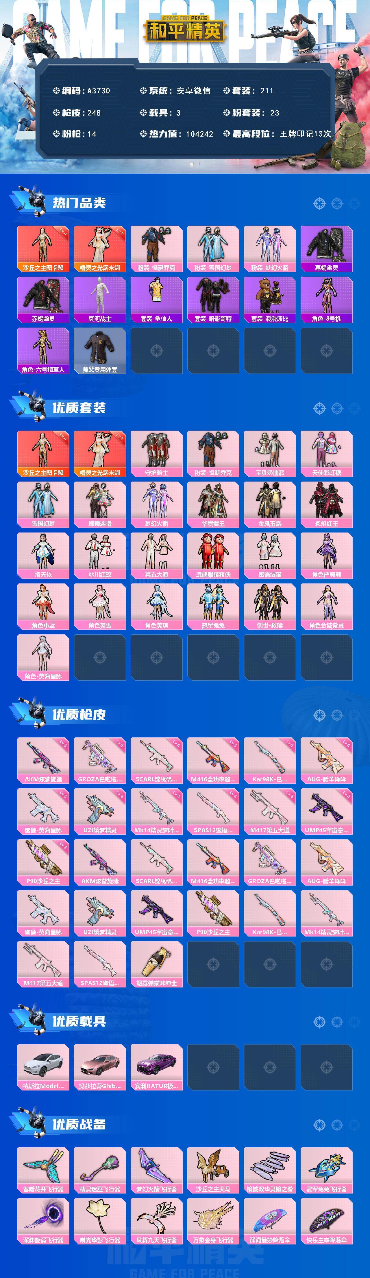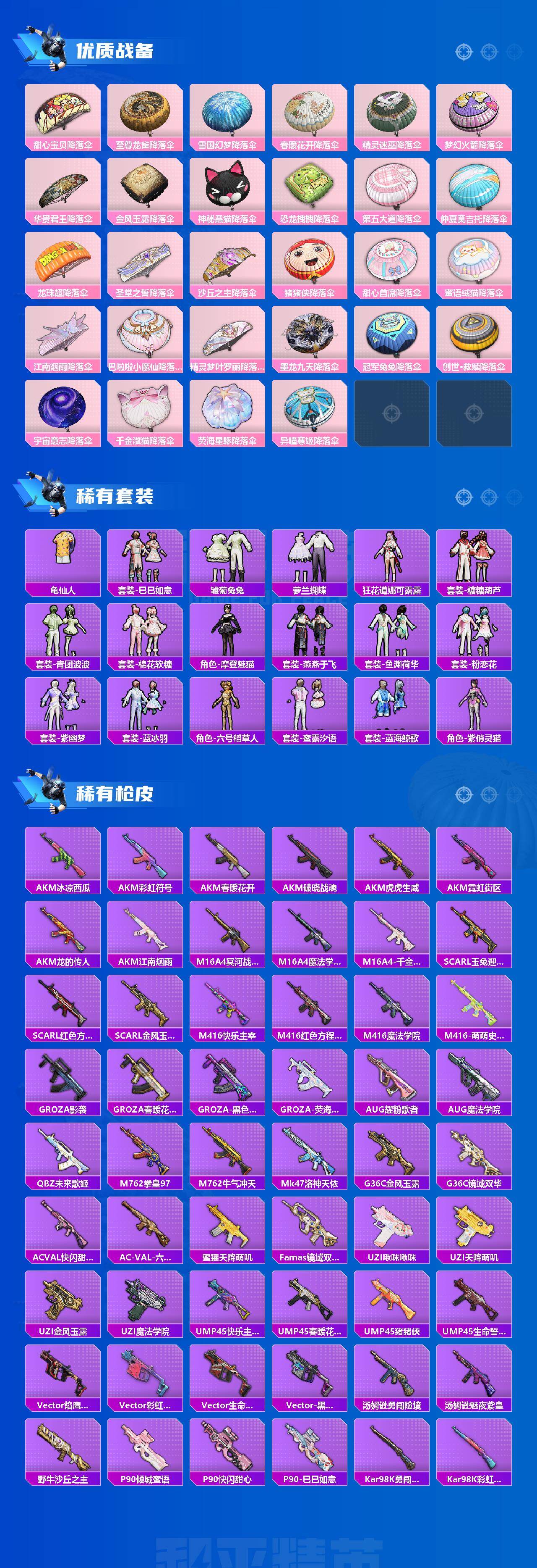 [15962610]安卓 【极品神装号 沙丘之主-图卡盟四级/精灵之光-露米娜二级/怪诞乔克/雪国幻梦/梦幻火箭/寒蝎幽灵/冥河战士/师父专用外套/m416-全功率超战五级/特斯拉model x(珍珠白)】微信-2神装-23粉装-14特效呛-3载具-12粉色飞行器-104242热力值-13王牌印记-211套装-248呛皮 【红色神装等级】:精灵之光-露米娜二级,沙丘之主-图卡盟四级 【红色角色神装】:精灵之光-露米娜,沙丘之主-图卡盟 【热门品类】:粉装-怪诞乔克,粉装-雪国幻梦,粉装-梦幻火箭,套装-寒蝎幽灵,套装-赤蝎幽灵,套装-冥河战士,套装-龟仙人,套装-暗影哥特,套装-浪漫波比,角色-8号机,角色-六号稻草人,师父专用外套 【粉色套装】:粉装-守护骑士,粉装-怪诞乔克,粉装-宝贝奶油派,粉装-天使彩虹糖,粉装-雪国幻梦,粉装-蝶舞迷情,粉装-梦幻火箭,粉装-华贵君王,粉装-金风玉露,粉装-炙焰红王,角色-洛天依,粉装-冰川红玫,粉装-第五大道,玩偶服-猪猪侠,粉装-蜜语绒猫,角色-严莉莉,角色-小蓝,角色-美雪,角色-美琪,粉装-冠军兔兔,套装-创世·救赎,角色-金域紫灵,角色-荧海星豚 【粉色呛皮等级】:akm-炫紫旋律五级,scar-l-锦绣绵绵五级,m416-全功率超战五级,groza-巴啦啦小魔仙五级,aug-暖羊咩咩五级,蜜獾-荧海星豚五级,uzi-筑梦精灵四级,ump45-宇宙意志三级,p90-沙丘之主三级,kar98k-巳巳如意五级,mk14-精灵梦叶罗丽四级,m417-第五大道四级,spas-12-蜜语绒猫四级 【粉色载具】:特斯拉model x(珍珠白),玛莎拉蒂ghibli(粉),宾利batur(极速紫) 【粉色呛皮】:akm-炫紫旋律,scar-l-锦绣绵绵,m416-全功率超战,groza-巴啦啦小魔仙,aug-暖羊咩咩,蜜獾-荧海星豚,uzi-筑梦精灵,ump45-宇宙意志,p90-沙丘之主,kar98k-巳巳如意,mk14-精灵梦叶罗丽,m417-第五大道,spas-12-蜜语绒猫,盐雾蛋-猫咪绅士 【粉色飞行器】:春暖花开飞行器,精灵迷巫飞行器,梦幻火箭飞行器,沙丘之主天马,镜域双华-灵镜之阶,冠军兔兔飞行器,深渊漩涡飞行器,曦光华影飞行器,凤舞九天飞行器,万象金身飞行器