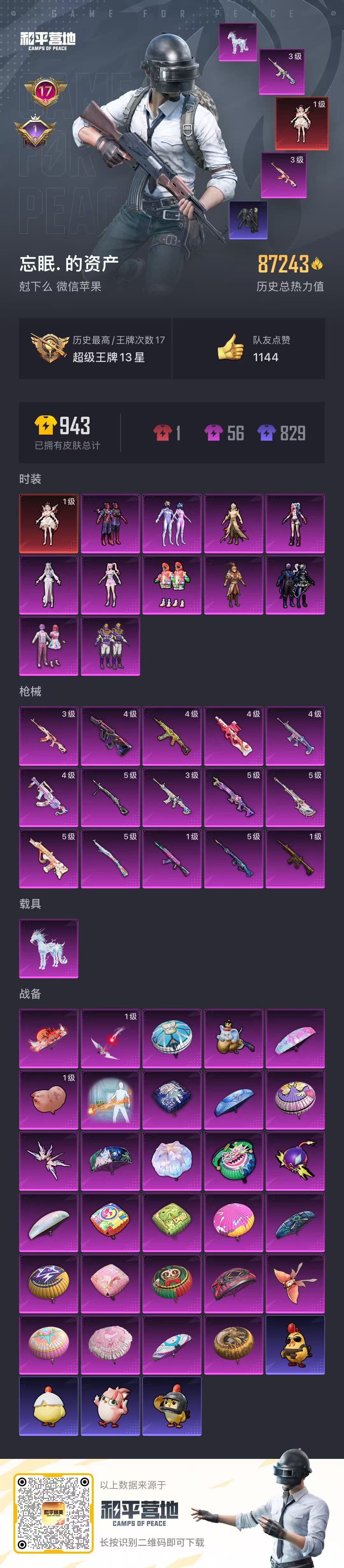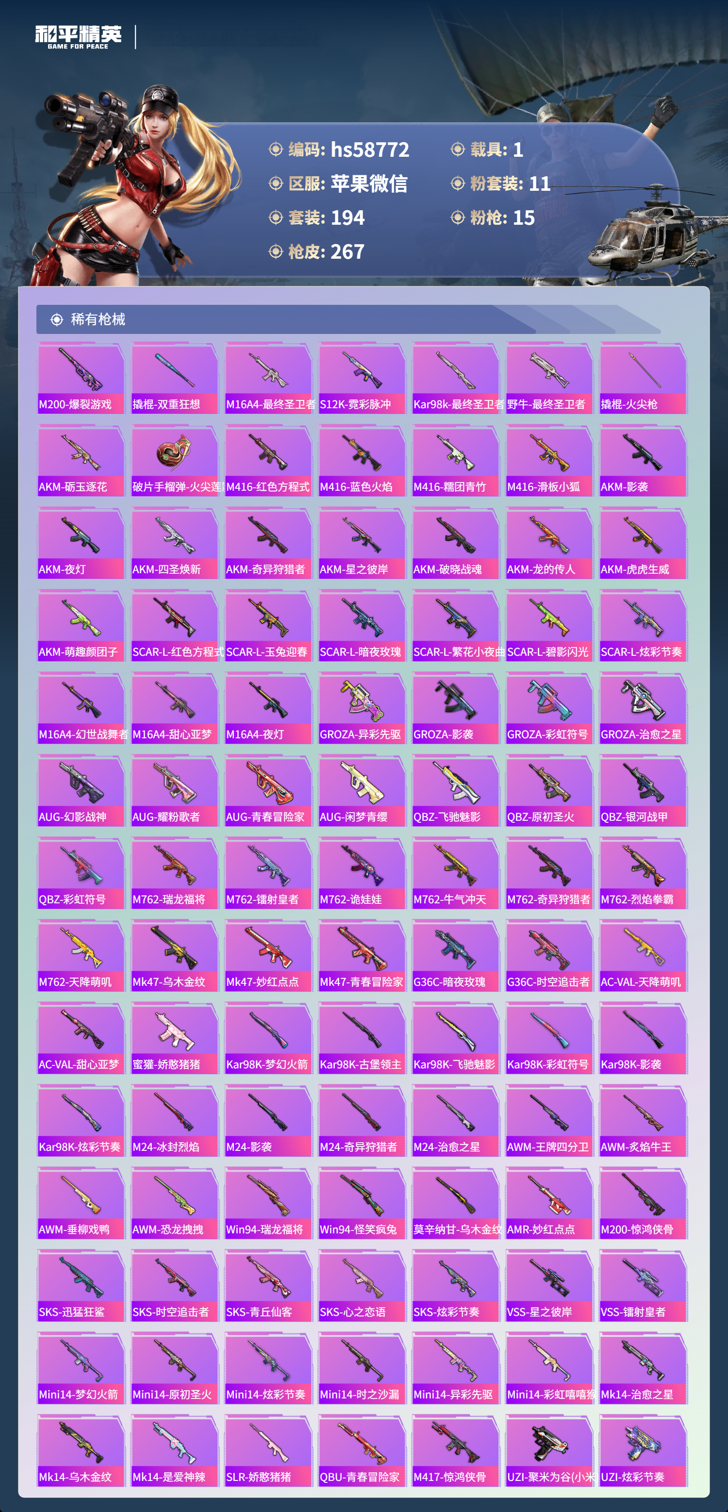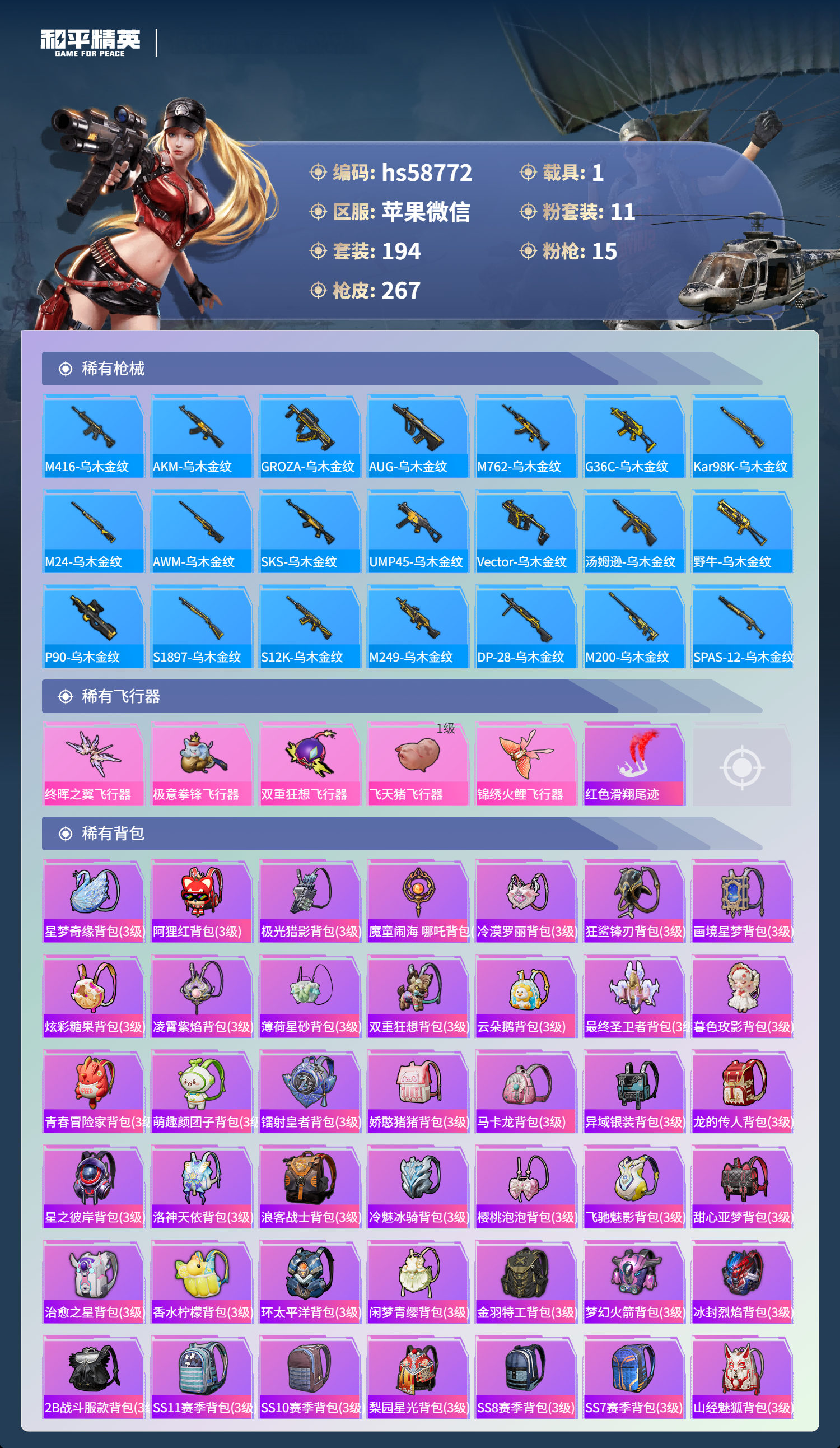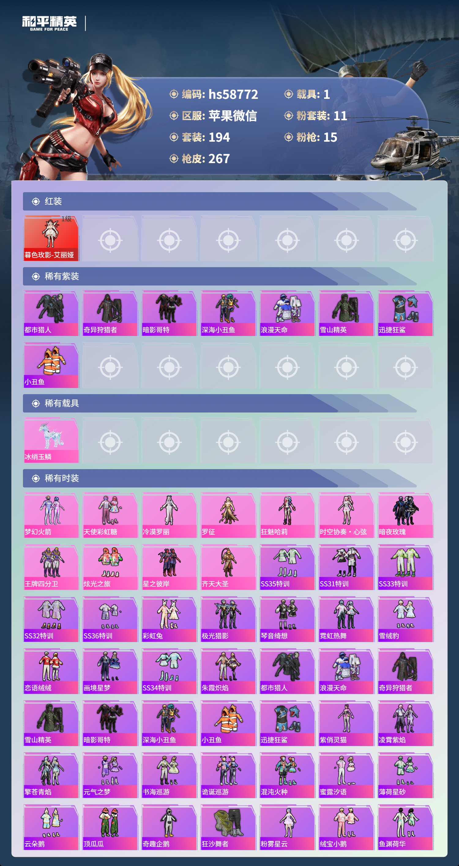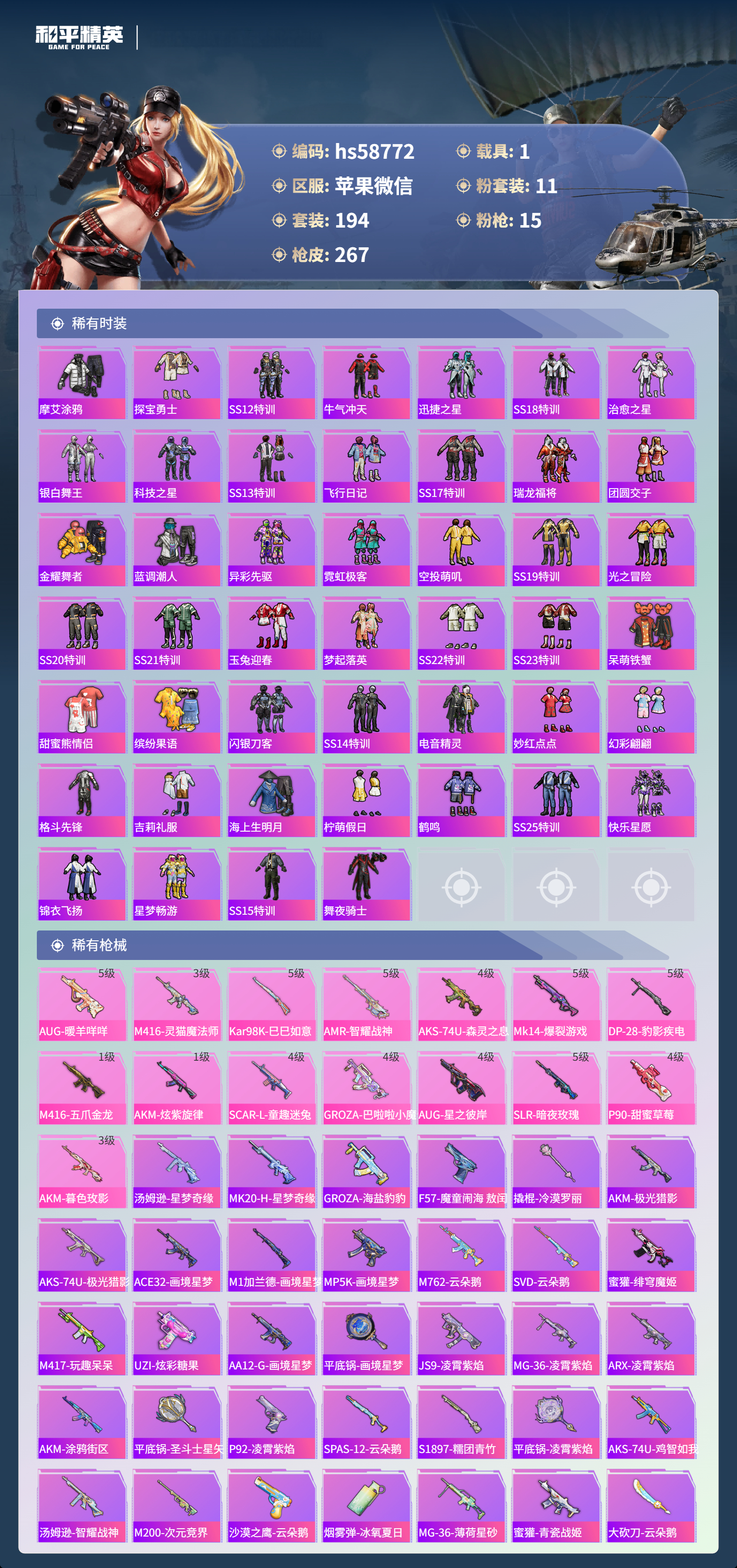 hs58772 苹果微信-17王牌印记-1红装-11粉装-15特效呛-1载具-87583热力值-194套装-267呛皮-1卓越印记【1红装】暮色玫影-艾丽娅/1级【11粉装】角色-狂魅哈莉套装-星之彼岸套装-天使彩虹糖角色-冷漠罗丽套装-齐天大圣套装-暗夜玫瑰时空协奏·心弦套装-炫光之旅套装-王牌四分卫套装-梦幻火箭角色-罗征【15特效呛】dp-28-豹影疾电/5级sl