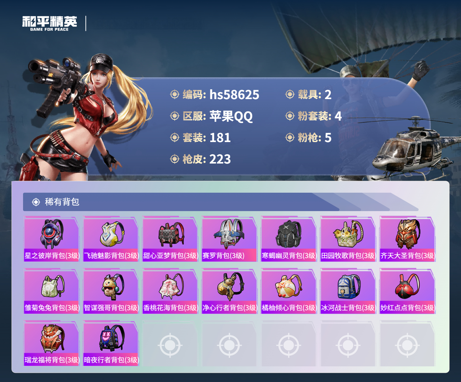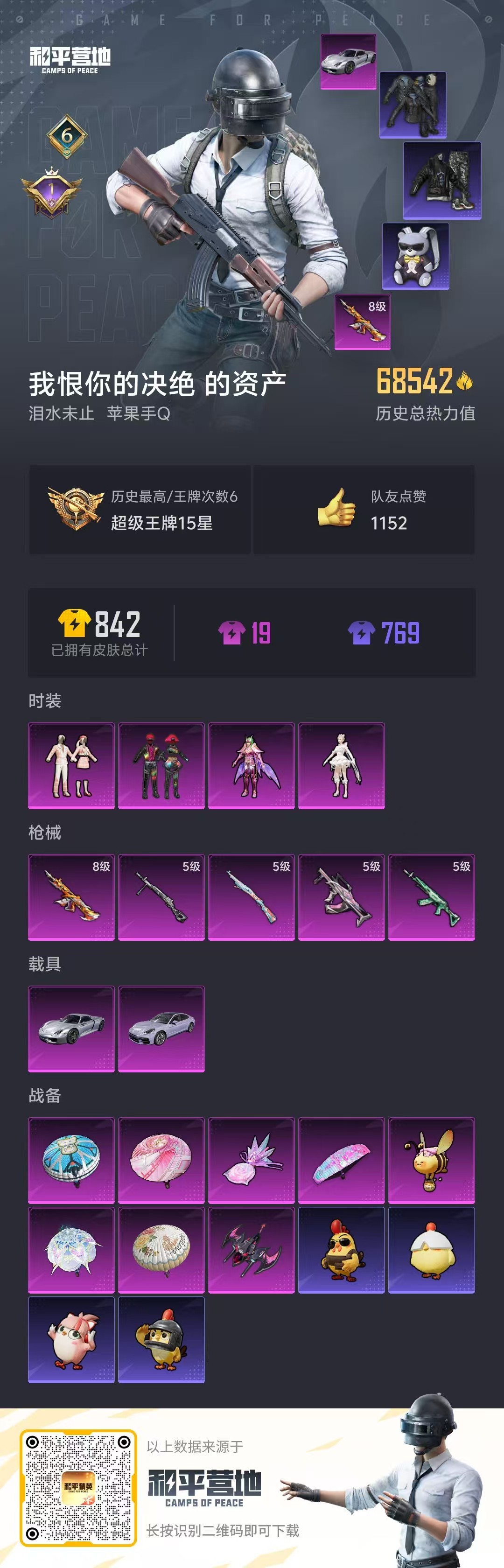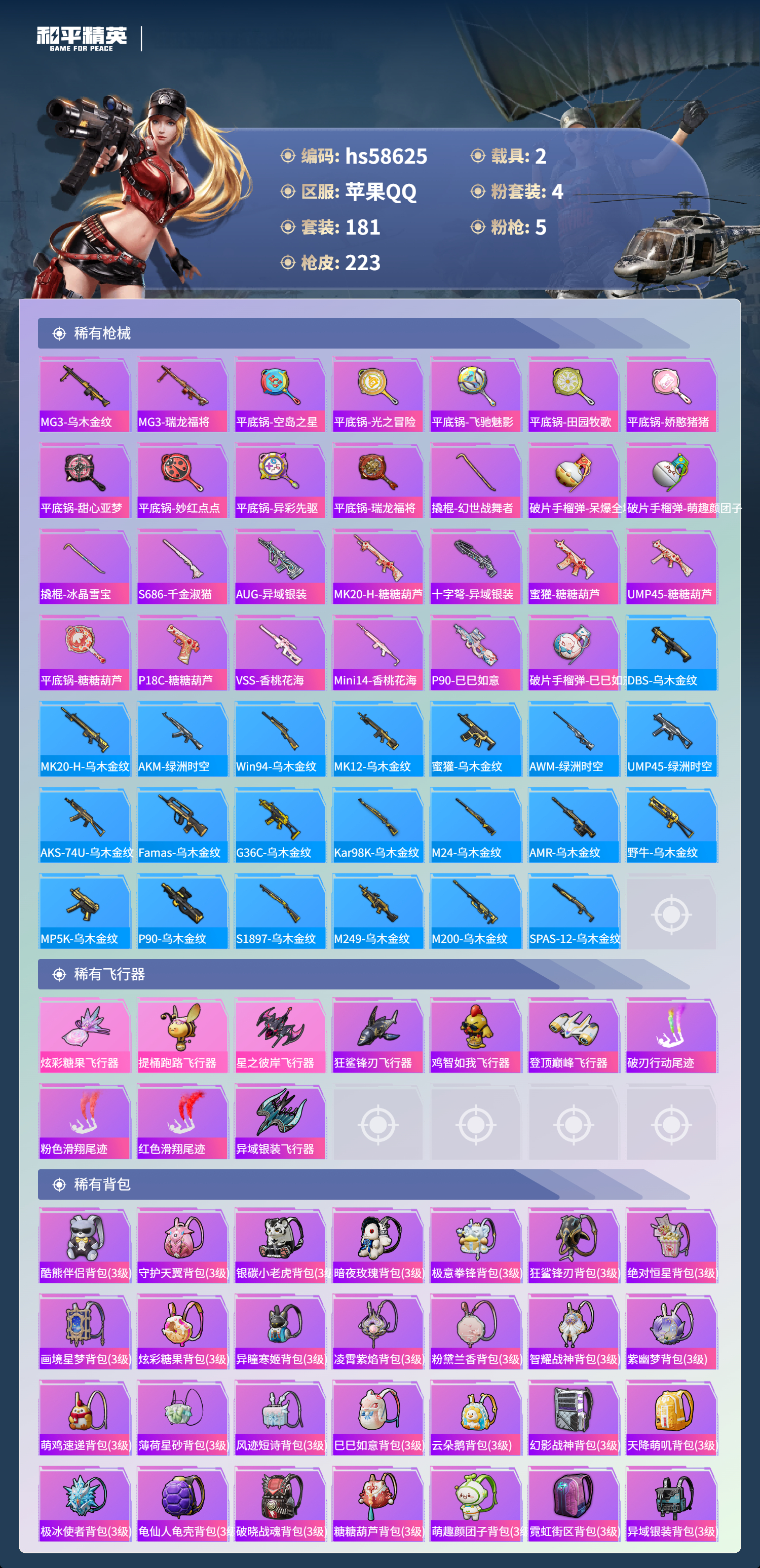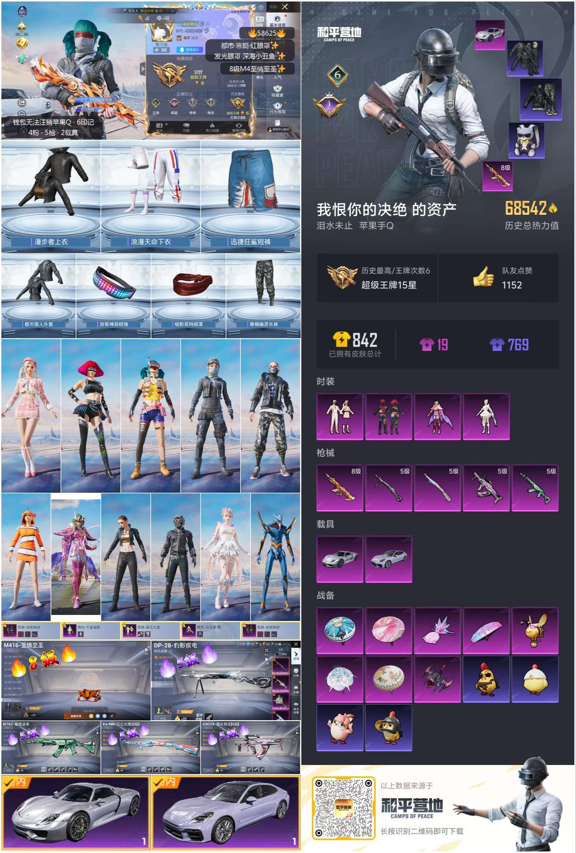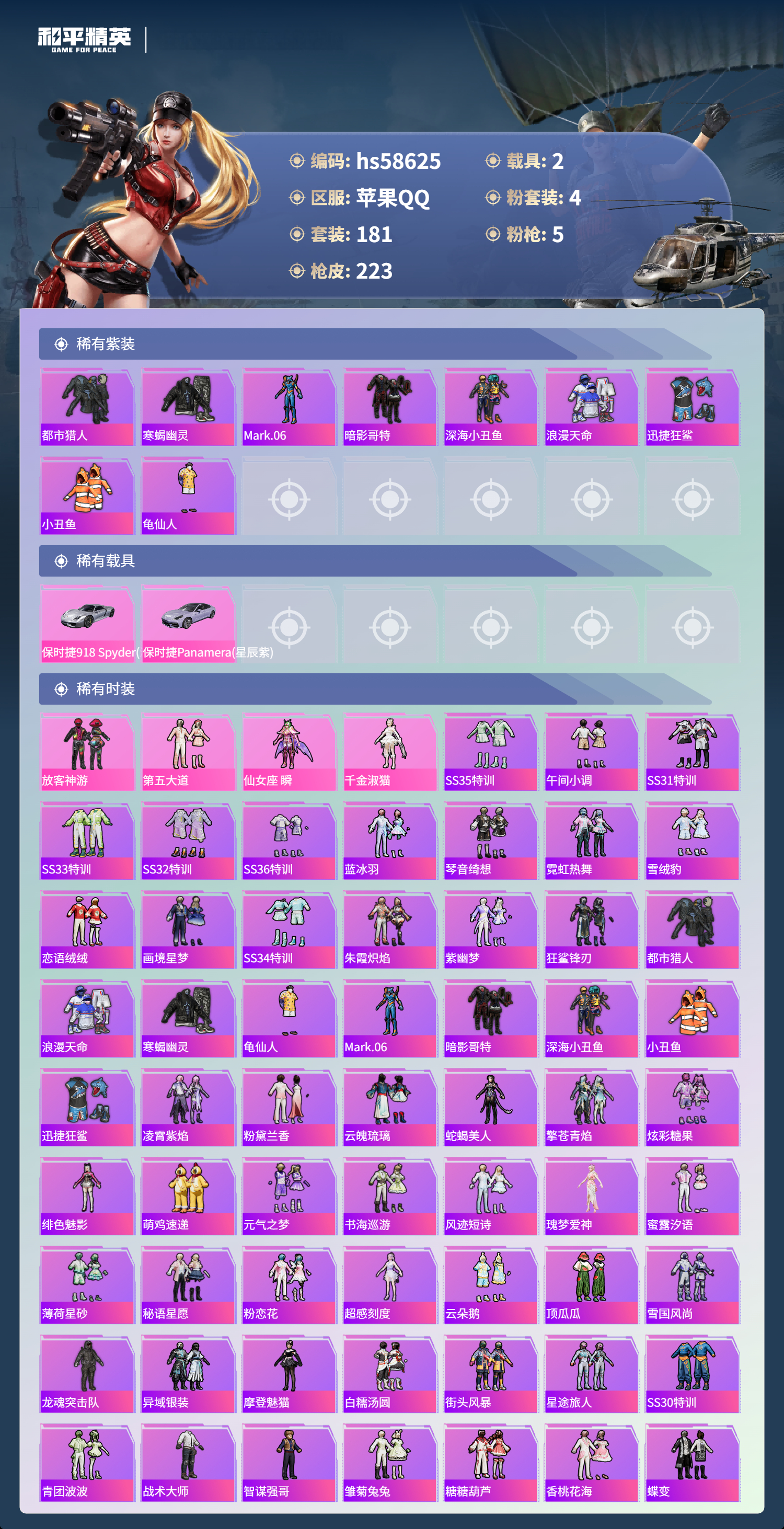 2载具-181套装-223呛皮-hs58625 苹果手q-6王牌印记-4粉装-5特效呛-2载具-68590热力值-181套装-223呛皮-1卓越印记【4粉装】套装-放客神游角色-仙女座 瞬套装-第五大道角色-千金淑猫【5特效呛】groza-镜光银凌/5级m416-至情至圣/8级m762-青锋波束/5级kar98k-巳巳如意/5级dp-28-豹影疾电/5级【9稀有紫装】都市猎人寒蝎幽灵mark.06暗影哥
