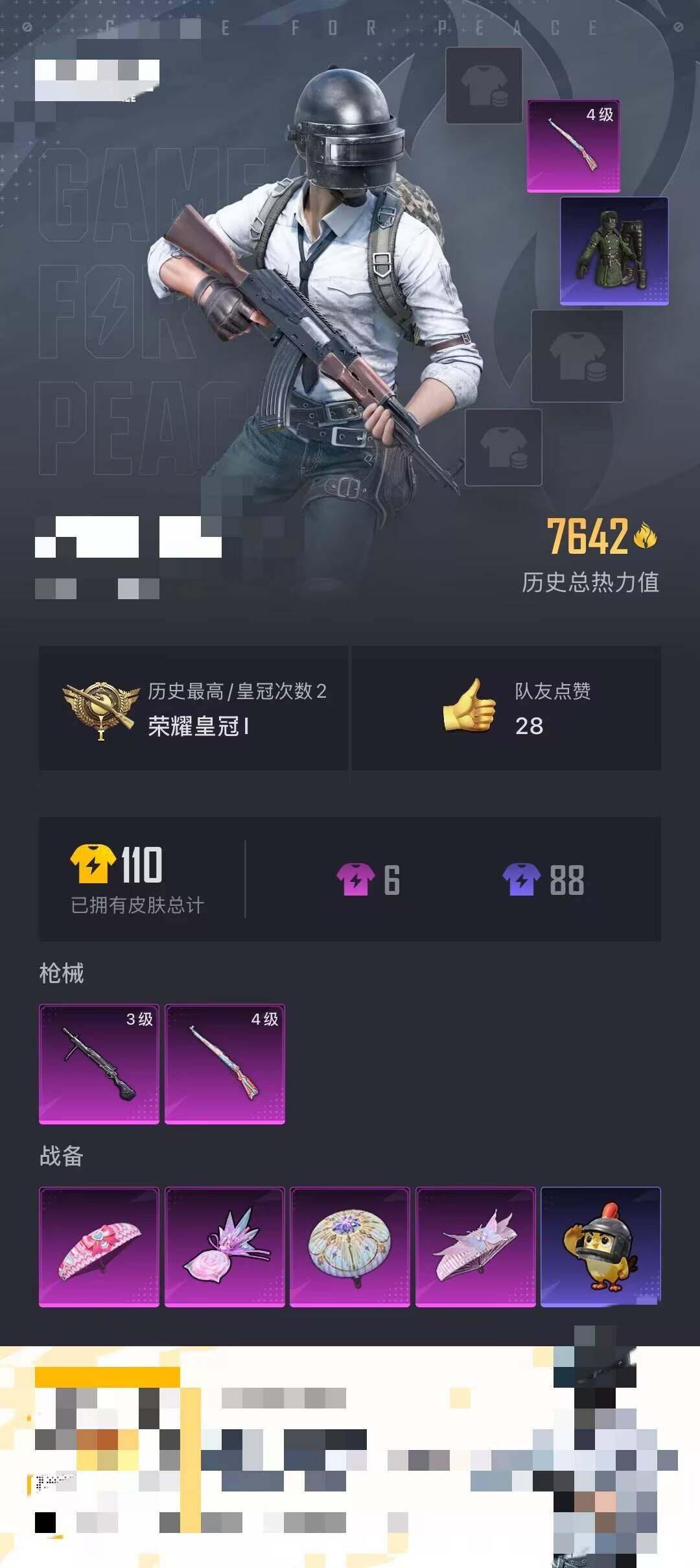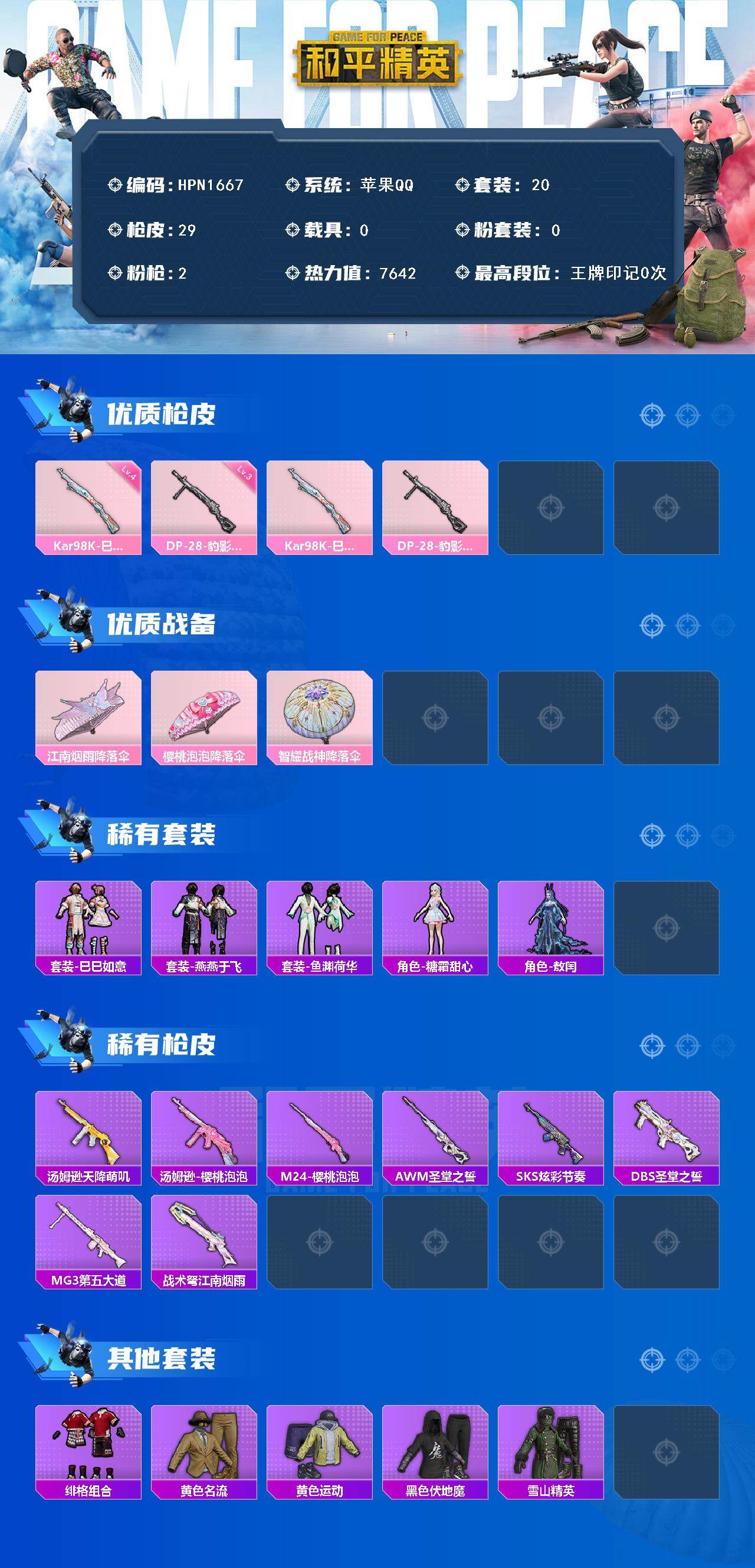 【hpn1667】20套装/呛械2/装备33/战备28/热力值7642/四级kar98k-巳巳如意/三级dp-28-豹影疾电/kar98k-巳巳如意/dp-28-豹影疾电/江南烟雨降落伞/樱桃泡泡降落伞/智耀战神降落伞/套装-巳巳如意/套装-雪国风尚/套装-燕燕于飞/套装-鱼渊荷华/角色-糖霜甜心/角色-敖闰/汤姆逊-天降萌叽/汤姆逊-樱桃泡泡/m24-樱桃泡泡/awm-圣堂之誓/sks-炫彩节奏/dbs-圣堂之誓/mg3-第五大道/战术弩-江南烟雨/套装-绯格组合/套装-黄色名流/套装-黄色运动/套装-黑色伏地魔/套装-雪山精英