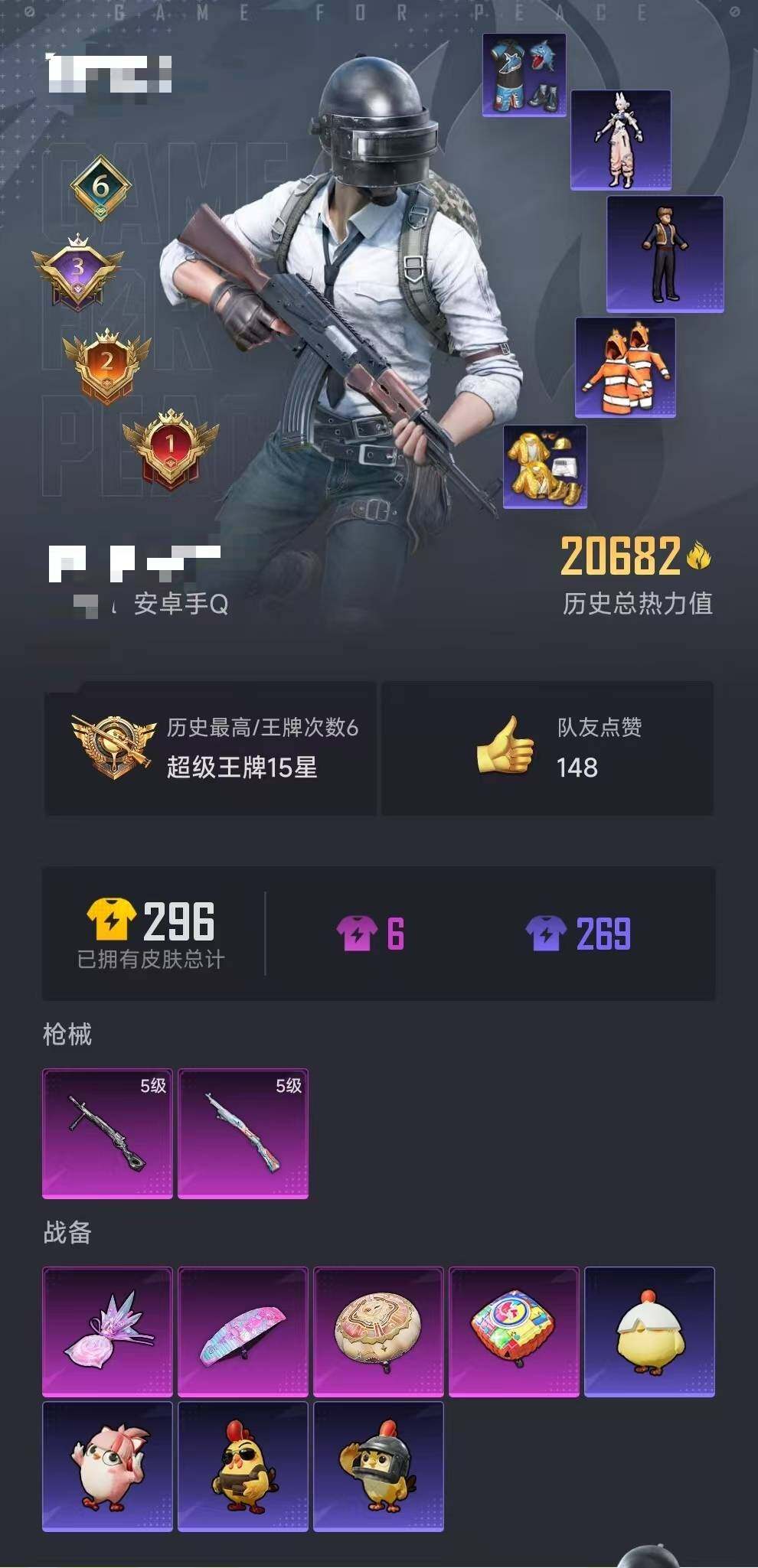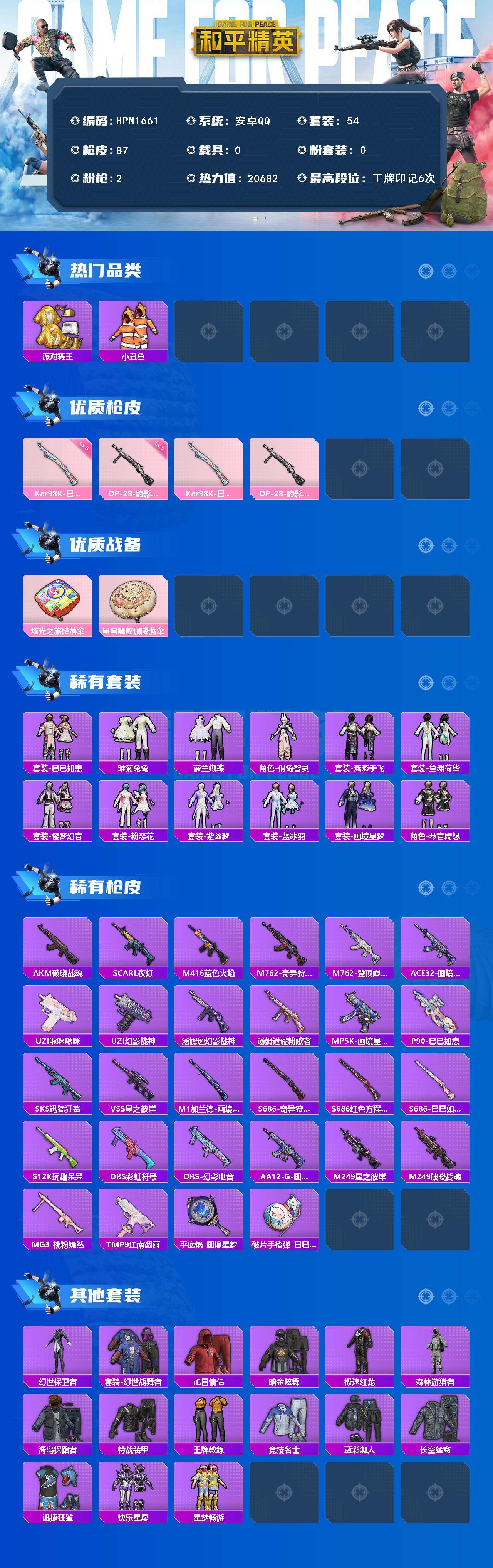 【hpn1661】54套装/呛械2/装备96/战备59/王牌印记6/热力值20682/五级kar98k-巳巳如意/五级dp-28-豹影疾电/套装-派对舞王/套装-小丑鱼/kar98k-巳巳如意/dp-28-豹影疾电/炫光之旅降落伞/星穹咏叹调降落伞/炫彩糖果降落伞/套装-巳巳如意/套装-雪国风尚/套装-炫彩糖果/套装-雏菊兔兔/套装-萝兰蝴蝶/角色-俏兔智灵/套装-燕燕于飞/套装-鱼渊荷华/套装-樱梦幻音/套装-粉恋花/套装-紫幽梦/套装-蓝冰羽/套装-画境星梦/套装-琴音绮想/aug-冰晶雪宝/akm-破晓战魂/scar-l-夜灯/m416-蓝色火焰/m762-奇异狩猎者/m762-登顶巅峰/ace32-画境星梦/uzi-啾咪啾咪/uzi-幻影战神/汤姆逊-幻影战神/汤姆逊-耀粉歌者/mp5k-画境星梦/p90-巳巳如意/sks-迅猛狂鲨/vss-星之彼岸/m1加兰德-画境星梦/s686-奇异狩猎者/s686-红色方程式/s686-巳巳如意/s12k-玩趣呆呆/dbs-彩虹符号/dbs-幻彩电音/aa12-g-画境星梦/m249-星之彼岸/m249-破晓战魂/mg3-桃粉嫣然/tmp-9-江南烟雨/平底锅-画境星梦/破片手留单-巳巳如意/套装-幻世保卫者/套装-幻世战舞者/套装-旭日情侣/套装-暗金炫舞/套装-极速红龙/套装-森林游猎者/套装-海岛探路者/套装-特战装甲/套装-王牌教练/套装-竞技名士/套装-蓝彩潮人/套装-长空猛禽/套装-迅捷狂鲨/套装-快乐星愿/套装-星梦畅游