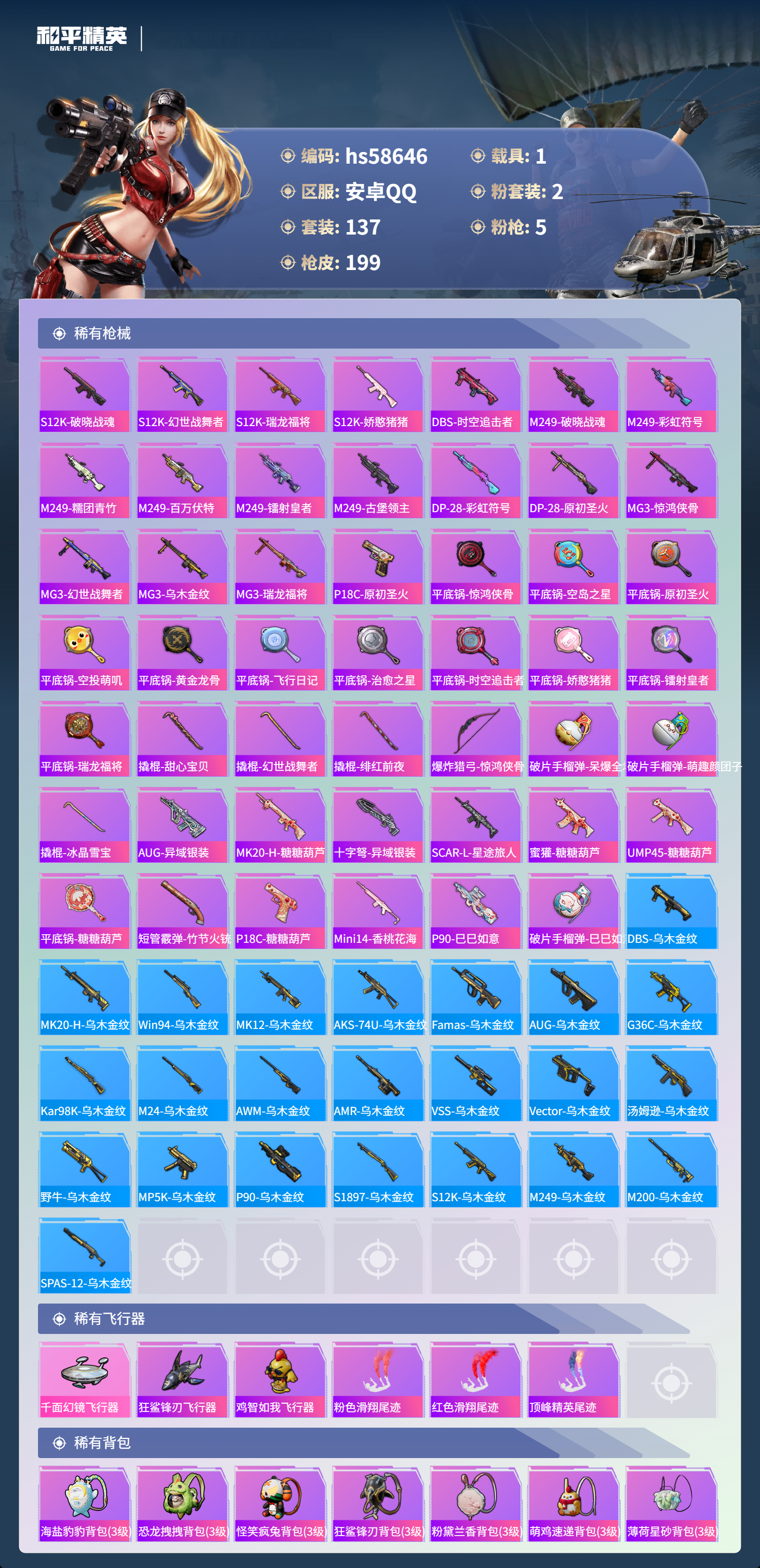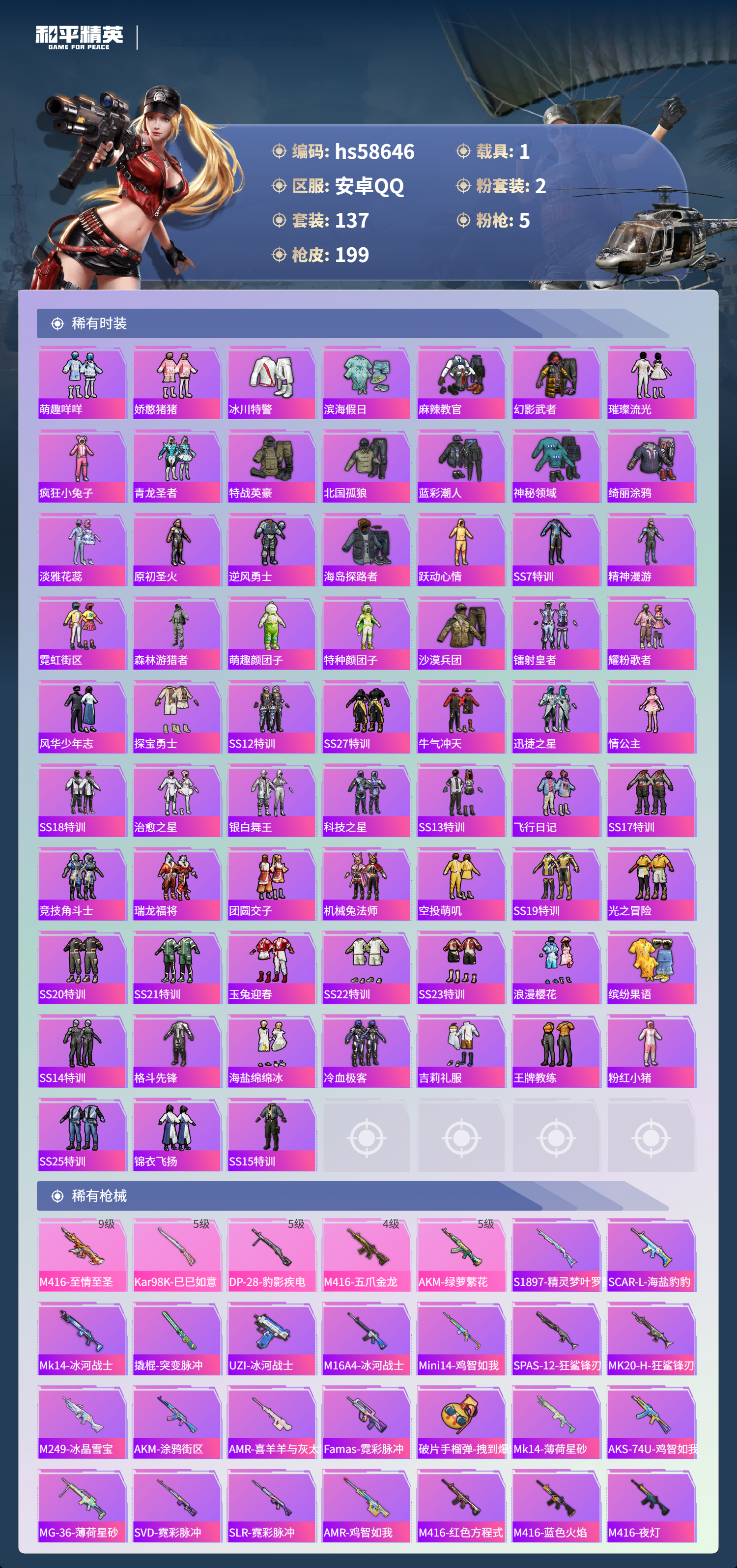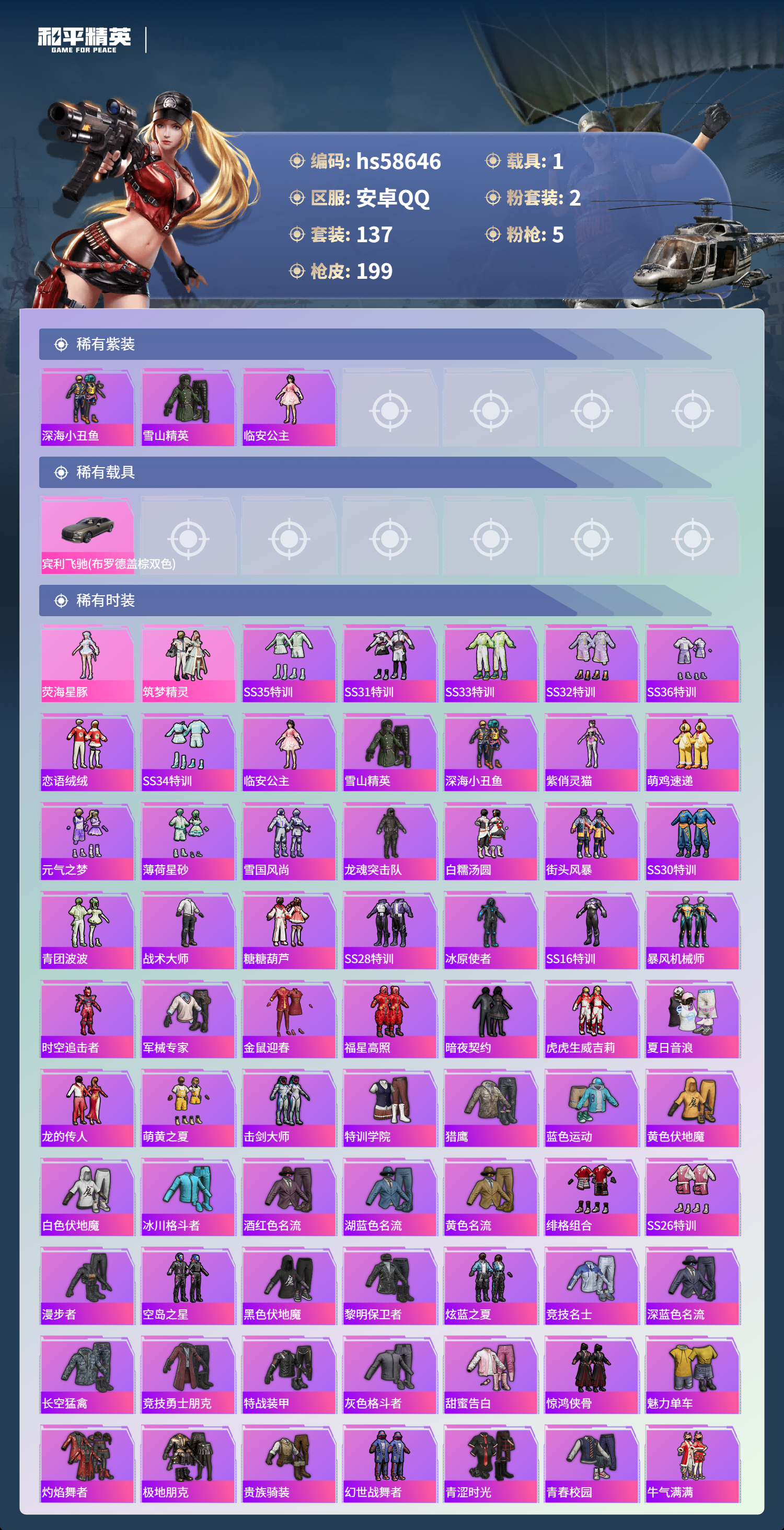 hs58646 安卓手q-6王牌印记-2粉装-5特效呛-1载具-59668热力值-137套装-199呛皮【2粉装】套装-筑梦精灵角色-荧海星豚【5特效呛】m416-五爪金龙/4级m416-至情至圣/9级akm-绿萝繁花/5级kar98k-巳巳如意/5级dp-28-豹影疾电/5级【3稀有紫装】深海小丑鱼雪山精英临安公主【1稀有载具】宾利飞驰布罗德盖棕双色【136稀有时装】