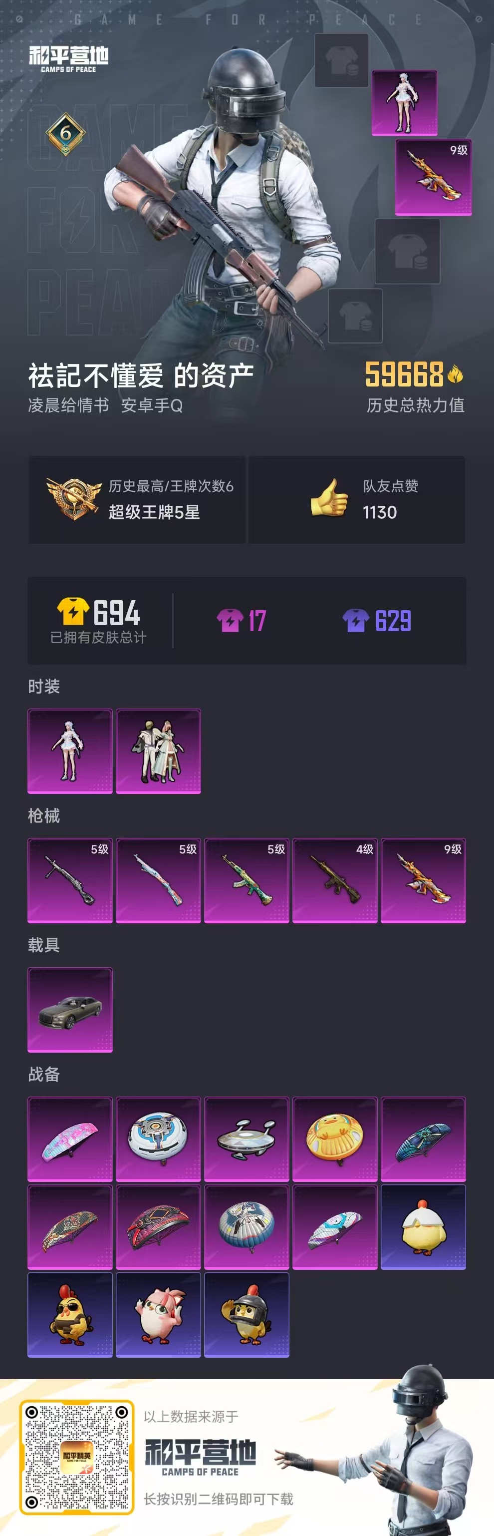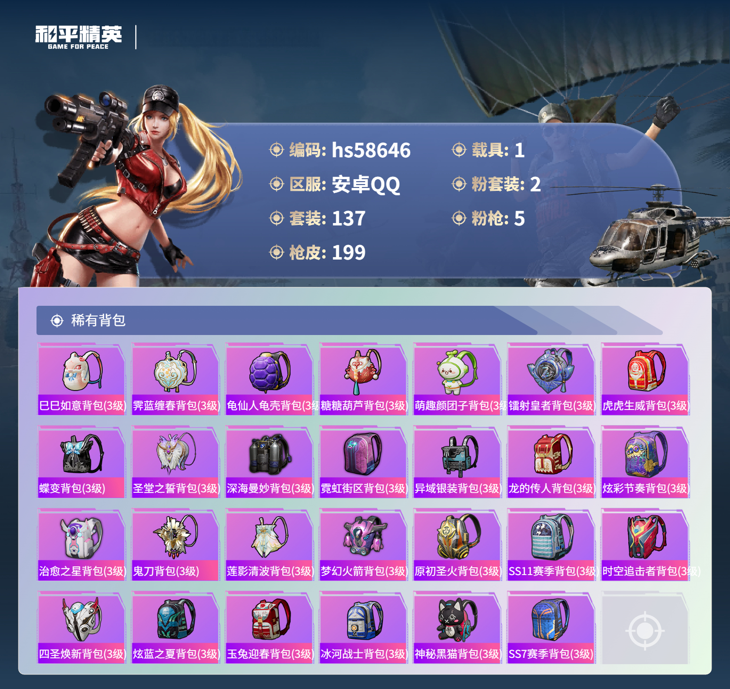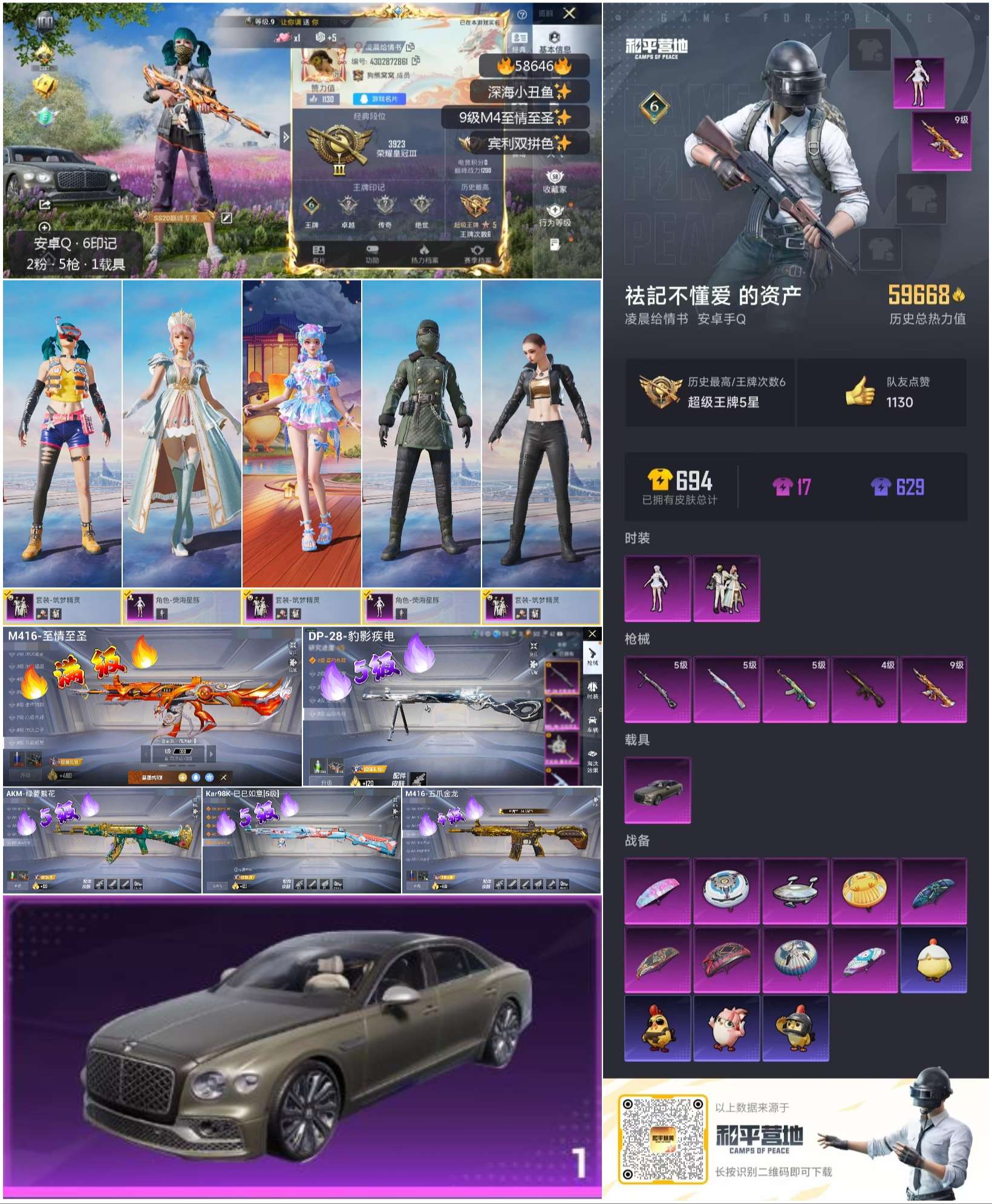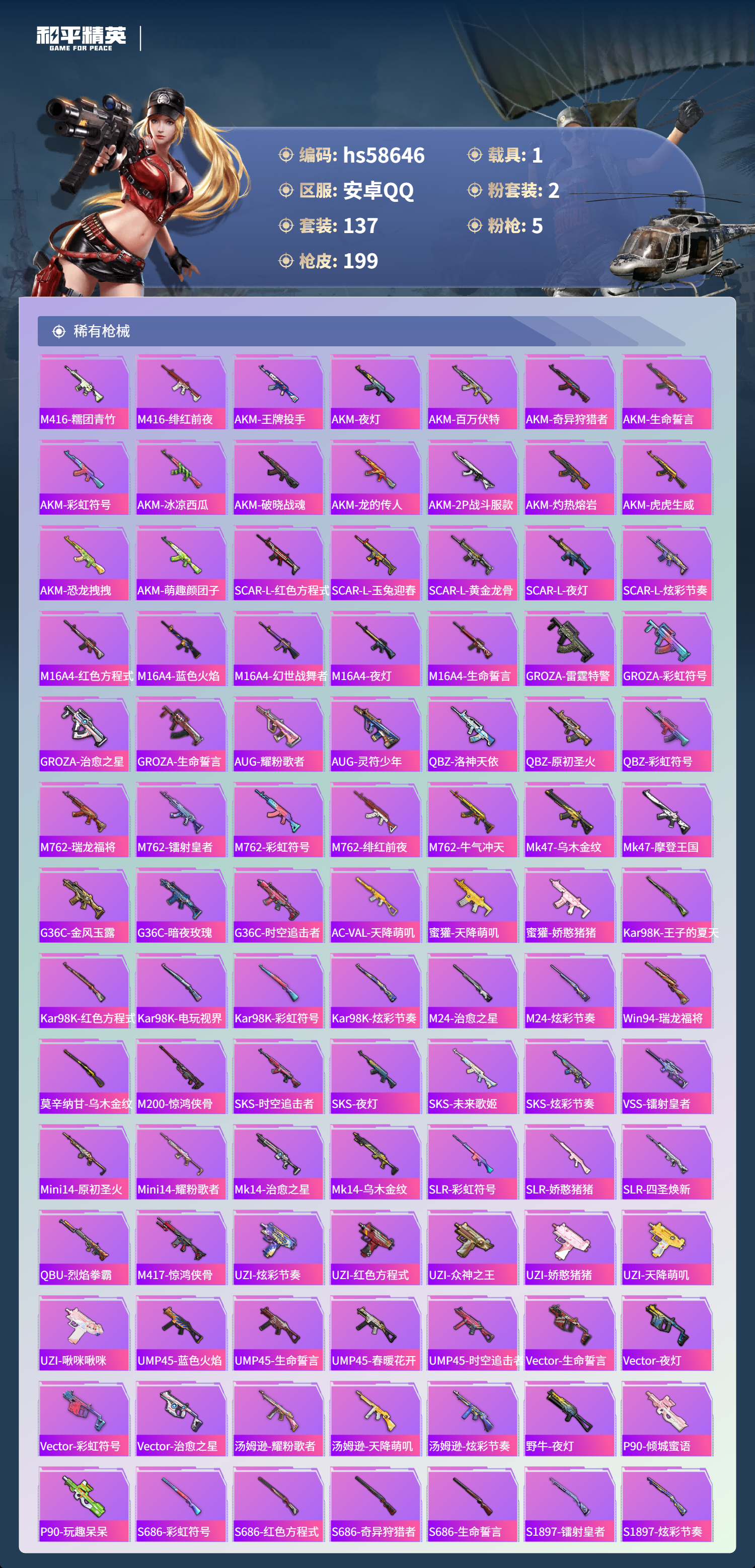 hs58646 安卓手q-6王牌印记-2粉装-5特效呛-1载具-59668热力值-137套装-199呛皮【2粉装】套装-筑梦精灵角色-荧海星豚【5特效呛】m416-五爪金龙/4级m416-至情至圣/9级akm-绿萝繁花/5级kar98k-巳巳如意/5级dp-28-豹影疾电/5级【3稀有紫装】深海小丑鱼雪山精英临安公主【1稀有载具】宾利飞驰布罗德盖棕双色【136稀有时装】