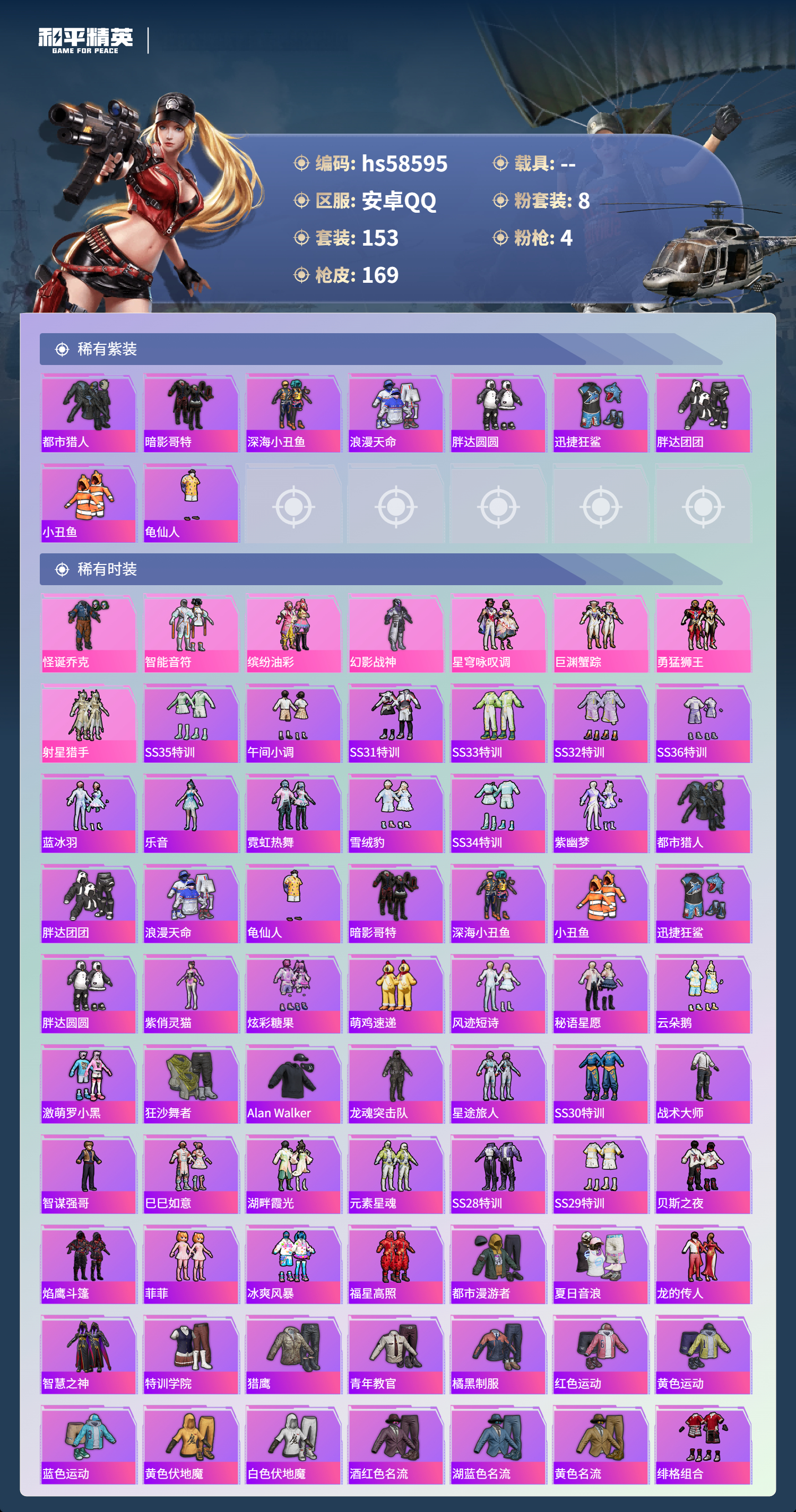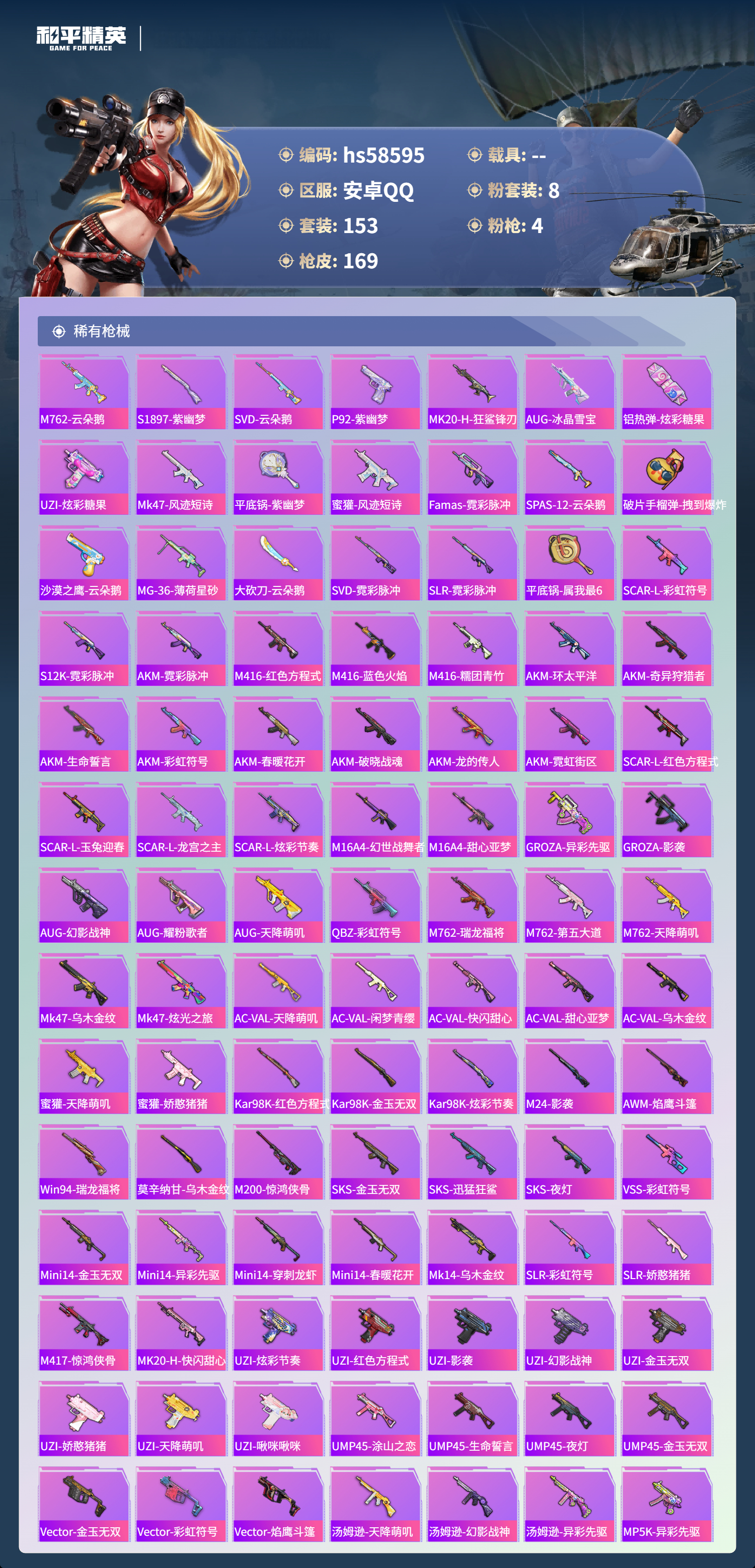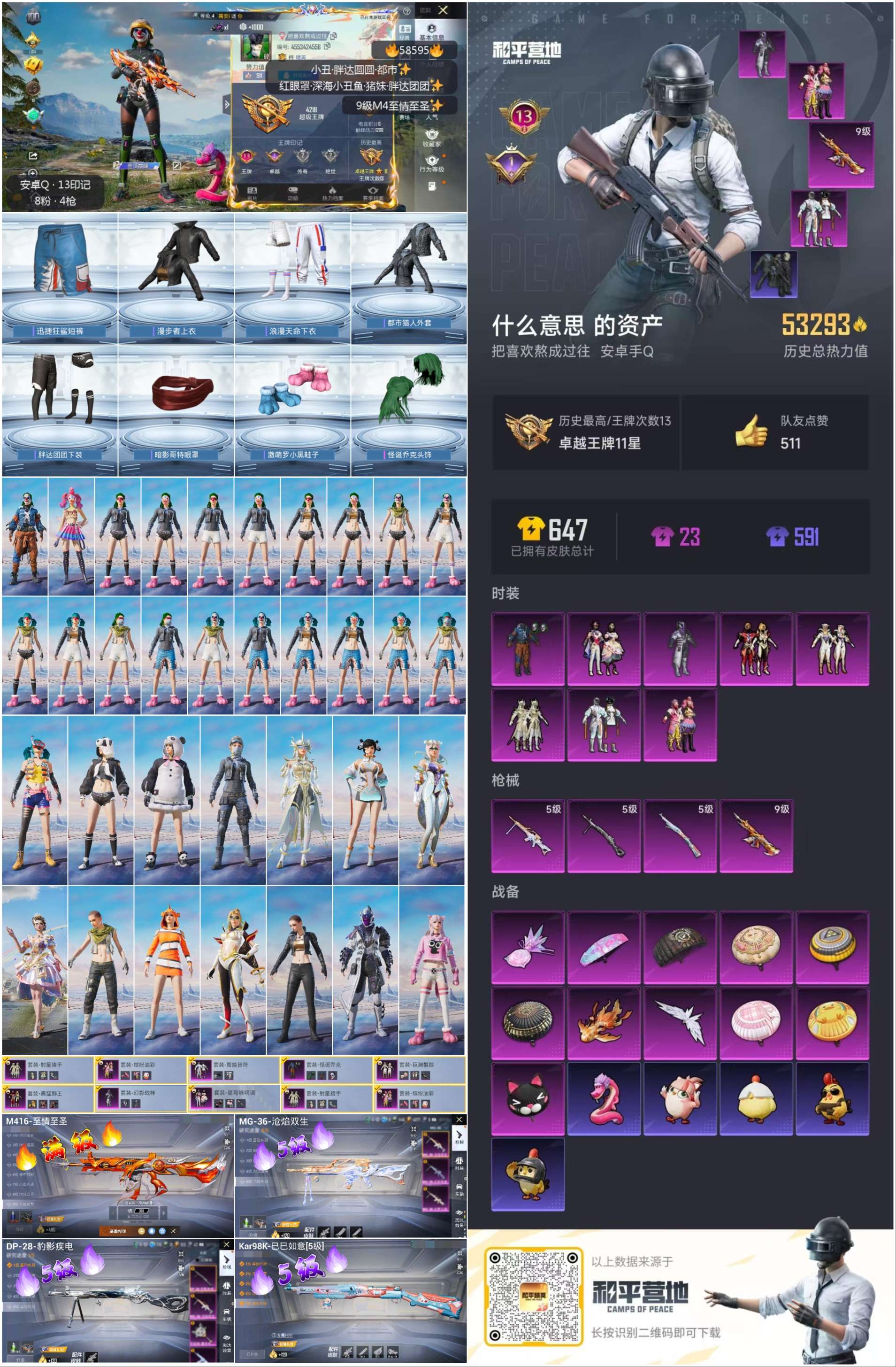 hs58595 安卓手q-13王牌印记-8粉装-4特效呛-53317热力值-153套装-169呛皮-1卓越印记【8粉装】套装-射星猎手套装-智能音符套装-勇猛狮王套装-巨渊蟹踪套装-幻影战神套装-星穹咏叹调套装-怪诞乔克套装-缤纷油彩【4特效呛】dp-28-豹影疾电/5级mg-36-沧焰双生/5级kar98k-巳巳如意/5级m416-至情至圣/9级【9稀有紫装】都市猎人