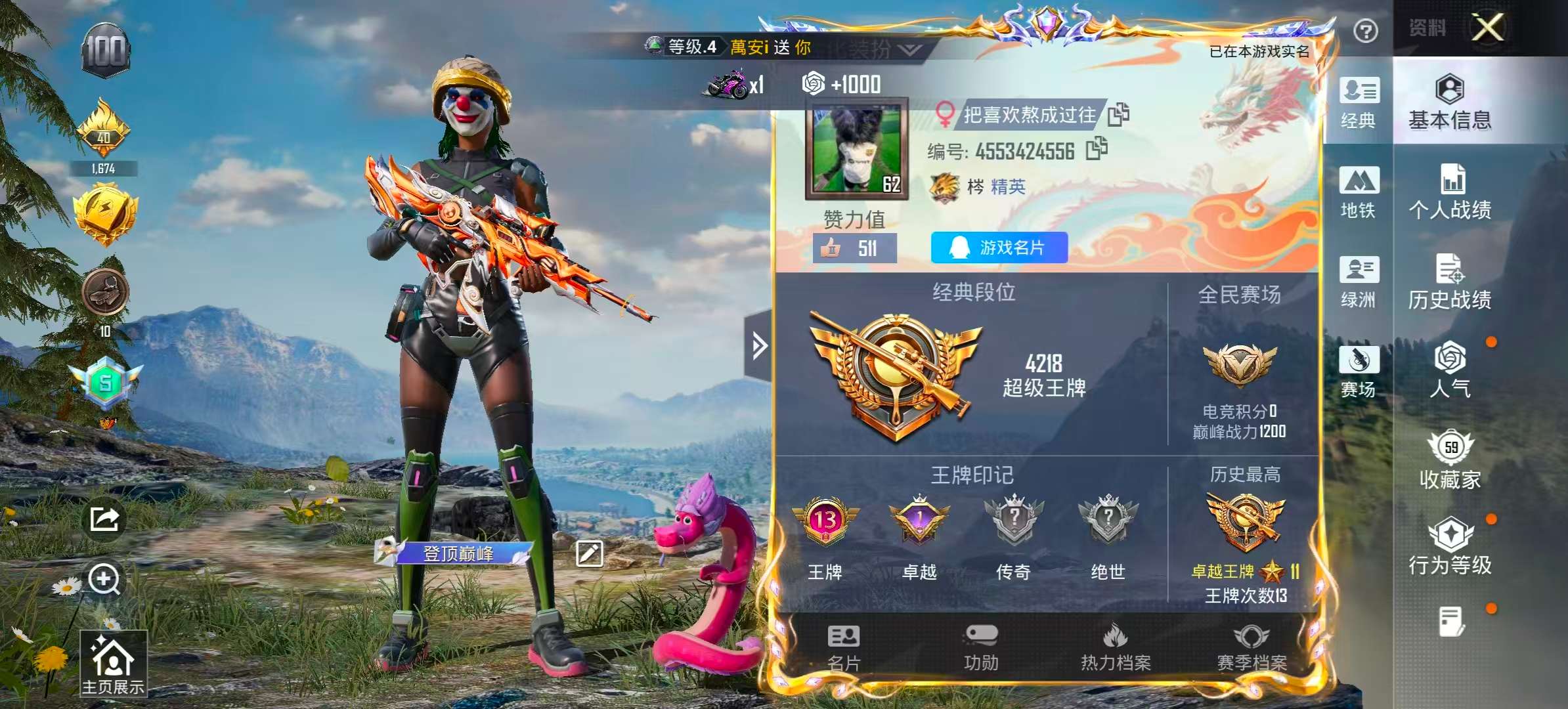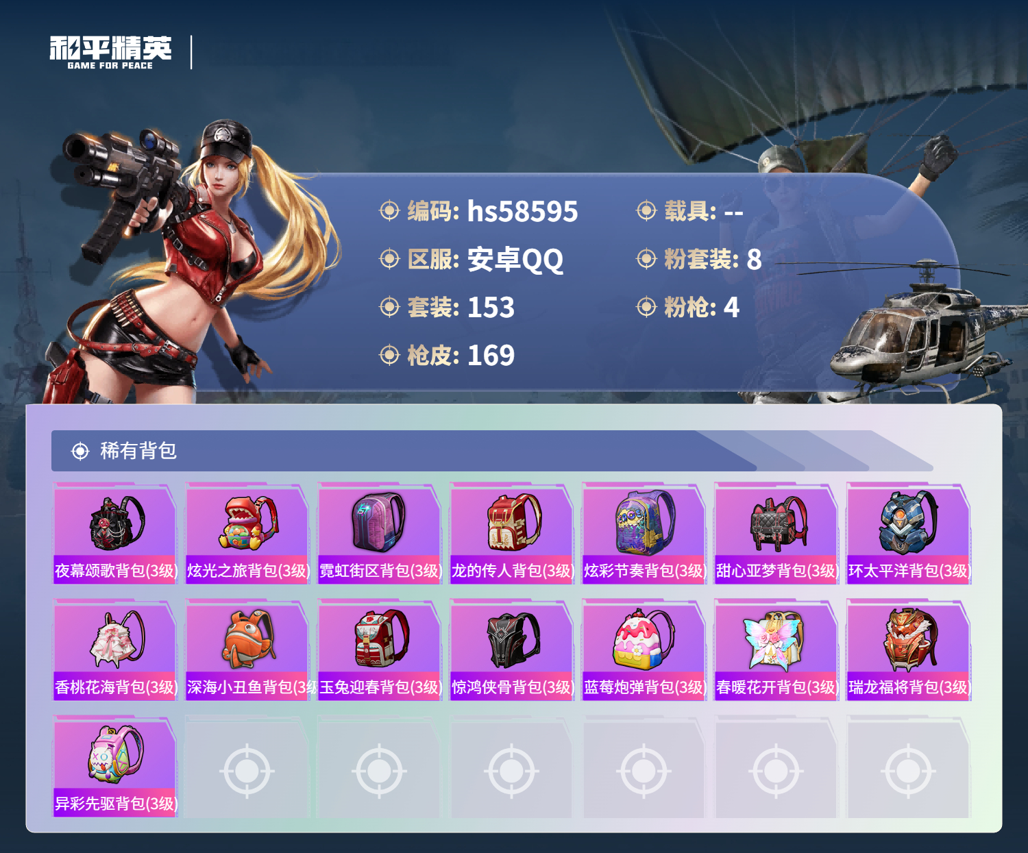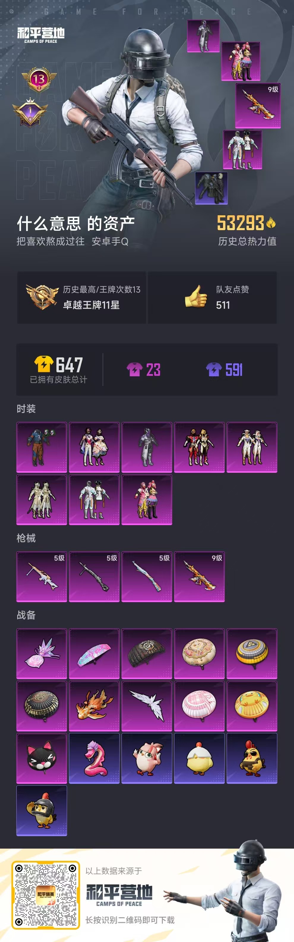 hs58595 安卓手q-13王牌印记-8粉装-4特效呛-53317热力值-153套装-169呛皮-1卓越印记【8粉装】套装-射星猎手套装-智能音符套装-勇猛狮王套装-巨渊蟹踪套装-幻影战神套装-星穹咏叹调套装-怪诞乔克套装-缤纷油彩【4特效呛】dp-28-豹影疾电/5级mg-36-沧焰双生/5级kar98k-巳巳如意/5级m416-至情至圣/9级【9稀有紫装】都市猎人
