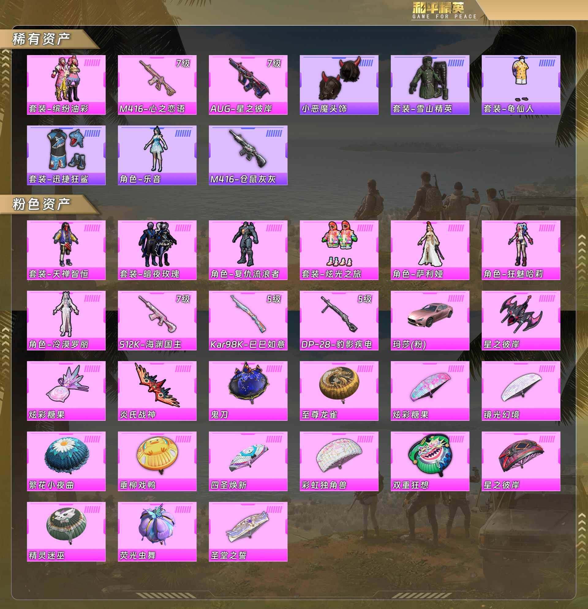 素材号/地铁满天赋/猪妹/小恶魔头饰/雪山精英/狂鲨/天神智恒/暗夜玫瑰/复仇流浪者/炫光之旅/萨莉亚/狂魅哈莉/冷漠罗丽/m4心之恋语7级/aug星之彼岸7级/m4仓鼠灰灰/s12k海渊国主7级/98k如意/dp28豹影疾电/粉玛莎 没战神框(8粉装-5粉呛-1载具)hp5253-3粉色飞行器-80777热力值-9王牌印记-180套装-254呛皮 【热门品类】:粉装-缤纷油彩,套装-龟仙人 【粉色套装】:粉装-缤纷油彩,粉装-天禅智恒,粉装-暗夜玫瑰,角色-复仇流浪者,粉装-炫光之旅,角色-萨利娅,角色-狂魅哈莉,角色-冷漠罗丽 【粉色呛皮等级】:m416-心之恋语七级,aug-星之彼岸七级,kar98k-巳巳如意五级,s12k-海渊国主七级,dp-28-豹影疾电五级 【粉色载具】:玛莎拉蒂ghibli(粉) 【粉色呛皮】:m416-心之恋语,aug-星之彼岸,kar98k-巳巳如意,s12k-海渊国主,dp-28-豹影疾电 【粉色飞行器】:星之彼岸飞行器 【粉色降落伞】:至尊龙雀降落伞,精灵迷巫降落伞,繁花小夜曲降落伞,四圣焕新降落伞,荧光虫舞降落伞,星之彼岸降落伞,垂柳戏鸭降落伞,镜光幻境降落伞,圣堂之誓降落伞,鬼刀降落伞,彩虹独角兽降落伞,双重狂想降落伞,炫彩糖果降落伞 【稀有套装】:套装-龟仙人,套装-巳巳如意,套装-雪国风尚,套装-雏菊兔兔,套装-萝兰蝴蝶,角色-狂花道·雅典娜,套装-燕燕于飞,套装-鱼渊荷华,角色-风玲,套装-粉恋花,套装-紫幽梦,套装-蓝冰羽,角色-猎影月神,套装-星影赞美诗,套装-彩虹兔,套装-云朵鹅,套装-雪绒豹,套装-诡诞巡游,角色-乐音,套装-蓝海鲸歌,套装-朱霞炽焰,套装-凌霄紫焰,套装-擎苍青焰 【稀有呛皮】:akm-冰凉西瓜,akm-星之彼岸,akm-环太平洋,akm-破晓战魂,akm-霓虹街区,akm-龙的传人,m16a4-机械英豪,m16a4-红色方程式,m16a4-千金淑猫,scar-l-玉兔迎春,scar-l-繁花小夜曲,m416-仓鼠灰灰,m416-糯团青竹,m416-绯红前夜,groza-懵萌河马,groza-治愈之星,groza-田园牧歌,groza-黑色刀锋,aug-天降萌叽,aug-终结者,aug-耀粉歌者,q-原初圣火,q-未来歌姬,q-诡娃娃,m762-快乐主宰,m762-拳皇97,m762-牛气冲天,m762-瑞龙福将,m762-第五大道,m762-绯红前夜,m762-诡娃娃,m762-镭射皇者,m762-云朵鹅,mk47-粉色回忆,g36c-懵萌河马,g36c-荒野猎神,g36c-星穹咏叹调,ac-val-天降萌叽,ac-val-快闪甜心,蜜獾-垂柳戏鸭,蜜獾-天降萌叽,蜜獾-娇憨猪猪,arx-凌霄紫焰,uzi-天降萌叽,uzi-娇憨猪猪,uzi-炫彩节奏,uzi-红色方程式,ump45-天启纪元,ump45-诡娃娃,vect-彩虹符号,vect-暗夜玫瑰,vect-治愈之星,vect-生命誓言,vect-田园牧歌,vect-黑色刀锋,汤姆逊-环太平洋,汤姆逊-耀粉歌者,野牛-机械英豪,aks-74u-鬼刀,js9-凌霄紫焰,p90-快闪甜心,p90-金蛇镇世,kar98k-彩虹符号,kar98k-炫彩节奏,kar98k-狮舞迎春,m24-治愈之星,m24-冰封烈焰,awm-不夜海上花,sks-夜灯,sks-糯团青竹,sks-诡娃娃,sks-迅猛狂鲨,vss-星之彼岸,vss-田园牧歌,vss-镭射皇者,vss-黑色刀锋,mini14-原初圣火,mini14-梦幻火箭,mini14-涂山之恋,mini14-炫彩节奏,mini14-穿刺龙虾,mini14-银河战甲,mini14-阿狸红,mk14-治愈之星,win94-机械英豪,win94-瑞龙福将,slr-四圣焕新,slr-娇憨猪猪,莫辛纳甘-懵萌河马,amr-鬼刀,m417-惊鸿侠骨,mk20-h-快闪甜心,m200-惊鸿侠骨,m200-爆裂游戏,svd-云朵鹅,svd-冷漠罗丽,s686-冰封烈焰,s686-生命誓言,s1897-勇闯险境,s1897-炫彩节奏,s1897-镭射皇者,s1897-荧海星豚,s12k-玩趣呆呆,s12k-瑞龙福将,s12k-夏日绵绵冰,s12k-娇憨猪猪,s12k-机械英豪,dbs-彩虹符号,dbs-月下星之子,spas-12-田园牧歌,spas-12-云朵鹅,m249-四圣焕新,m249-彩虹符号,m249-拳皇97,m249-星之彼岸,m249-糯团青竹,m249-莲影清波,m249-镭射皇者,dp-28-原初圣火,dp-28-未来战士,dp-28-甜心宝贝,mg3-惊鸿侠骨,mg3-瑞龙福将,mg3-萝萝小趴兔,pkm-懵萌河马,mg-36-凌霄紫焰,p92-拳皇97,p92-凌霄紫焰,p1911-冰封烈焰,p18c-原初圣火,短管霰弹-星穹咏叹调,沙墨之鹦-快闪甜心,沙墨之鹦-云朵鹅,爆炸猎弓-天星战神,爆炸猎弓-惊鸿侠骨,大砍刀-粉色回忆,大砍刀-云朵鹅,大砍刀-鬼刀,撬棍-双重狂想,平底锅-凌霄紫焰,燃烧瓶-甜梦桃焰,破片手留单-巳巳如意 【其他套装】:套装-ss5特训,套装-ss6特训,套装-ss7特训,套装-ss8特训,套装-ss11特训,套装-ss12特训,套装-ss13特训,套装-ss14特训,套装-ss16特训,套装-ss17特训,套装-ss18特训,套装-ss19特训,套装-ss20特训,套装-ss21特训,套装-ss22特训,套装-ss23特训,套装-ss24特训,套装-ss25特训,套装-ss26特训,套装-ss27特训,套装-ss28特训,套装-ss29特训,套装-丛林猎人,套装-传奇侦探,套装-光之冒险,套装-北国孤狼,套装-夏日音浪,套装-好奇恐龙,套装-幻世战舞者,套装-幻影武者,套装-怒火燎原,套装-拳皇97草薙京,套装-旭日情侣,套装-春日漫步,套装-暗金炫舞,套装-格斗专家,套装-格斗先锋,套装-沙漠兵团,套装-滨海厨神,套装-炽焰拳师,套装-爱崽白熊,套装-牛气冲天,套装-牛气满满,套装-特战装甲,套装-特殊使命,套装-玉兔迎春,套装-王牌教练,套装-甜蜜告白,套装-甜蜜熊情侣,套装-疯狂小兔子,套装-破蛋小黄鸡,套装-神秘领域,套装-福星高照,套装-空岛之星,套装-竞技勇士朋克,套装-竞技名士,套装-绯格组合,套装-缤纷果语,套装-荣耀,套装-萌黄之夏,套装-蓝色运动,套装-街头潮人,套装-跃动心情,套装-都市漫游者,套装-酒红色名流,套装-金鼠迎春,套装-长空猛禽,套装-霓虹街区,套装-青春校园,套装-青涩时光,套装-青玉碎影,套装-飞行日记,套装-魅力单车,套装-黄色名流,套装-黄色格斗者,套装-黑色伏地魔,套装-龟仙人,套装-极地朋克,套装-街舞达人,套装-迅捷狂鲨,套装-冰川特警,套装-旷