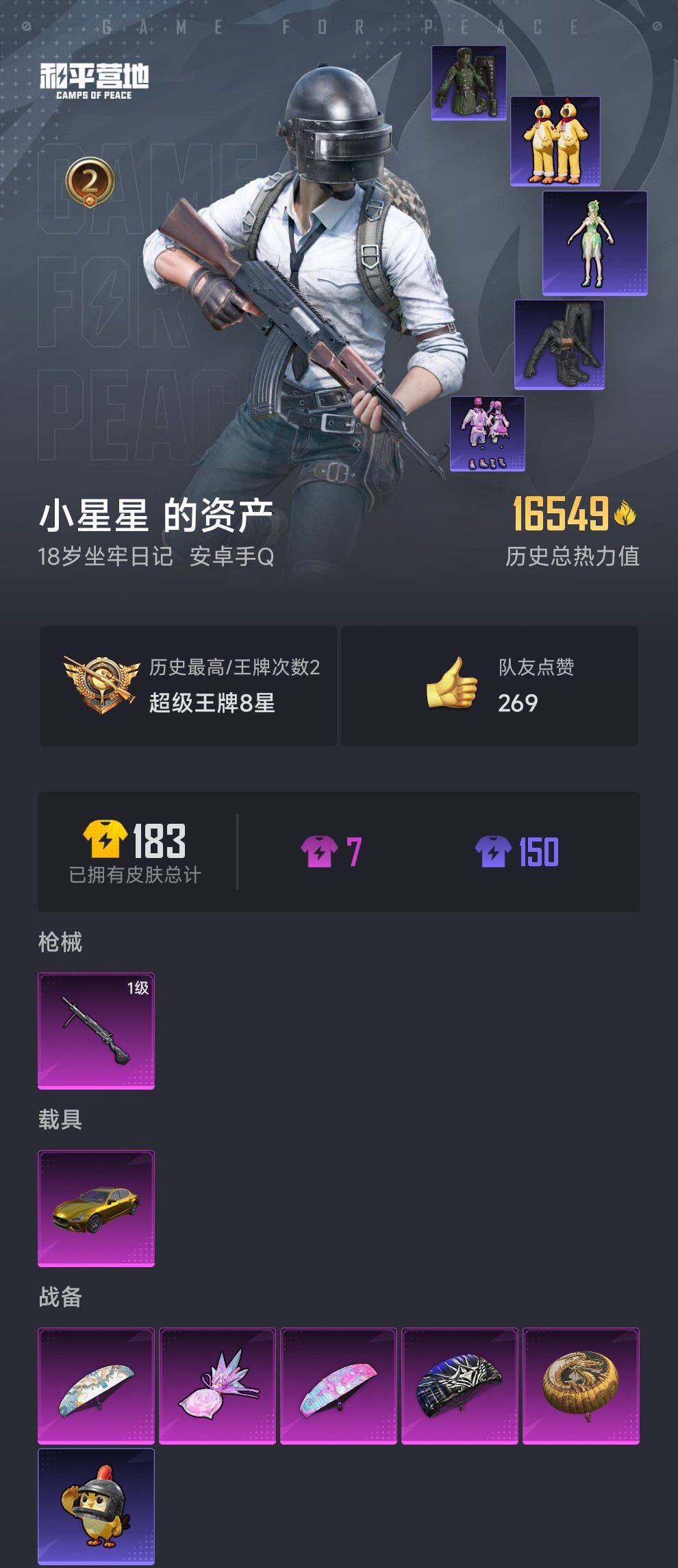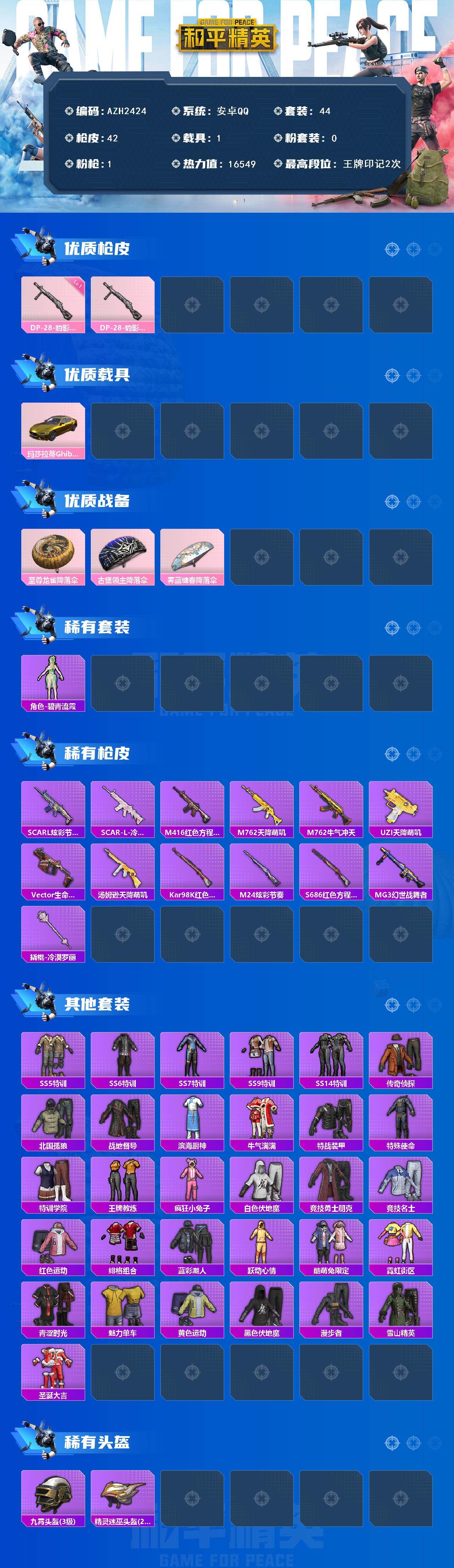 安卓 手q【金玛莎拉蒂】0粉装-1特效呛-1载具-1粉色飞行器-16549热力值-2王牌印记-44套装-42呛皮 【粉色呛皮等级】:dp-28-豹影疾电一级 【粉色载具】:玛莎拉蒂ghibli(金) 【粉色呛皮】:dp-28-豹影疾电 【粉色降落伞】:至尊龙雀降落伞,古堡领主降落伞,炫彩糖果降落伞,霁蓝缠春降落伞 【稀有套装】:套装-雪国风尚,套装-炫彩糖果,角色-碧青流霞 【稀有呛皮】: