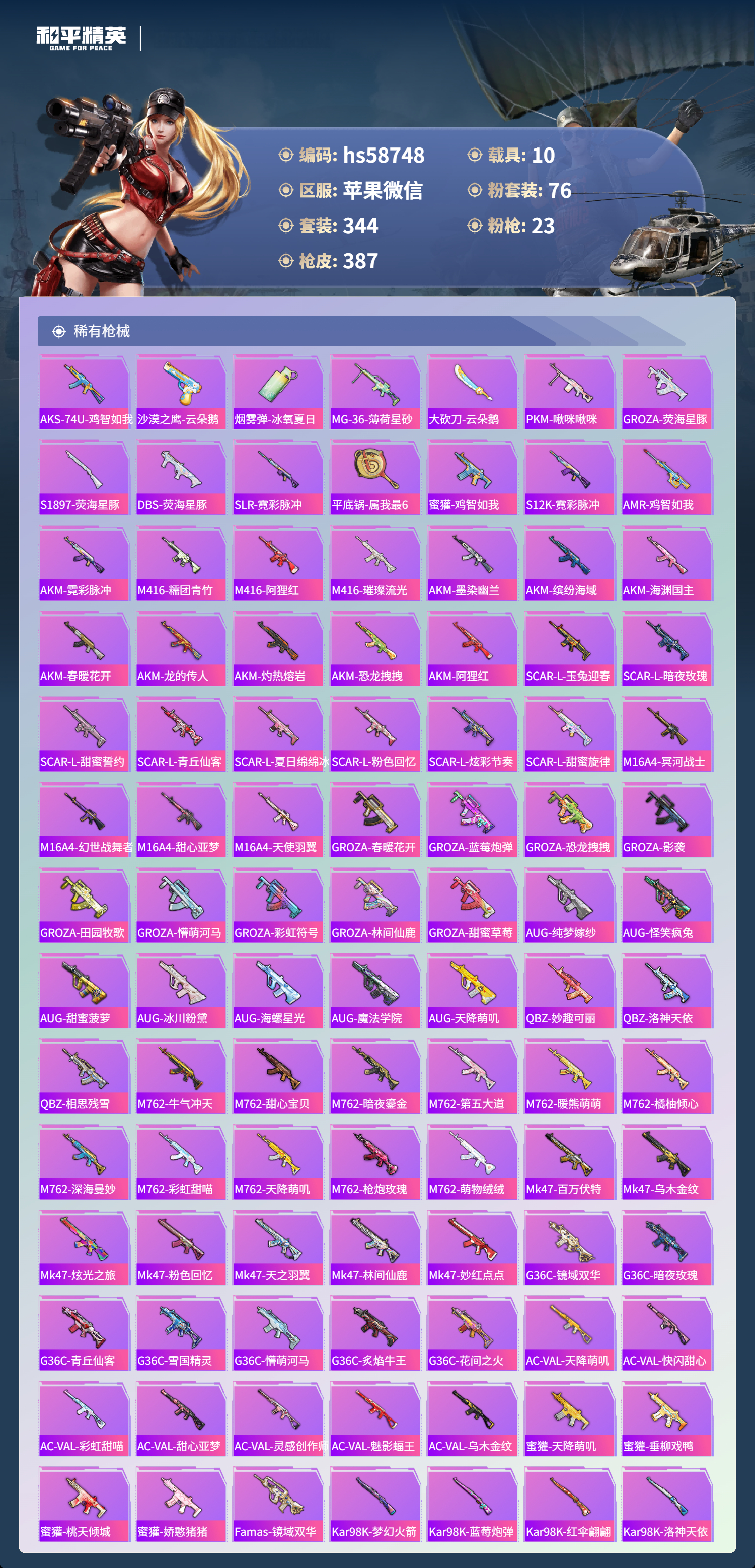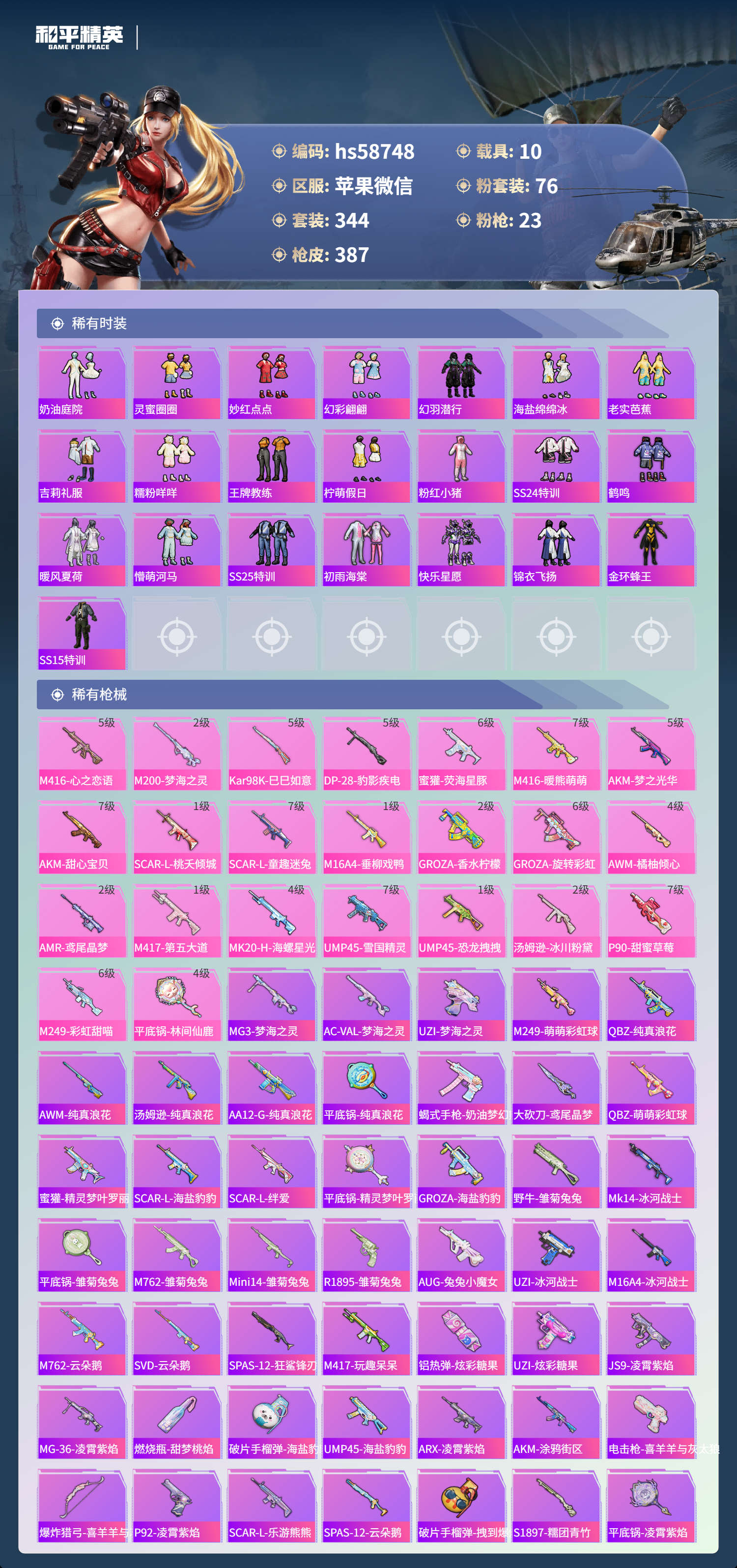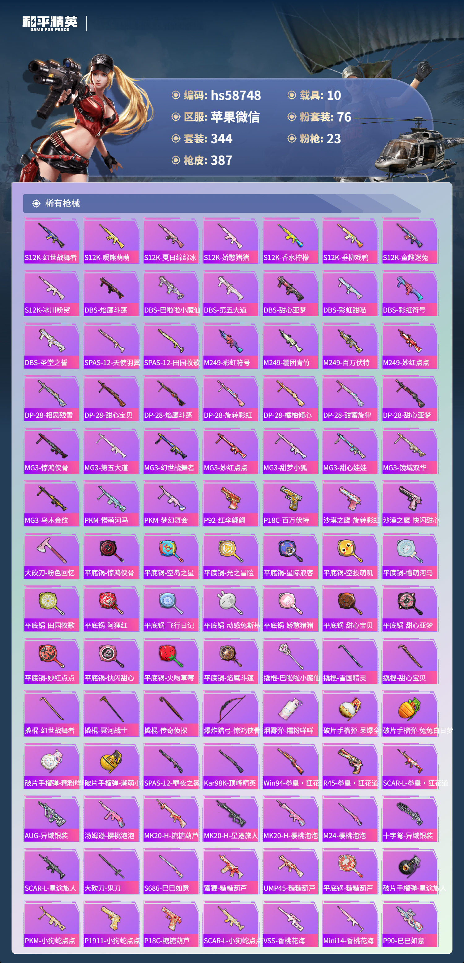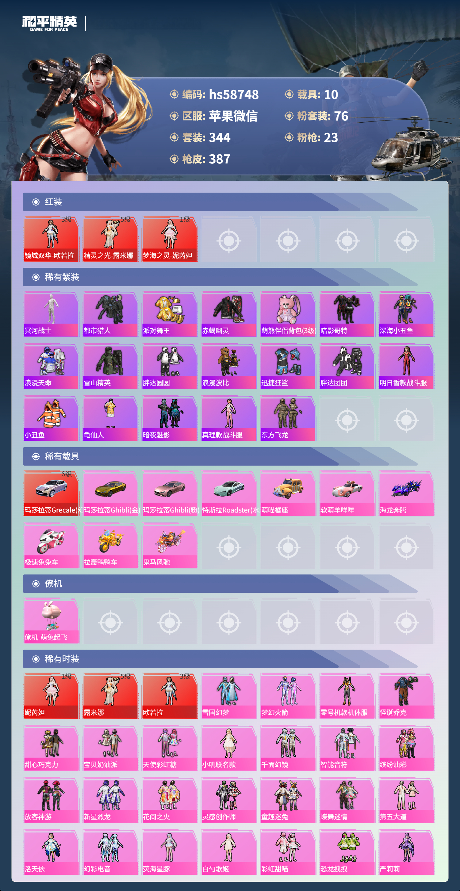 hs58748 苹果微信-17王牌印记-有战神框-3红装-76粉装-23特效呛-10载具-热力值-344套装-387呛皮-5卓越印记-3传奇印记【3红装】精灵之光-露米娜/5级镜域双华-欧若拉/3级梦海之灵-妮芮妲/1级【76粉装】套装-天衡星秤角色-小蓝角色-荧海星豚角色-樱桃泡泡套装-雪国幻梦套装-桃夭倾城套装-天使彩虹糖角色-洛天依套装-幻彩电音套装-蝶