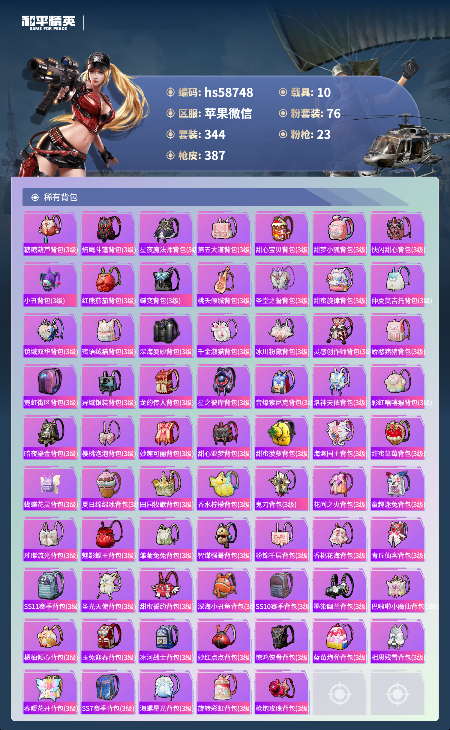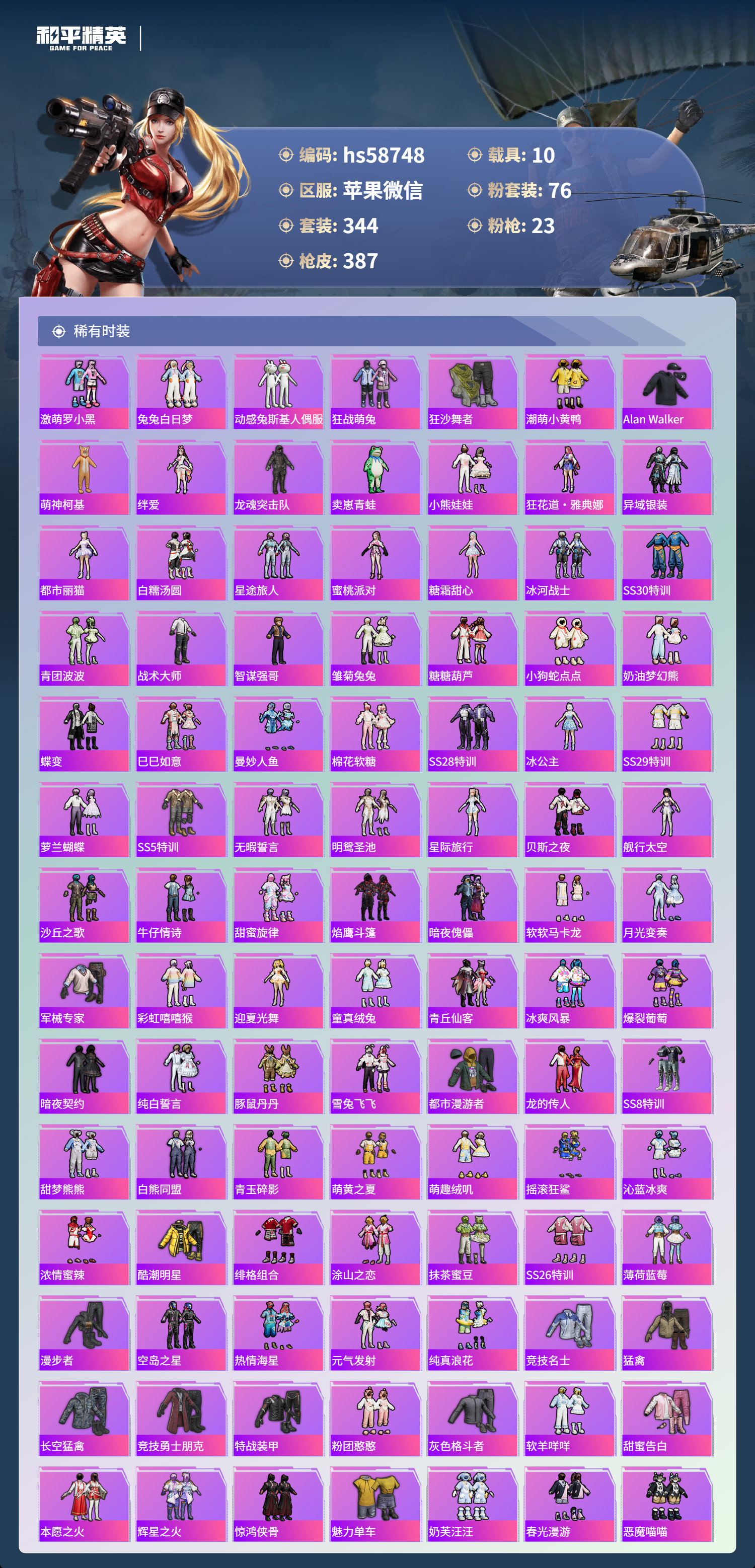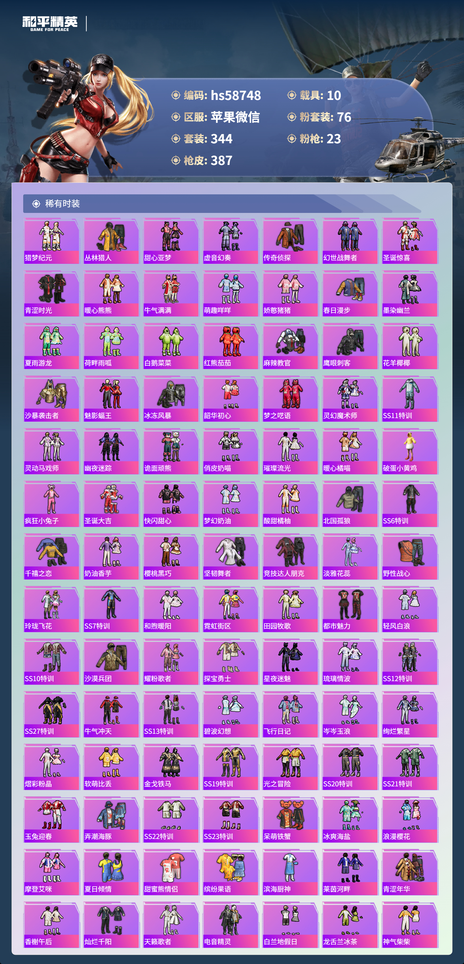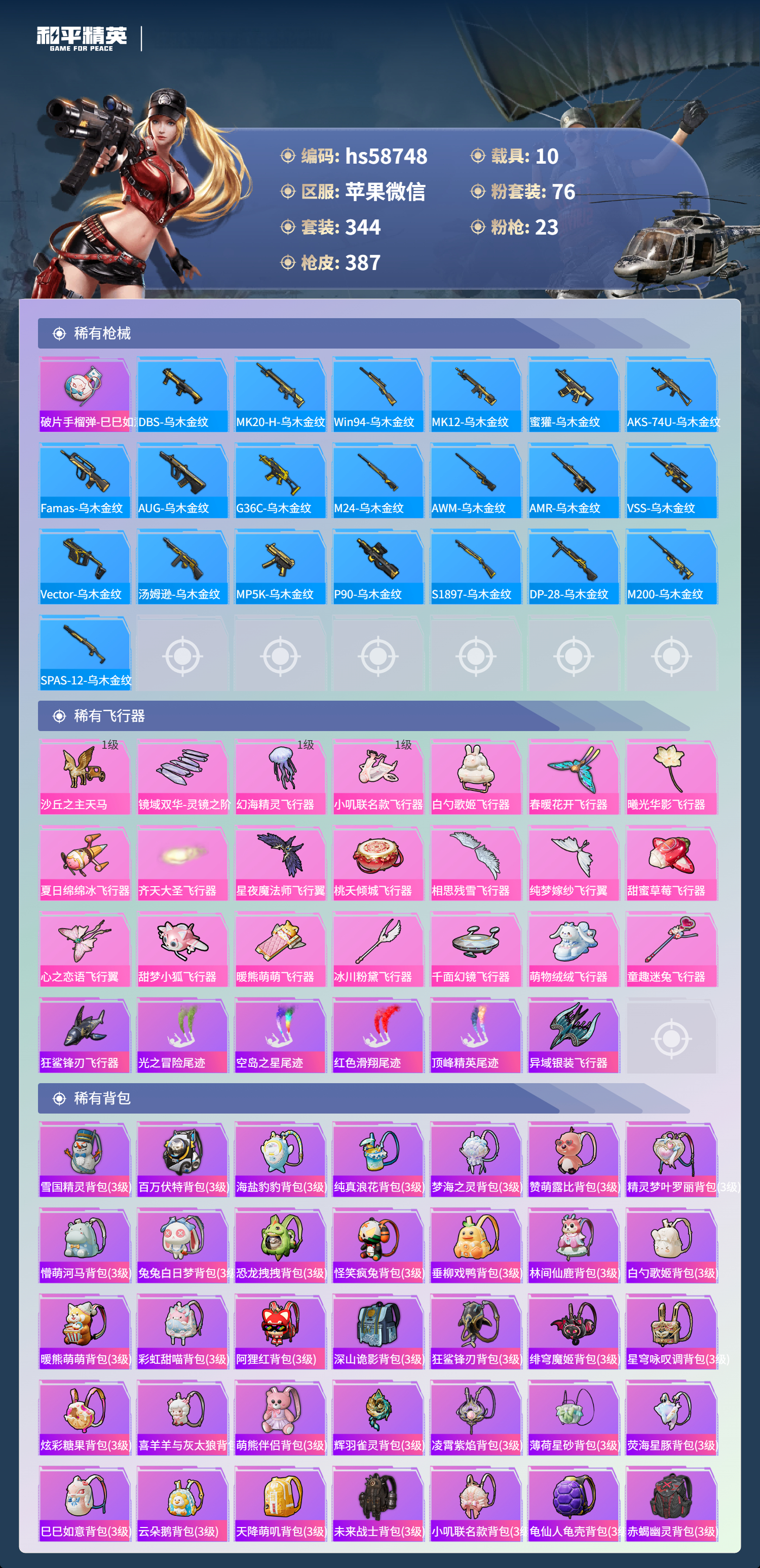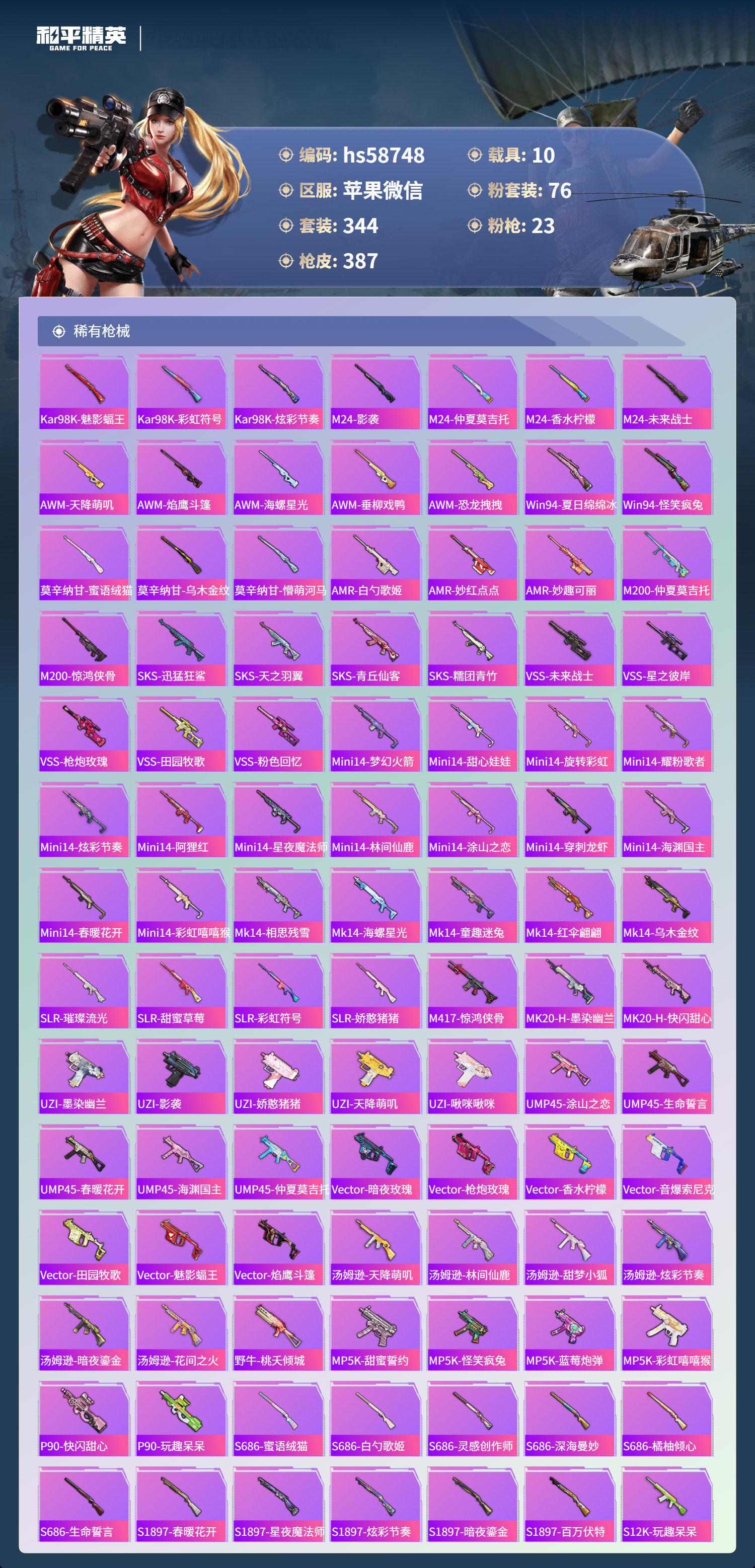 hs58748 苹果微信-17王牌印记-有战神框-3红装-76粉装-23特效呛-10载具-热力值-344套装-387呛皮-5卓越印记-3传奇印记【3红装】精灵之光-露米娜/5级镜域双华-欧若拉/3级梦海之灵-妮芮妲/1级【76粉装】套装-天衡星秤角色-小蓝角色-荧海星豚角色-樱桃泡泡套装-雪国幻梦套装-桃夭倾城套装-天使彩虹糖角色-洛天依套装-幻彩电音套装-蝶