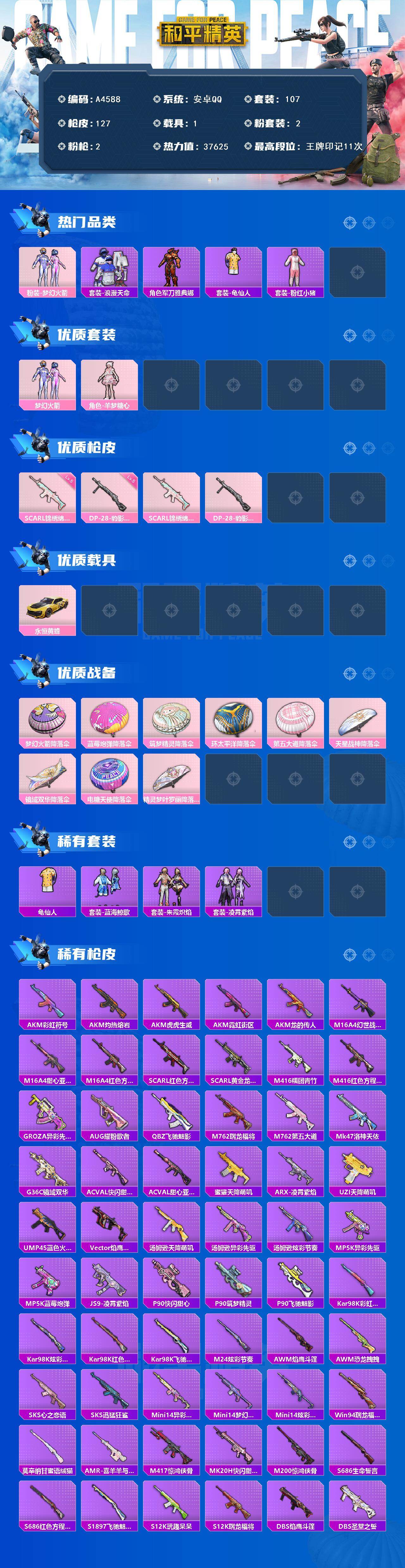 [15971796]安卓 【公主号 梦幻火箭/浪漫天命/龟仙人/羊梦糖心/scar-l-锦绣绵绵五级/永恒黄蜂】手q-2粉装-2特效呛-1载具-0粉色飞行器-37625热力值-11王牌印记-107套装-127呛皮 【热门品类】:粉装-梦幻火箭,套装-浪漫天命,角色-军刀雅典娜,套装-龟仙人,套装-粉红小猪 【粉色套装】:粉装-梦幻火箭,角色-羊梦糖心 【粉色呛皮等级】:scar-l-锦绣绵绵五级,dp-28-豹影疾电五级 【粉色载具】:永恒黄蜂 【粉色呛皮】:scar-l-锦绣绵绵,dp-28-豹影疾电 【粉色降落伞】:梦幻火箭降落伞,蓝莓炮弹降落伞,筑梦精灵降落伞,环太平洋降落伞,第五大道降落伞,天星战神降落伞,镜域双华降落伞,电糖天使降落伞,精灵梦叶罗丽降落伞 【稀有套装】:套装-龟仙人,套装-雪国风尚,套装-蓝海鲸歌,套装-朱霞炽焰,套装-凌霄紫焰 【稀有呛皮】:akm-彩虹符号,akm-灼热熔岩,akm-虎虎生威,akm-霓虹街区,akm-龙的传人,m16a4-幻世战舞者,m16a4-甜心亚梦,m16a4-红色方程式,scar-l-红色方程式,scar-l-黄金龙骨,m416-糯团青竹,m416-红色方程式,groza-异彩先驱,aug-耀粉歌者,q-飞驰魅影,m762-瑞龙福将,m762-第五大道,mk47-洛神天依,g36c-镜域双华,ac-val-快闪甜心,ac-val-甜心亚梦,蜜獾-天降萌叽,arx-凌霄紫焰,uzi-天降萌叽,ump45-蓝色火焰,vect-焰鹰斗篷,汤姆逊-天降萌叽,汤姆逊-异彩先驱,汤姆逊-炫彩节奏,mp5k-异彩先驱,mp5k-蓝莓炮弹,js9-凌霄紫焰,p90-快闪甜心,p90-筑梦精灵,p90-飞驰魅影,kar98k-彩虹符号,kar98k-炫彩节奏,kar98k-红色方程式,kar98k-飞驰魅影,m24-炫彩节奏,awm-焰鹰斗篷,awm-恐龙拽拽,sks-心之恋语,sks-迅猛狂鲨,mini14-异彩先驱,mini14-梦幻火箭,mini14-炫彩节奏,win94-瑞龙福将,莫辛纳甘-蜜语绒猫,amr-喜羊羊与灰太狼,m417-惊鸿侠骨,mk20-h-快闪甜心,m200-惊鸿侠骨,s686-生命誓言,s686-红色方程式,s1897-飞驰魅影,s12k-玩趣呆呆,s12k-瑞龙福将,dbs-焰鹰斗篷,dbs-圣堂