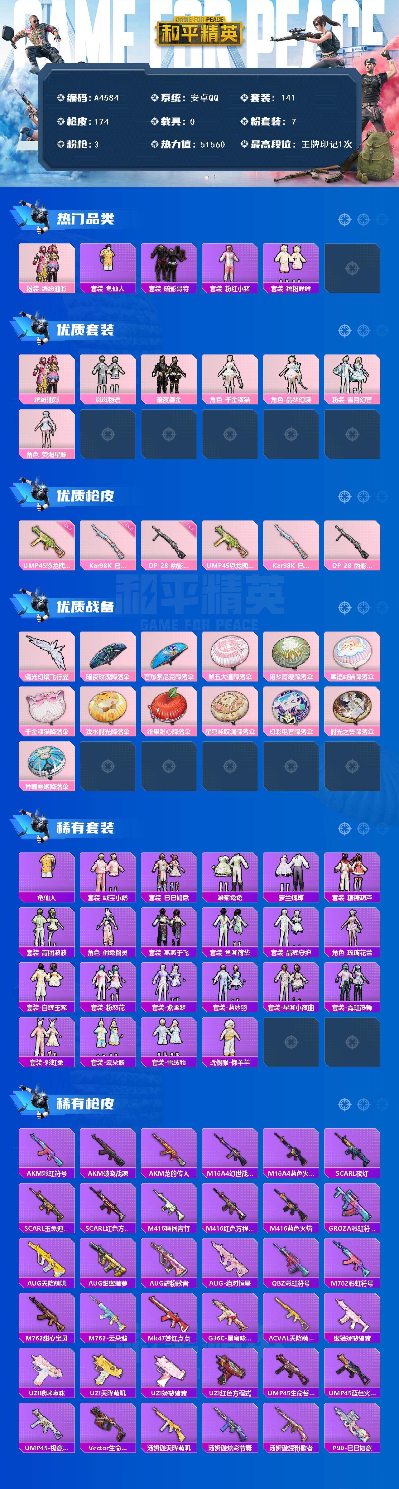 [15971946]安卓 【男神号 缤纷油彩/龟仙人/暗影哥特/ump45-恐龙拽拽七级】手q-7粉装-3特效呛-0载具-2粉色飞行器-51560热力值-1王牌印记-141套装-174呛皮 【热门品类】:粉装-缤纷油彩,套装-龟仙人,套装-暗影哥特,套装-粉红小猪,套装-糯粉咩咩 【粉色套装】:粉装-缤纷油彩,粉装-岚岚物语,粉装-暗夜鎏金,角色-千金淑猫,角色-晶梦幻蝶,粉装-雪月幻音,角色-荧海星豚 【粉色呛皮等级】:ump45-恐龙拽拽七级,kar98k-巳巳如意五级,dp-28-豹影疾电五级 【粉色呛皮】:ump45-恐龙拽拽,kar98k-巳巳如意,dp-28-豹影疾电 【粉色飞行器】:镜光幻境飞行翼 【粉色降落伞】:暗夜玫瑰降落伞,音爆索尼克降落伞,第五大道降落伞,闲梦青缨降落伞,蜜语绒猫降落伞,千金淑猫降落伞,戏水时光降落伞,绯果甜心降落伞,星穹咏叹调降落伞,幻彩电音降落伞,时光之誓降落伞,异瞳寒姬降落伞,炫彩糖果降落伞 【稀有套装】:套装-龟仙人,套装-绒宝小鹅,套装-巳巳如意,套装-雪国风尚,套装-炫彩糖果,套装-雏菊兔兔,套装-萝兰蝴蝶,套装-糖糖葫芦,套装-青团波波,角色-俏兔智灵,套装-燕燕于飞,套装-鱼渊荷华,套装-晶辉守护,角色-琉璃花蕾,套装-白辉玉蕊,套装-粉恋花,套装-紫幽梦,套装-蓝冰羽,套装-星渊小夜曲,套装-霓虹热舞,套装-彩虹兔,套装-云朵鹅,套装-雪绒豹,玩偶服-懒羊羊 【稀有呛皮】:aug-冰晶雪宝,akm-彩虹符号,akm-破晓战魂,akm-龙的传人,m16a4-幻世战舞者,m16a4-蓝色火焰,scar-l-夜灯,scar-l-玉兔迎春,scar-l-红色方程式,m416-糯团青竹,m416-红色方程式,m416-蓝色火焰,groza-彩虹符号,aug-天降萌叽,aug-甜蜜菠萝,aug-耀粉歌者,aug-绝对恒星,q-彩虹符号,m762-彩虹符号,m762-甜心宝贝,m762-云朵鹅,mk47-妙红点点,g36c-星穹咏叹调,ac-val-天降萌叽,蜜獾-娇憨猪猪,uzi-啾咪啾咪,uzi-天降萌叽,uzi-娇憨猪猪,uzi-红色方程式,ump45-生命誓言,ump45-蓝色火焰,ump45-极意拳锋,vect-生命誓言,汤姆逊-天降萌叽,汤姆逊-炫彩节奏,汤姆逊-耀粉歌者,p90-巳巳如意,kar98k-彩
