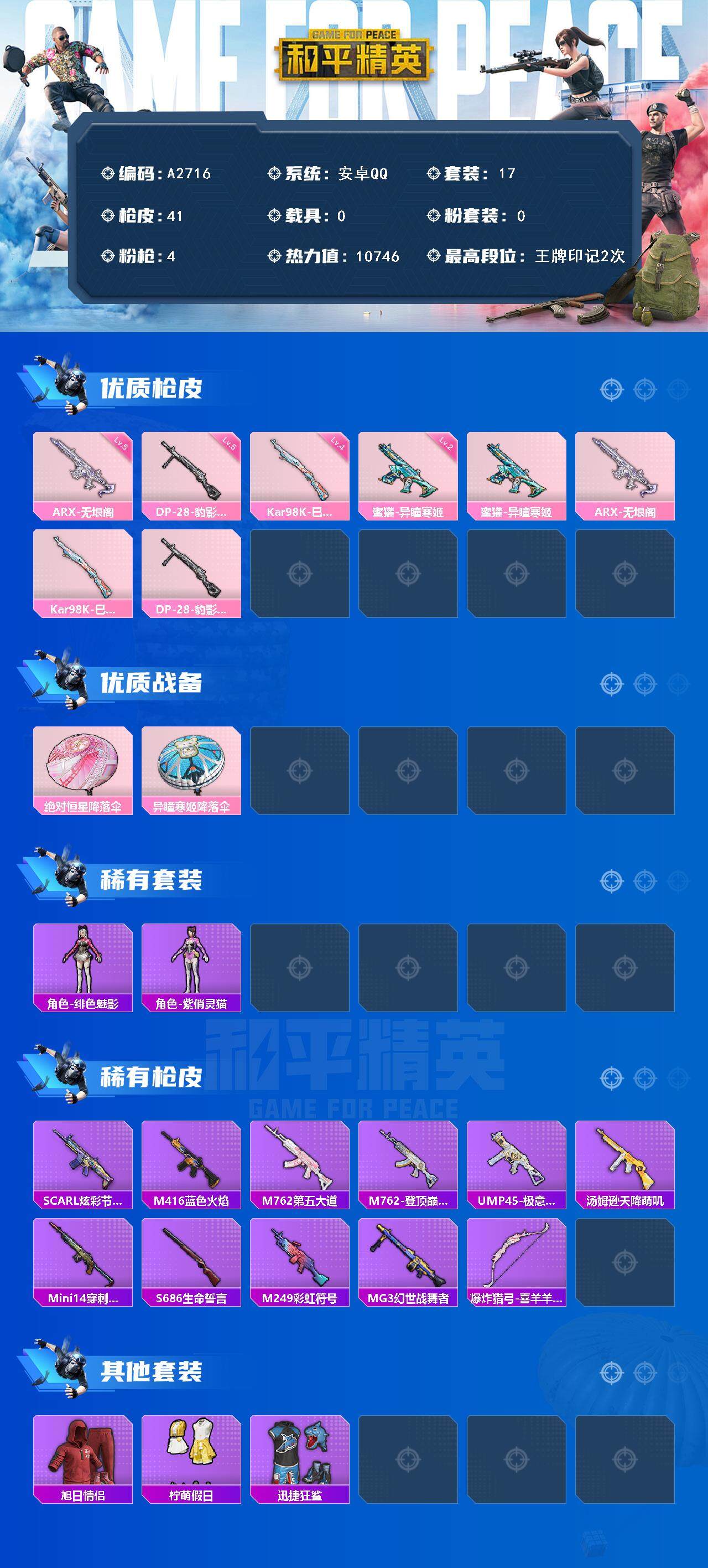 [15972194]安卓 【小号】手q-0粉装-4特效呛-0载具-1粉色飞行器-10746热力值-2王牌印记-17套装-41呛皮 【粉色呛皮等级】:蜜獾-异瞳寒姬二级,arx-无垠阁五级,kar98k-巳巳如意四级,dp-28-豹影疾电五级 【粉色呛皮】:蜜獾-异瞳寒姬,arx-无垠阁,kar98k-巳巳如意,dp-28-豹影疾电 【粉色降落伞】:绝对恒星降落伞,异瞳寒姬降落伞,炫彩糖果降落伞 【稀有套装】:套装-雪国风尚,角色-绯色魅影,角色-紫俏灵猫,套装-炫彩糖果 【稀有呛皮】:aug-冰晶雪宝,scar-l-炫彩节奏,m416-蓝色火焰,m762-第五大道,m762-登顶巅峰,ump45-极意拳锋,汤姆逊-天降萌叽,mini14-穿刺龙虾,s686-生命誓言,m249-彩虹符号,mg3-幻世战舞者,爆炸猎弓-喜羊羊与灰太狼 【其他套装】:套装-旭日情侣,套装-柠萌假日,套装-迅捷狂鲨 【营地id】:1025935850